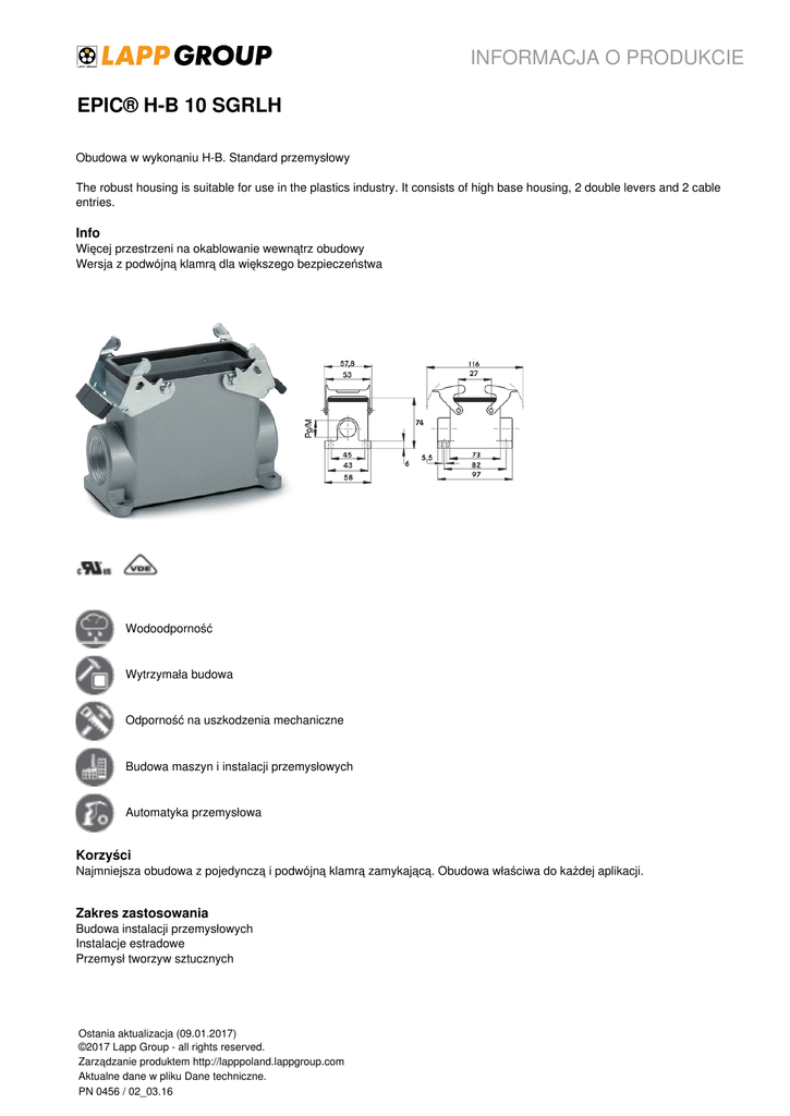 INFORMACJA O PRODUKCIE EPIC® H-B 10 SGRLH Obudowa w wykonaniu H-B. Standard przemysłowy The robust housing is suitable for use in the plastics industry. It consists of high base housing, 2 double levers and 2 cable entries. Info Więcej przestrzeni na okablowanie wewnątrz obudowy Wersja z podwójną klamrą dla większego bezpieczeństwa Wodoodporność Wytrzymała budowa Odporność na uszkodzenia mechaniczne Budowa maszyn i instalacji przemysłowych Automatyka przemysłowa Korzyści Najmniejsza obudowa z pojedynczą i podwójną klamrą zamykającą. Obudowa właściwa do każdej aplikacji. Zakres zastosowania Budowa instalacji przemysłowych Instalacje estradowe Przemysł tworzyw sztucznych Ostania aktualizacja (09.01.2017) ©2017 Lapp Group - all rights reserved. Zarządzanie produktem http://lapppoland.lappgroup.com Aktualne dane w pliku Dane techniczne. PN 0456 / 02_03.16 INFORMACJA O PRODUKCIE EPIC® H-B 10 SGRLH Cechy produktu Obudowa gniazda cokołowa, wersja wysoka Klamra podwójna 2 wejścia kablowe Dane techniczne Klasyfikacja: ETIM 5.0 Class-ID: EC000437 Opis klasy ETIM 5.0: Obudowy do złączy przemysłowych Materiał: Obudowa: aluminium malowane proszkowo, szara Klamra: stal ocynkowana Uszczelnienie: NBR Stopień ochrony: IP 65 (zamknięte) NEMA 250, UL50E: 12, 4 (zamknięte) Testowany przez VDE: Certyfikowana kontrola produkcji: Nr ewid. VDE: B437 Testowane wg UL: Nr pliku UL: E75770 Zakres temperatury: -40°C do +100°C, krótkotrwale do +125°C Wskazówka Fotografie nie mogą być używane do wymiarowania oraz nie stanowią szczegółowego odwzorowania przedstawionych produktów. * Podane ceny to ceny netto bez podatku VAT i dodatkowych opłat. Sprzedaż klientom biznesowym. Ostania aktualizacja (09.01.2017) ©2017 Lapp Group - all rights reserved. Zarządzanie produktem http://lapppoland.lappgroup.com Aktualne dane w pliku Dane techniczne. PN 0456 / 02_03.16 Powered by TCPDF (www.tcpdf.org) PG B B1 B2 B3 B4 d H H1 L L1 L3 L4 s Obudowa H-B: obudowa gniazda cokołowa (2 wejścia kablowe, klamra podwójna, typ wysoki) 70036200 H-B 10 SGRLH 21 21 43 57,8 53 45 58 5,5 74 6 73 27 82 97 116 70036400 H-B 10 SGRLH 29 29 43 57,8 53 45 58 5,5 74 6 73 27 82 97 116 79036200 H-B 10 SGRLH M25 25 43 57,8 53 45 58 5,5 74 6 73 27 82 97 116 79036400 H-B 10 SGRLH M32 32 43 57,8 53 45 58 5,5 74 6 73 27 82 97 116 EPIC® H-B 10 SGRLH Ostania aktualizacja (09.01.2017) ©2017 Lapp Group - all rights reserved. Zarządzanie produktem http://lapppoland.lappgroup.com Aktualne dane w pliku Dane techniczne. PN 0456 / 02_03.16 INFORMACJA O PRODUKCIE Powered by TCPDF (www.tcpdf.org) Numer ka Opis talogowy produktu