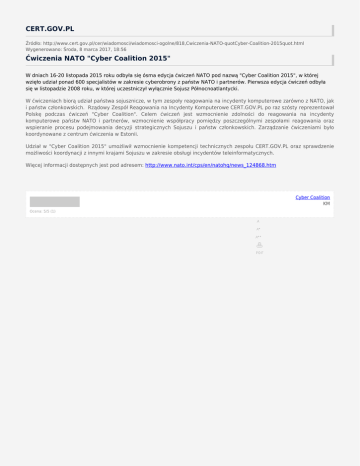 CERT.GOV.PL Źródło: http://www.cert.gov.pl/cer/wiadomosci/wiadomosci-ogolne/818,Cwiczenia-NATO-quotCyber-Coalition-2015quot.html Wygenerowano: Środa, 8 marca 2017, 18:56 Ćwiczenia NATO "Cyber Coalition 2015" W dniach 16-20 listopada 2015 roku odbyła się ósma edycja ćwiczeń NATO pod nazwą "Cyber Coalition 2015", w której wzięło udział ponad 600 specjalistów w zakresie cyberobrony z państw NATO i partnerów. Pierwsza edycja ćwiczeń odbyła się w listopadzie 2008 roku, w której uczestniczył wyłącznie Sojusz Północnoatlantycki. W ćwiczeniach biorą udział państwa sojusznicze, w tym zespoły reagowania na incydenty komputerowe zarówno z NATO, jak i państw członkowskich. Rządowy Zespół Reagowania na Incydenty Komputerowe CERT.GOV.PL po raz szósty reprezentował Polskę podczas ćwiczeń "Cyber Coalition". Celem ćwiczeń jest wzmocnienie zdolności do reagowania na incydenty komputerowe państw NATO i partnerów, wzmocnienie współpracy pomiędzy poszczególnymi zespołami reagowania oraz wspieranie procesu podejmowania decyzji strategicznych Sojuszu i państw członkowskich. Zarządzanie ćwiczeniami było koordynowane z centrum ćwiczenia w Estonii. Udział w "Cyber Coalition 2015" umożliwił wzmocnienie kompetencji technicznych zespołu CERT.GOV.PL oraz sprawdzenie możliwości koordynacji z innymi krajami Sojuszu w zakresie obsługi incydentów teleinformatycznych. Więcej informacji dostępnych jest pod adresem: http://www.nato.int/cps/en/natohq/news_124868.htm Cyber Coalition KM Ocena: 5/5 (1)
