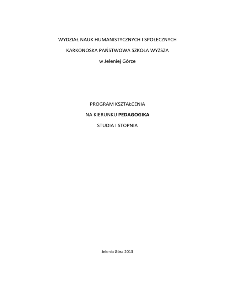 WYDZIAŁ NAUK HUMANISTYCZNYCH I SPOŁECZNYCH KARKONOSKA PAŃSTWOWA SZKOŁA WYŻSZA w Jeleniej Górze PROGRAM KSZTAŁCENIA NA KIERUNKU PEDAGOGIKA STUDIA I STOPNIA Jelenia Góra 2013 I. OGÓLNA CHARAKTERYSTYKA PROWADZONYCH STUDIÓW Nazwa kierunku: pedagogika Poziom kształcenia: studia pierwszego stopnia Profil kształcenia: praktyczny Forma studiów: stacjonarne, niestacjonarne Tytuł zawodowy uzyskiwany przez absolwenta: licencjat Przyporządkowanie do obszaru lub obszarów kształcenia: nauki społeczne i nauki humanistyczne Wskazanie dziedzin (nauki lub sztuki) i dyscyplin (naukowych lub artystycznych), do których odnoszą się efekty kształcenia: dziedzina nauk społecznych, 1. dyscyplina pedagogika Wskazanie związku z misją uczelni i jej strategią rozwoju: Zgodnie ze Statutem Karkonoskiej Państwowej Szkoły Wyższej podstawowymi kierunkami działalności są: , kształcenie studentów oraz upowszechnianie i pomnażanie osiągnięć nauki, techniki i kultury. Uczelnia dochowuje wierności tradycji i zwyczajom akademickim, czerpie z nich w sytuacjach nieuregulowanych prawnie, a swoje cele i zadania wypełnia z poszanowaniem ludzkiej godności. Proces edukacyjny w KPSW jest organizowany z poszanowaniem zasady spójności kształcenia i badań naukowych oraz prawa studiujących do swobodnego rozwijania ich zamiłowań i indywidualnych uzdolnień. KPSW jest uczelnią otwartą zarówno na najnowsze osiągnięcia naukowe i techniczne, jak i na zapotrzebowanie społeczne dotyczące usług edukacyjnych realizowanych w duchu służby na rzecz dobra wspólnego z uwzględnieniem szczególnych potrzeb edukacyjnych młodzieży niepełnosprawnej. Do zadań edukacyjnych Wydziału, obok kształcenia studentów, należy również kształcenie ustawiczne prowadzone zarówno w formie studiów podyplomowych jak i w formie cyklicznych wykładów i seminariów popularyzujących najnowsze osiągnięcia nauki i techniki. Kształcenie kadry naukowej Wydział prowadzi poprzez systemy seminariów naukowych. Program kształcenia na kierunku pedagogika nawiązuje do misji i strategii Uczelni oraz Wydziału. 2 Główne cele misji to: – gwarantowanie systematycznego wzrostu poziomu jakości świadczonych usług edukacyjnych dla studentów i otoczenia zewnętrznego, – kształtowanie wysoko wykwalifikowanych specjalistów z zakresu pedagogiki, filologii, dziennikarstwa, bezpieczeństwa wewnętrznego i pracy socjalnej, poszukiwanych na rynku pracy, – dysponowanie nowoczesnym zapleczem dydaktycznym, – bycie znaczącym ośrodkiem dydaktyczno – naukowym dla regionu. Program jest opracowany zgodnie z zaleceniami wynikającymi z udziału Uczelni w Europejskim Obszarze Szkolnictwa Wyższego oraz wewnętrznych aktów prawnych Uczelni. 2. Ogólne cele kształcenia oraz możliwości zatrudnienia i kontynuacji kształcenia przez absolwentów: Celem kształcenia jest przygotowanie absolwentów do wykonywania zawodu pedagoga poprzez wyposażenie go w kompetencje niezbędne do pracy z ludźmi w różnych środowiskach społecznych, edukacyjnych, wychowawczych czy opiekuńczych. Absolwent uzyskuje kwalifikacje zależne od wybranej specjalności. Jest przygotowany do pracy w: szkolnictwie (po ukończeniu specjalności nauczycielskiej – zgodnie ze standardami kształcenia przygotowującego do wykonywania zawodu nauczyciela1) oraz w placówkach opiekuńczo-wychowawczych i resocjalizacyjnych. Kształcenia na studiach pierwszego stopnia prowadzi do uzyskania kwalifikacji niezbędnych do kontynuowania nauki, w obszarze nauk humanistycznych lub społecznych, na studiach drugiego stopnia. Ukończenie wybranej przez studenta specjalności poszerza jego kompetencje zawodowe.2 W zależności od wybranej specjalności absolwent posiada poszerzoną wiedzę i umiejętności praktyczne w zakresie: pedagogiki opiekuńczo-wychowawczej i resocjalizacyjnej oraz pedagogiki wczesnoszkolnej i przedszkolnej. • Pedagogika wczesnoszkolna i przedszkolna Absolwent tej specjalności w toku kształcenia otrzymuje rzetelne przygotowanie do pracy nauczycielskiej w zakresie edukacji wczesnoszkolnej i przedszkolnej. Posiada wiedzę i umiejętności z zakresu metodyki prowadzenia zajęć przedszkolnych i wczesnoszkolnych. Absolwent tej specjalności uzyskuje kwalifikacje nauczycielskie i może podjąć pracę w szkołach podstawowych w klasach I-III, w przedszkolach oraz w placówkach opieki dla dzieci do lat 3. 1 Rozp. MNiSW z dnia 17 stycznia 2012 roku, w sprawie standardów kształcenia przygotowującego do wykonywania zawodu nauczyciela 2 Poniższe opisy przygotowania zawodowego w ramach poszczególnych specjalności nie są równoważne z uprawnieniami do wykonywania zawodu, które określają ustawy branżowe 3 Studia pierwszego stopnia przygotowują także do analizy rzeczywistości pedagogicznej, w wybranym zakresie i są niezbędne do podjęcia studiów drugiego stopnia, w toku których student pogłębia wiedzę pedagogiczno-psychologiczną oraz przygotowuje się do prowadzenia badań naukowych • Pedagogika opiekuńczo-wychowawcza i resocjalizacyjna Absolwent tej specjalności jest wyposażony w wiedzę i umiejętności w zakresie pracy opiekuńczowychowawczej w szeroko rozumianym środowisku społecznym oraz do pracy profilaktycznej z dziećmi i młodzieżą. Łączenie wiedzy psychologicznej i pedagogicznej z aktywnością praktyczną, realizowaną w różnorodnych instytucjach opiekuńczo-wychowawczych i resocjalizacyjnych dla dzieci, oraz zajęciami warsztatowymi i terapeutycznymi wyposażają absolwenta w praktyczne umiejętności pracy z dziećmi zagrożonymi niedostosowaniem społecznym, niedostosowanymi oraz z dziećmi i młodzieżą o szczególnych potrzebach edukacyjnych. Absolwent specjalności jest przygotowany do diagnozowania zaburzeń w podstawowym zakresie oraz podejmowania działalności terapeutycznej. Odznacza się wrażliwością społeczną, empatią i tolerancją. W efekcie kształcenia absolwent studiów 3-letn