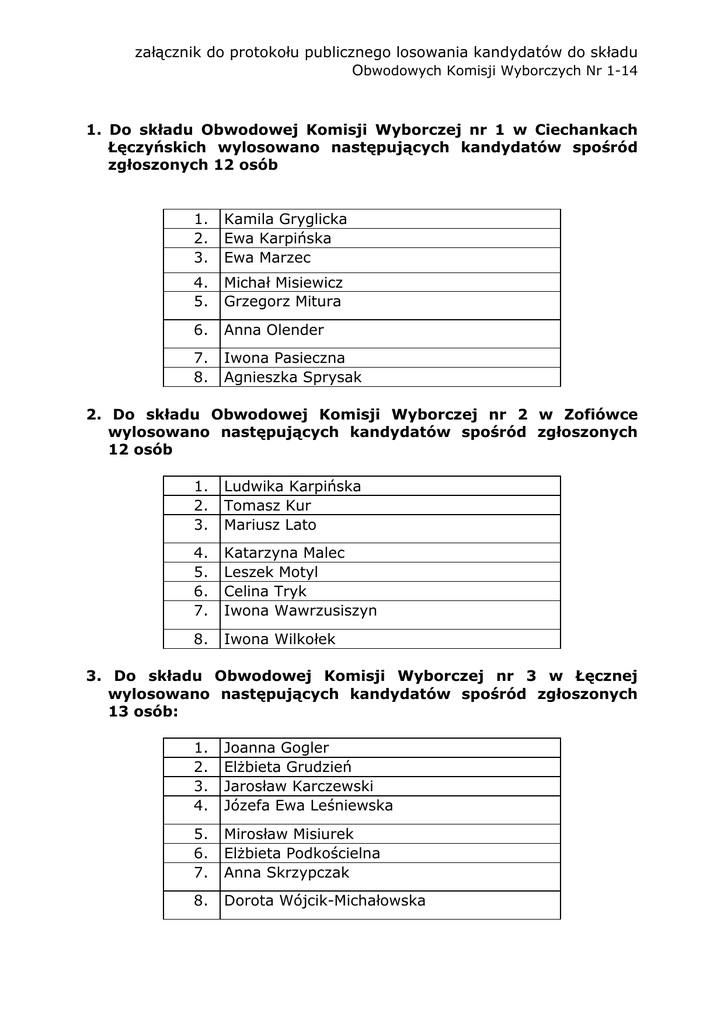 załącznik do protokołu publicznego losowania kandydatów do składu Obwodowych Komisji Wyborczych Nr 1-14 1. Do składu Obwodowej Komisji Wyborczej nr 1 w Ciechankach Łęczyńskich wylosowano następujących kandydatów spośród zgłoszonych 12 osób 1. 2. 3. Kamila Gryglicka Ewa Karpińska Ewa Marzec 4. 5. Michał Misiewicz Grzegorz Mitura 6. Anna Olender 7. 8. Iwona Pasieczna Agnieszka Sprysak 2. Do składu Obwodowej Komisji Wyborczej nr 2 w Zofiówce wylosowano następujących kandydatów spośród zgłoszonych 12 osób 1. 2. 3. Ludwika Karpińska Tomasz Kur Mariusz Lato 4. 5. 6. 7. Katarzyna Malec Leszek Motyl Celina Tryk Iwona Wawrzusiszyn 8. Iwona Wilkołek 3. Do składu Obwodowej Komisji Wyborczej nr 3 w Łęcznej wylosowano następujących kandydatów spośród zgłoszonych 13 osób: 1. 2. 3. 4. Joanna Gogler ElŜbieta Grudzień Jarosław Karczewski Józefa Ewa Leśniewska 5. 6. 7. Mirosław Misiurek ElŜbieta Podkościelna Anna Skrzypczak 8. Dorota Wójcik-Michałowska załącznik do protokołu publicznego losowania kandydatów do składu Obwodowych Komisji Wyborczych Nr 1-14 4. Do składu Obwodowej Komisji Wyborczej nr 4 w Łęcznej wylosowano następujących kandydatów spośród zgłoszonych 13 osób: 1. Jerzy Bednarski 2. Teresa Futa 3. 4. 5. Halina Sadło Mariusz Sierpiński Monika Szostakiewicz 6. 7. 8. Jadwiga Tabor Jacek Tatarczak Marzena Wronisz 5. Do składu Obwodowej Komisji Wyborczej nr 5 w Łęcznej wylosowano następujących kandydatów spośród zgłoszonych 13 osób: 1. 2. 3. 4. Ewa Arciszewska Przemysław Kozicki Malwina Kramek Dorota Kubicka 5. Stanisława Lipko 6. 7. 8. Rafał Mulsson Marian Pietrzycki Janina Zielińska 6. Do składu Obwodowej Komisji Wyborczej nr 6 w Łęcznej wylosowano następujących kandydatów spośród zgłoszonych 13 osób: 1. 2. 3. 4. 5. Edyta Arciszewska Justyna Cytawa Michał Czajkowski ElŜbieta Krasuska Marta Lipińska 6. 7. 8. Joanna Madejska Anna Rybak Małgorzata Ziarkiewicz załącznik do protokołu publicznego losowania kandydatów do składu Obwodowych Komisji Wyborczych Nr 1-14 7. Do składu Obwodowej Komisji Wyborczej nr 7 w Łęcznej wylosowano następujących kandydatów spośród zgłoszonych 13 osób: 1. Mateusz Futa 2. 3. Zuzanna Kapitan Maria Keller 4. 5. 6. 7. 8. Edyta Kochaniec Kinga Krasuska Tomasz Misiewicz Jolanta Oleszek Urszula Wójcik 8. Do składu Obwodowej Komisji Wyborczej nr 8 w Łęcznej wylosowano następujących kandydatów spośród zgłoszonych 12 osób: 1. 2. 3. 4. Barbara Jakubowska Edyta Magdalena Karwacka Marta Kłoda Jan Kozłowski 5. 6. Daniel Pawelec Józef Paź 7. 8. Wioleta Stachańska Edyta Walkowska 9. Do składu Obwodowej Komisji Wyborczej nr 9 w Łęcznej wylosowano następujących kandydatów spośród zgłoszonych 13 osób: 1. 2. 3. śaneta Bernat Joanna Bieńczak Wioletta BoŜena Grzegorczyk 4. GraŜyna Kłos 5. 6. 7. 8. Barbara Lenart Artur Łuszczewski Urszula Miszczak Ewa Szyszka załącznik do protokołu publicznego losowania kandydatów do składu Obwodowych Komisji Wyborczych Nr 1-14 10. Do składu Obwodowej Komisji Wyborczej nr 10 w Łęcznej wylosowano następujących kandydatów spośród zgłoszonych 11 osób: 1. Agata Aleksandrowicz 2. 3. 4. 5. 6. 7. 8. Krystyna Baran Teresa BoŜena Boczek Marek Cichosz BoŜena Galewska Aneta Rudzka ElŜbieta Zakaszewska Krystyna Ziółkowska 11. Do składu Obwodowej Komisji Wyborczej nr 11 w Łęcznej wylosowano następujących kandydatów spośród zgłoszonych 11 osób: 1. 2. 3. Łukasz Boczek Jadwiga Grosiak Barbara Ewa Jawiarczyk 4. 5. Ewelina Kawalec Jacek Mazurkiewicz 6. 7. 8. Marzena Olędzka Dorota Stec Katarzyna Świrk 12. Do składu Obwodowej Komisji Wyborczej nr 12 w Łęcznej wylosowano następujących kandydatów spośród zgłoszonych 12 osób: 1. Zofia Brzozowska 2. 3. 4. 5. 6. 7. 8. Aneta Karwacka Michał Kasprzak Barbara Sobel Anita Szostakiewicz Janina Szymanek Anna Wilkołek Magdalena Włodarska załącznik do protokołu publicznego losowania kandydatów do składu Obwodowych Komisji Wyborczych Nr 1-14 13. Do składu Obwodowej Komisji Wyborczej nr 13 w Łęcznej wylosowano następujących kandydatów spośród zgłoszonych 11 osób: 1. 2. 3. 4. 5. 6. 7. Marlena Boczek Jolanta Grzegorczyk Krystyna Pomorska Ewelina Samorańska Sylwia Seroka Lucyna Siegieda Maria Włodarska 8. BoŜena Włodek 14. Do składu Obwodowej Komisji Wyborczej nr 14 w Łęcznej wylosowano następujących kandydatów spośród zgłoszonych 10 osób: 1. 2. 3. Barbara Biernacka Renata Kozak Rafał Małek 4. 5. 6. Piotr Panasiewicz Halina Pańkowska Damian Pomorski 7. 8. Agnieszka Skoniecka Anna Włodarska