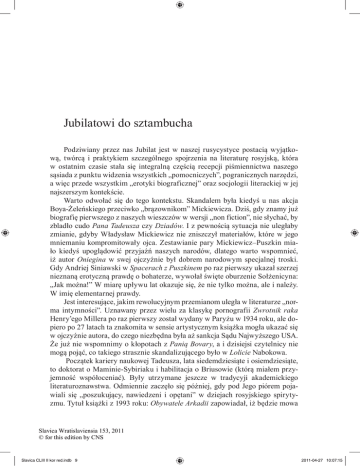 Jubilatowi do sztambucha Podziwiany przez nas Jubilat jest w naszej rusycystyce postacią wyjątkową, twórcą i praktykiem szczególnego spojrzenia na literaturę rosyjską, która w ostatnim czasie stała się integralną częścią recepcji piśmiennictwa naszego sąsiada z punktu widzenia wszystkich „pomocniczych”, pogranicznych narzędzi, a więc przede wszystkim „erotyki biograficznej” oraz socjologii literackiej w jej najszerszym kontekście. Warto odwołać się do tego kontekstu. Skandalem była kiedyś u nas akcja Boya-Żeleńskiego przeciwko „brązownikom” Mickiewicza. Dziś, gdy znamy już biografię pierwszego z naszych wieszczów w wersji „non fiction”, nie słychać, by zbladło cudo Pana Tadeusza czy Dziadów. I z pewnością sytuacja nie uległaby zmianie, gdyby Władysław Mickiewicz nie zniszczył materiałów, które w jego mniemaniu kompromitowały ojca. Zestawianie pary Mickiewicz–Puszkin miało kiedyś upoglądowić przyjaźń naszych narodów, dlatego warto wspomnieć, iż autor Oniegina w swej ojczyźnie był dobrem narodowym specjalnej troski. Gdy Andriej Siniawski w Spacerach z Puszkinem po raz pierwszy ukazał szerzej nieznaną erotyczną prawdę o bohaterze, wywołał święte oburzenie Sołżenicyna: „Jak można!” W miarę upływu lat okazuje się, że nie tylko można, ale i należy. W imię elementarnej prawdy. Jest interesujące, jakim rewolucyjnym przemianom uległa w literaturze „norma intymności”. Uznawany przez wielu za klasykę pornografii Zwrotnik raka Henry’ego Millera po raz pierwszy został wydany w Paryżu w 1934 roku, ale dopiero po 27 latach ta znakomita w sensie artystycznym książka mogła ukazać się w ojczyźnie autora, do czego niezbędna była aż sankcja Sądu Najwyższego USA. Że już nie wspomnimy o kłopotach z Panią Bovary, a i dzisiejsi czytelnicy nie mogą pojąć, co takiego strasznie skandalizującego było w Lolicie Nabokowa. Początek kariery naukowej Tadeusza, lata siedemdziesiąte i osiemdziesiąte, to doktorat o Maminie-Sybiriaku i habilitacja o Briusowie (którą miałem przyjemność współoceniać). Były utrzymane jeszcze w tradycyji akademickiego literaturoznawstwa. Odmiennie zaczęło się później, gdy pod Jego piórem pojawiali się „poszukujący, nawiedzeni i opętani” w dziejach rosyjskiego spirytyzmu. Tytuł książki z 1993 roku: Obywatele Arkadii zapowiadał, iż będzie mowa Slavica Wratislaviensia 153, 2011 © for this edition by CNS Slavica CLIII II kor red.indb 9 2011-04-27 10:07:15 10 • Jubilatowi do sztambucha o najbardziej sielankowym okresie w życiu pisarzy rosyjskich, oczywiście latach spełnionego marzenia ludzkości od Wielkiego Października 1917 roku. Przewrotność arkadyjskiego tytułu w pewnym sensie wytycza też przewrotny charakter dalszej drogi twórczej Autora. Przejściową jej postacią jest настольная книга polskich rusycystów, wykładowców i studentów („Новый мир” uznał ją kiedyś za godną przekładu na rosyjski) Przewodnik po współczesnej literaturze rosyjskiej i jej okolicach (1917–1996), systematyczny wykład wiedzy o faktach literackich zaistniałych w podanym okresie. Poza tym to znakomity bank informacji. Równie ważne w tej pionierskiej pracy, oprócz haseł osobowych, są „okolice” literatury, hasła rzeczowe, jak Alkohol, Czeka, wręcz sensacyjny Mecenas, dalej Moda, Nekrologi, Pseudonimy, Samizdat, Seks. Rezultat rzadkiej erudycji i ambicji traktowania fenomenu literatury w jej socjologicznym kontekście. „To się czyta” — taką lapidarną opinię nieraz słyszałem od użytkowników tego dzieła. I wreszcie o książce z 2005 roku, której pośrednio dotyczą wstępne akapity mojej wypowiedzi: Pożar serca. 16 smutnych esejów o miłości, o pisarzach rosyjskich i ich muzach. Otóż należę do najstarszego pokolenia rusycystów polskich nieźle przygotowanego do recepcji takich książek i o takiej literaturze rosyjskiej oraz jej pisarzach. Jeszcze podczas studiów pochłaniałem w paksowskim tygodniku „Kierunki” eseje Stanisława Mackiewicza (Cata, starszego brata Józefa) na temat pisarzy rosyjskich (Puszkina, Dostojewskiego i innych), pisane w radykalnie odmiennej poetyce aniżeli wiedza, którą wtedy otrzymywałem. Od Cata dowiedziałem się, że istota sporu między słowianofilami i okcydentalistami polegała w dużym stopniu na rywalizacji dwóch trójkątów małżeńskich, po raz pierwszy też przeczytałem, iż Aleksander Sergiejewicz ciągle zapadał na pewną — horribile dictu! — wstydliwą chorobę. Rozczytywałem się też wtedy w książkach zapomnianego dzisiaj językoznawcy Wiktora Winogradowa, któremu zawdzięczam wiedzę o tym, że Puszkin to klasyczny wolterianin, szyderczy kpiarz i sceptyk. Trudno mi więc było uwierzyć w szczerość jego genialnego liryku skierowanego do Madame Kern. I bez specjalnego zaskoczenia przeczytałem, co o „babilońskiej nierządnicy” pisał do Siergieja Sobolewskiego. Tak więc Pożar serca… przyjąłem w miarę zdemoralizowany, by nie czuć się zgorszony wiedzą, jaką Tadeusz odkrywa o szesnastu klasykach literatury rosyjskiej i ich partnerkach czy partnerach. Ale nie zmienia to faktu, iż była to lektura fascynująca, poruszająca, zabawna. Autor zaprezentował tu znów wyjątkową erudycję, będącą rezultatem równie wyjątkowego wysiłku oraz uroku swego błyskotliwego pióra. I, last but not least, wdzięku, dystansu do omawianych zdarzeń i osób, zabawy, bo to, że „on się bawi”, słyszałem od wielu czytelników Pożaru serca… Na mnie wrażenie największe zrobił znakomicie napisany esej o Cwietajewej. To chyba klasyczny przykład tragedii antycznej, czyli nierozstrzygalnego konfliktu między wybitną jednostką a siłami wyższymi. Tą grecką mojrą, ślepym fatum jest tu płeć. „Płeć w życiu ludzi — pisze Marina Iwanowna — to katastrofa”. Szczególnie w takim kontraście między wyb
