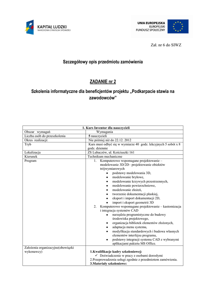 Zał. nr 6 do SIWZ Szczegółowy opis przedmiotu zamówienia ZADANIE nr 2 Szkolenia informatyczne dla beneficjentów projektu „Podkarpacie stawia na zawodowców” Obszar wymagań Liczba osób do przeszkolenia Okres realizacji: Tryb Lokalizacja Kierunek Program Założenia organizacyjne(obowiązki wykonawcy) 1. Kurs Inventor dla nauczycieli Wymagania 5 nauczycieli Nie później niż do 22.12. 2012 Kurs musi odbyć się w wymiarze 40 godz. lekcyjnych 5 sobót x 8 godz. dziennie ZS Lubaczów, ul. Kościuszki 161 Technikum mechaniczne 1. Komputerowo wspomagane projektowanie – modelowanie 3D/2D– projektowanie obiektów trójwymiarowych podstawy modelowania 3D, modelowanie bryłowe, modelowanie krzywych przestrzennych, modelowanie powierzchniowe, modelowanie złożeń, tworzenie dokumentacji płaskiej, eksport i import dokumentacji 2D, import i eksport geometrii 3D 2. Komputerowo wspomagane projektowanie – kastomizacja i integracja systemów CAD narzędzia programistyczne do budowy środowiska projektowego, organizacja bibliotek elementów złożonych, adaptacja menu systemu, modyfikacja standardowych i budowa własnych elementów interfejsu programu, podstawy integracji systemu CAD z wybranymi aplikacjami pakietu MS Office. 1.Kwalifikacje kadry szkoleniowej: Doświadczenie w pracy z osobami dorosłymi 2.Przeprowadzenia usługi zgodnie z przedmiotem zamówienia. 3.Materiały szkoleniowe: Materiały szkoleniowe w obejmujące tematykę szkolenia w ilości dla każdego uczestnika, pozwalające na samodzielną edukację z zakresu tematyki szkoleń (opracowania, wydruk materiałów szkoleniowych). materiały papiernicze (notatnik, skoroszyt, niebieski długopis) i inne środki dydaktyczne niezbędne do realizacji szkolenia. inne materiały szkoleniowe dla każdego uczestnika szkolenia obejmujących np: wydruki prezentacji i dodatkowych informacji Komplet materiałów z danej tematyki szkolenia powinien zostać rozdany Beneficjentom w pierwszym dniu zajęć za potwierdzeniem odbioru. Jeden komplet materiałów szkoleniowych w wersji papierowej Wykonawca przekazuje Zamawiającemu. Koszty opracowania, transportu i powielenia materiałów ponosi Wykonawca 4.Wykonawca przeprowadzi egzamin i wyda Certyfikat Autodesku o ukończeniu kursu zawierającego wykaz przedmiotów objętych szkoleniem z podaniem liczby godzin oznaczone odpowiednimi logami wymaganymi przy projektach realizowanych z POKL-u. Zaświadczenia powinny być wydane w formacie A-4 na papierze przeznaczonym do wydruku zaświadczeń. 5.Przeprowadzenie 2 ankiet wśród uczestników szkolenia oraz zestawieniem ich wraz z wynikami, 6.Nadzór nad szkoleniem. Wykonawca zobowiązany jest do: prowadzenia ciągłego nadzoru i kontroli merytorycznej nad realizacją usługi bieżącego informowania Zamawiającego o pojawiających się problemach w realizacji usługi wydruku i stosowania wzorów list obecności, list odbioru materiałów oraz list odbioru zaświadczeń przekazanych przez Zamawiającego oznaczenia sali oraz wszelkich materiałów szkoleniowych symbolami identyfikującymi projekty realizowane w ramach POKL-u. 7.Wykonawca zobowiązuje się do przekazania Zamawiającemu każdorazowo w terminie 7 dni po zakończeniu zajęć przez daną grupę szkoleniową kompletu dokumentacji(oryginałów list obecności, list odbioru materiałów szkoleniowych, list odbioru zaświadczeń, kserokopii wydanych zaświadczeń uczestnikom) 8.Wykonawca zobowiązuje się do wystawienia faktury z wyszczególnieniem liczby uczestników. Wynagrodzenie będzie płatne przelewem w terminie do 30 dni od daty otrzymania faktury przez Zamawiającego. W sytuacji rezygnacji Beneficjenta przed rozpoczęciem szkoleń kwota na tego Beneficjenta zostanie odjęta od kwoty zamówienia. Obszar wymagań Liczba osób do przeszkolenia Okres realizacji: Tryb Lokalizacja Kierunek Program 2.Kurs AutoCAD/Mechanikal dla nauczycieli Wymagania 5 nauczycieli Nie później niż do 23.12.2012 Kurs musi się odbyć w wymiarze 40 godzin lekcyjnych 5 niedziel x 8 godz. ZS Lubaczów , ul. Kościuszki 161 Technikum mechaniczne 1. Podstawy zapisu konstrukcji zapis konstrukcji, tworzenie dokumentacji płaskiej, wymiarowanie, tolerancje i pasowania, oznaczanie stanu powierzchni, uaktualnienia zasad zapisu i wymiarowania obiektów. 2. Komputerowo wspomagane projektowanie Modelowanie 2D– tworzenie dokumentacji dwuwymiarowej z zastosowaniem różnych systemów interfejs użytkownika, obiekty i polecenia rysunkowe, warstwy rysunkowe i modyfikacje, narzędzia i tryby rysunkowe, wymiarowanie obiektów i skalowanie rysunku, organizacja wydruków. 3. Komputerowo wspomagane projektowanie – modelowanie 3D– projektowanie obiektów trójwymiarowych filozofia pracy modelera 3D, tworzenie szkicu 2D, podstawowe operacje modelowania bryłowego i powierzchniowego, modyfikacja modeli bryłowych i powierzchniowych, wizualizacja modeli bryłowych, opcje renderingu, tworzenie sceny, pojęcie przestrzeni papieru, tworzenie i konfiguracja rzutni, praca z rzutniami Założenia organizacyjne(obowiązki wykonawcy) 1. Kwalifikacje kadry szkoleniowej: Doświadczenie w pracy z osobami dorosłymi 2. Przeprowadzenia usługi zgodnie z przedmiotem zamówienia. 3. Materiały szkoleniowe: Materiały szkoleniowe w ilości dla każdego uczestnika, pozwalających na samodzielną edukację z zakresu tematyki szkoleń (opracowania, wydruku materiałów szkoleniowych). materiały papiernicze (notatnik, skoroszyt, niebieski długopis) i inne środki dydaktyczne niezbędne do realizacji szkolenia. Komplet materiałów z danej tematyki szkolenia powinien zostać rozdany Beneficjentom w pierwszym dniu zajęć za potwierdzeniem odbioru. Jeden komplet materiałów szkoleniowych w wersji papierowej Wykonawca przekazuje Zamawiającemu. Koszty opracowania, transportu i powielenia materiałów ponosi Wykonawca 4. Wykonawca przeprowadzi egzamin i wyda certyfikat o ukończeniu kursu zawierającego wykaz przedmiotów objętych szkoleniem z