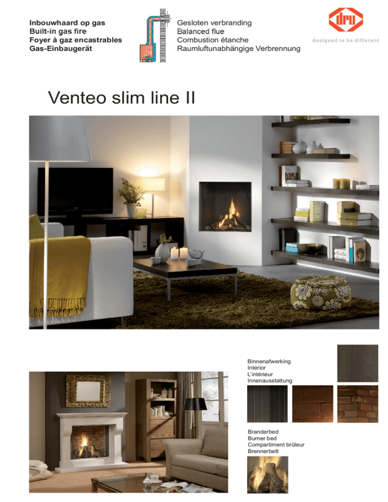 Inbouwhaard op gas Gesloten verbranding Foyer à gaz encastrables Gas-Einbaugerät Combustion étanche Raumluftunabhängige Verbrennung Venteo slim line II Binnenafwerking Interior L’intérieur Innenausstattung Branderbed Burner bed Compartiment brûleur Brennerbett Sfeerverwarming op gas Venteo slim line II Chauffage et ambiance à gaz Gas-Brennzellen und Kaminöfen Technische gegevens Brandstof Soort verbranding Netto vermogen (G25 / G31) Kanaalafmeting Inbouwdiepte Bedieningsluik Afstandsbediening Technical data aardgas gesloten verbranding 5,0 kW / 150/100 mm concentrisch 382 mm standaard meegeleverd RCE, met elektronische ontsteking, thermostatisch en klokfunctie Optische kenmerken Branderbed Binnenafwerking Frontkleuren Fuel Flue type Heat output (G20 / G31) Flue size Depth Control hatch Remote control natural gas 5.2 kW / 150/100 mm concentric 382 mm as standard RCE, with electronic ignition, thermostat and clock function Visual features keramische houtset n.v.t. steen classic Burner bed Interior Front/frame colours ceramic woodset applicable stone, classic stone Accessoires Accessories - Ventilatie-elementen Lux/-Omni/-Omni Vent/-Sleeve/-Lignum/-Fino - Verlichting voor Lux, Lux Omni, Lux Lignum, Lux Fino - Lichtmontageset voor Lux Lignum - Adapter voor RCE ontvanger - Concentrisch afvoermateriaal - Schouwen en plateaus (standaard en maatwerk) - Ventilation elements Lux/-Omni/-Omni Vent/-Sleeve/-Lignum/-Fino - Lighting for Lux, Lux Omni, Lux Lignum, Lux Fino - Light-mounting set for Lux Lignum - Adaptor for RCE receiver - Extension legs, set à 4 pcs.(L=438 mm) Technische Daten Combustible gaz naturel Type de combustion combustion étanche Puissance net (G20 / G31) 5,2 kW / Dimension de sortie des fumées 150/100 mm concentrique Profondeur d’encastrement 382 mm Trappe de commande standard Télécommande RCE, avec allumage électronique, thermostatique et fonction de réglage Compartiment brûleur L’intérieur Couleurs extérieures Optische Kennzeichnung bûches céramique pas d’application Brennstoff Art der Verbrennung Leistung (G20 / G31) Rohr Abmessung Einbautiefe Bedienungskasten Fernbedienung brique classic Brennerbett Innenausstattung Frontfarben Erdgas Raumluftunabhängige Verbrennung 5,2 kW / 150/100 mm konzentrisch 382 mm Standard RCE, mit elektronischer Zündung, Temperatur- und Zeitsteuerung Keramik Holzsatz Nicht anwendbar natur, Stein Klassisch Accessoires Zubehör - Elément de ventilation Lux/-Omni/-Omni Vent/-Sleeve/-Lignum/-Fino - Éclairage pour Lux, Lux Omni, Lux Lignum, Lux Fino - Jeu d’adapteurs pour Lux Lignum - Adaptor pour RCE Commande à distance - Matérial concentrique d’évacuation - Cheminées et plateaux (standard et sur mesure) - Ventilator Element Lux/-Omni/-Omni Vent/-Sleeve/-Lignum/-Fino - Licht Element für Lux, Lux Omni, Lux Lignum, Lux Fino - Lichtset für Lux Lignum - Adapter für RCE Empfänger - Konzentrisches Anschlußmaterial - Kaminumbauten und Plateaus (Standard und Maßarbeit) Afmetingen / Dimensions / Dimensions / Abmessungen (mm) DRU Verwarming B.V. Postbus 1021, 6920 BA Duiven Ratio 8, 6921 RW Duiven, Nederland Tel.: +31 (0)26 319 5 319 Fax: +31 (0)26 319 5 348 Drugasar Ltd. Deans Road, Swinton Manchester, M27, 0JH, United Kingdom Tel.: +44 (0)161 793 8700 Fax: +44 (0)161 727 8057 DRU Belgium Kontichsesteenweg 60 2630 Aartselaar, Belgium Tel.: +32 (0)3 450 7000 Fax: +32 (0)3 450 7009