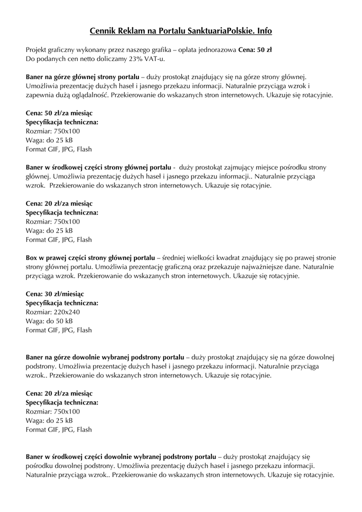 Cennik Reklam na Portalu SanktuariaPolskie. Info Projekt graficzny wykonany przez naszego grafika – opłata jednorazowa Cena: 50 zł Do podanych cen netto doliczamy 23% VAT-u. Baner na górze głównej strony portalu – duży prostokąt znajdujący się na górze strony głównej. Umożliwia prezentację dużych haseł i jasnego przekazu informacji. Naturalnie przyciąga wzrok i zapewnia dużą oglądalność. Przekierowanie do wskazanych stron internetowych. Ukazuje się rotacyjnie. Cena: 50 zł/za miesiąc Specyfikacja techniczna: Rozmiar: 750x100 Waga: do 25 kB Format GIF, JPG, Flash Baner w środkowej części strony głównej portalu - duży prostokąt zajmujący miejsce pośrodku strony głównej. Umożliwia prezentację dużych haseł i jasnego przekazu informacji.. Naturalnie przyciąga wzrok. Przekierowanie do wskazanych stron internetowych. Ukazuje się rotacyjnie. Cena: 20 zł/za miesiąc Specyfikacja techniczna: Rozmiar: 750x100 Waga: do 25 kB Format GIF, JPG, Flash Box w prawej części strony głównej portalu – średniej wielkości kwadrat znajdujący się po prawej stronie strony głównej portalu. Umożliwia prezentację graficzną oraz przekazuje najważniejsze dane. Naturalnie przyciąga wzrok. Przekierowanie do wskazanych stron internetowych. Ukazuje się rotacyjnie. Cena: 30 zł/miesiąc Specyfikacja techniczna: Rozmiar: 220x240 Waga: do 50 kB Format GIF, JPG, Flash Baner na górze dowolnie wybranej podstrony portalu – duży prostokąt znajdujący się na górze dowolnej podstrony. Umożliwia prezentację dużych haseł i jasnego przekazu informacji. Naturalnie przyciąga wzrok.. Przekierowanie do wskazanych stron internetowych. Ukazuje się rotacyjnie. Cena: 20 zł/za miesiąc Specyfikacja techniczna: Rozmiar: 750x100 Waga: do 25 kB Format GIF, JPG, Flash Baner w środkowej części dowolnie wybranej podstrony portalu – duży prostokąt znajdujący się pośrodku dowolnej podstrony. Umożliwia prezentację dużych haseł i jasnego przekazu informacji. Naturalnie przyciąga wzrok.. Przekierowanie do wskazanych stron internetowych. Ukazuje się rotacyjnie. Cena: 15 zł/za miesiąc Specyfikacja techniczna: Rozmiar: 750x100 Waga: do 25 kB Format GIF, JPG, Flash Box w prawej części dowolnej podstrony portalu – średniej wielkości kwadrat znajdujący się po prawej stronie dowolnej podstrony portalu. Umożliwia prezentację graficzną oraz przekazuje najważniejsze dane. Naturalnie przyciąga wzrok. Przekierowanie do wskazanych stron internetowych. Ukazuje się rotacyjnie. Cena: 15 zł/za miesiąc Specyfikacja techniczna: Rozmiar: 220x240 Waga: do 50 kB Format GIF, JPG, Flash Istnieje możliwość zablokowania rotacyjności lub łączenia miejsc reklamowych na zasadzie pakietów, a także ustalenia ewentualnych promocji indywidualnych przy zakupie reklam na dłuższy czasu. O szczegóły prosimy dowiadywać się za pośrednictwem maila – [email protected] lub drogą telefoniczną – 509 839 252