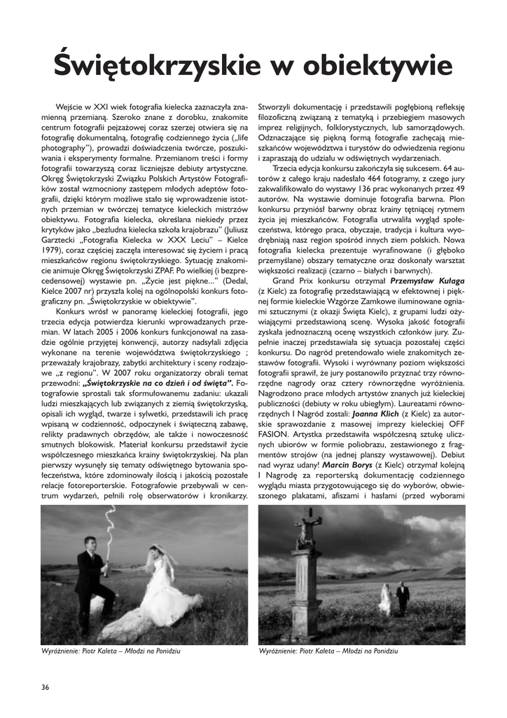 Œwiêtokrzyskie w obiektywie Wejœcie w XXI wiek fotografia kielecka zaznaczy³a znamienn¹ przemian¹. Szeroko znane z dorobku, znakomite centrum fotografii pejza¿owej coraz szerzej otwiera siê na fotografiê dokumentaln¹, fotografiê codziennego ¿ycia („life photography”), prowadzi doœwiadczenia twórcze, poszukiwania i eksperymenty formalne. Przemianom treœci i formy fotografii towarzysz¹ coraz liczniejsze debiuty artystyczne. Okrêg Œwiêtokrzyski Zwi¹zku Polskich Artystów Fotografików zosta³ wzmocniony zastêpem m³odych adeptów fotografii, dziêki którym mo¿liwe sta³o siê wprowadzenie istotnych przemian w twórczej tematyce kieleckich mistrzów obiektywu. Fotografia kielecka, okreœlana niekiedy przez krytyków jako „bezludna kielecka szko³a krajobrazu” (Juliusz Garztecki „Fotografia Kielecka w XXX Leciu” – Kielce 1979), coraz czêœciej zaczê³a interesowaæ siê ¿yciem i prac¹ mieszkañców regionu œwiêtokrzyskiego. Sytuacjê znakomicie animuje Okrêg Œwiêtokrzyski ZPAF. Po wielkiej (i bezprecedensowej) wystawie pn. „¯ycie jest piêkne...” (Dedal, Kielce 2007 nr) przysz³a kolej na ogólnopolski konkurs fotograficzny pn. „Œwiêtokrzyskie w obiektywie”. Konkurs wrós³ w panoramê kieleckiej fotografii, jego trzecia edycja potwierdza kierunki wprowadzanych przemian. W latach 2005 i 2006 konkurs funkcjonowa³ na zasadzie ogólnie przyjêtej konwencji, autorzy nadsy³ali zdjêcia wykonane na terenie województwa œwiêtokrzyskiego ; przewa¿a³y krajobrazy, zabytki architektury i sceny rodzajowe „z regionu”. W 2007 roku organizatorzy obrali temat przewodni: „Œwiêtokrzyskie na co dzieñ i od œwiêta”. Fotografowie sprostali tak sformu³owanemu zadaniu: ukazali ludzi mieszkaj¹cych lub zwi¹zanych z ziemi¹ œwiêtokrzysk¹, opisali ich wygl¹d, twarze i sylwetki, przedstawili ich pracê wpisan¹ w codziennoœæ, odpoczynek i œwi¹teczn¹ zabawê, relikty pradawnych obrzêdów, ale tak¿e i nowoczesnoœæ smutnych blokowisk. Materia³ konkursu przedstawi³ ¿ycie wspó³czesnego mieszkañca krainy œwiêtokrzyskiej. Na plan pierwszy wysunê³y siê tematy odœwiêtnego bytowania spo³eczeñstwa, które zdominowa³y iloœci¹ i jakoœci¹ pozosta³e relacje fotoreporterskie. Fotografowie przebywali w centrum wydarzeñ, pe³nili rolê obserwatorów i kronikarzy. Stworzyli dokumentacjê i przedstawili pog³êbion¹ refleksjê filozoficzn¹ zwi¹zan¹ z tematyk¹ i przebiegiem masowych imprez religijnych, folklorystycznych, lub samorz¹dowych. Odznaczaj¹ce siê piêkn¹ form¹ fotografie zachêcaj¹ mieszkañców województwa i turystów do odwiedzenia regionu i zapraszaj¹ do udzia³u w odœwiêtnych wydarzeniach. Trzecia edycja konkursu zakoñczy³a siê sukcesem. 64 autorów z ca³ego kraju nades³a³o 464 fotogramy, z czego jury zakwalifikowa³o do wystawy 136 prac wykonanych przez 49 autorów. Na wystawie dominuje fotografia barwna. Plon konkursu przyniós³ barwny obraz krainy têtni¹cej rytmem ¿ycia jej mieszkañców. Fotografia utrwali³a wygl¹d spo³eczeñstwa, którego praca, obyczaje, tradycja i kultura wyodrêbniaj¹ nasz region spoœród innych ziem polskich. Nowa fotografia kielecka prezentuje wyrafinowane (i g³êboko przemyœlane) obszary tematyczne oraz doskona³y warsztat wiêkszoœci realizacji (czarno – bia³ych i barwnych). Grand Prix konkursu otrzyma³ Przemys³aw Ku³aga (z Kielc) za fotografiê przedstawiaj¹c¹ w efektownej i piêknej formie kieleckie Wzgórze Zamkowe iluminowane ogniami sztucznymi (z okazji Œwiêta Kielc), z grupami ludzi o¿ywiaj¹cymi przedstawion¹ scenê. Wysoka jakoœæ fotografii zyska³a jednoznaczn¹ ocenê wszystkich cz³onków jury. Zupe³nie inaczej przedstawia³a siê sytuacja pozosta³ej czêœci konkursu. Do nagród pretendowa³o wiele znakomitych zestawów fotografii. Wysoki i wyrównany poziom wiêkszoœci fotografii sprawi³, ¿e jury postanowi³o przyznaæ trzy równorzêdne nagrody oraz cztery równorzêdne wyró¿nienia. Nagrodzono prace m³odych artystów znanych ju¿ kieleckiej publicznoœci (debiuty w roku ubieg³ym). Laureatami równorzêdnych I Nagród zostali: Joanna Klich (z Kielc) za autorskie sprawozdanie z masowej imprezy kieleckiej OFF FASION. Artystka przedstawi³a wspó³czesn¹ sztukê ulicznych ubiorów w formie poliobrazu, zestawionego z fragmentów strojów (na jednej planszy wystawowej). Debiut nad wyraz udany! Marcin Borys (z Kielc) otrzyma³ kolejn¹ I Nagrodê za reportersk¹ dokumentacjê codziennego wygl¹du miasta przygotowuj¹cego siê do wyborów, obwieszonego plakatami, afiszami i has³ami (przed wyborami Wyró¿nienie: Piotr Kaleta – M³odzi na Ponidziu Wyró¿nienie: Piotr Kaleta – M³odzi na Ponidziu 36 2007 roku). Drugi zestaw fotografii tego¿ autora („Œwiêtokrzyskie kapliczki”) przedstawi³ przydro¿ne drzewa obwieszone inseratami przedwyborczymi. Zupe³nie inn¹ tematykê zaprezentowa³ Rafa³ £agowski (z Kielc), który równie¿ otrzyma³ równorzêdn¹ I Nagrodê za pracê bez tytu³u. Utrwali³ codzienn¹ sytuacjê (moment krojenia kromki chleba podœwietlonej promieniami œwiat³a wpadaj¹cego przez okno „ozdobione” sylwet¹ domowego kota). Równie udane prace zaprezentowali autorzy zdjêæ wyró¿nionych. Piotr Kaleta (z Buska Zdroju) przedstawi³ m³od¹ parê w œlubnych strojach, wêdruj¹c¹ wœród piêknych nadnidziañskich pejza¿y. Jego dokumentaln¹ fotografiê wype³nia klimat romantycznej nastrojowoœci, wzbudzaj¹cy mi³e wspomnienia widzów, a tak¿e wspaniale uogólniaj¹cy œwiecki wymiar obrzêdu ma³¿eñskiego. Wiktor Bednarczuk (Œwiniary Stare) przedstawi³ œwi¹teczne zachowania mieszkañców wsi (wspólna modlitwa przed przydro¿n¹ kapliczk¹, wieñce do¿ynkowe, spotkania na polnej drodze oraz odpoczynek przed telewizorem). Leszek Kowalski (z Jêdrzejowa) zanotowa³ codzienne obrazki z ¿ycia miasteczka, z niewielkimi akcentami ma³omiasteczkowego sztafa¿u (fotografia czarno bia³