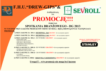 F.H.U.“DREW-GIPS”& ZAPRASZAJĄ NA PROMOCJĘ!!! PODCZAS SPOTKANIA BRANŻOWEGO - DG 2013 W TYM DNIU PRZY ZAKUPIE PRODUKTÓW FIRMY SEVROLL BĘDĄ OBOWIĄZYWAĆ NASTĘPUJACE PROMOCJE: 1) PRZY ZAKUPIE ZA 200 zł - METRÓWKA 3mb GRATIS!!! - do wyczerpania zapasów 2) PRZY ZAKUPIE ZA 300 zł - METRÓWKA 5 mb GRATIS!!! – do wyczerpania zapasów 3) PRZY ZAKUPIE ZA 500 zł - DO WYBORU GRATIS!!! - do wyczerpania zapasów UWAGA!!! WSZYSTKIE GIFTY SĄ RENOMOWANEJ FIRMY !!! - KOŃCÓWKA BIT; - NÓŻ DUŻY METALOWY; - NÓŻ MAŁY METALOWY; - ŚRUBOKRĘT DWUSTRONNY; - ZACISK KĄTOWY; 4) PRZY ZAKUPIE ZA 1000 zł - DO WYBORU GRATIS!!!- do wyczerpania zapasów - OPASKA MAGNETYCZNA; - METRÓWKA METALOWA 5 mb; 5) PRZY ZAKUPIE ZA 1500 zł - DO WYBORU GRATIS!!!- do wyczerpania zapasów - LATARKA; - ZESTAW KOŃCÓWEK; 6) PRZY ZAKUPIE ZA 2000zł – SKRZYNKA NARZĘDZIOWA GRATIS!!!- do wyczerpania zapasów Uwaga!!! – w/w promocje nie mogą być łączone