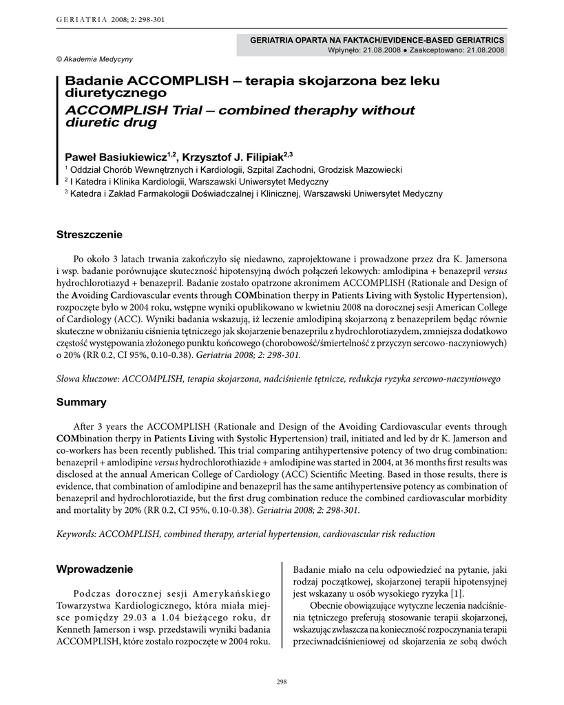 G E R I A T R I A 2008; 2: 298-301 GERIATRIA OPARTA NA FAKTACH/EVIDENCE-BASED GERIATRICS Wpłynęło: 21.08.2008 ● Zaakceptowano: 21.08.2008 © Akademia Medycyny Badanie ACCOMPLISH – terapia skojarzona bez leku diuretycznego ACCOMPLISH Trial – combined theraphy without diuretic drug Paweł Basiukiewicz1,2, Krzysztof J. Filipiak2,3 Oddział Chorób Wewnętrznych i Kardiologii, Szpital Zachodni, Grodzisk Mazowiecki I Katedra i Klinika Kardiologii, Warszawski Uniwersytet Medyczny 3 Katedra i Zakład Farmakologii Doświadczalnej i Klinicznej, Warszawski Uniwersytet Medyczny 1 2 Streszczenie Po około 3 latach trwania zakończyło się niedawno, zaprojektowane i prowadzone przez dra K. Jamersona i wsp. badanie porównujące skuteczność hipotensyjną dwóch połączeń lekowych: amlodipina + benazepril versus hydrochlorotiazyd + benazepril. Badanie zostało opatrzone akronimem ACCOMPLISH (Rationale and Design of the Avoiding Cardiovascular events through COMbination therpy in Patients Living with Systolic Hypertension), rozpoczęte było w 2004 roku, wstępne wyniki opublikowano w kwietniu 2008 na dorocznej sesji American College of Cardiology (ACC). Wyniki badania wskazują, iż leczenie amlodipiną skojarzoną z benazeprilem będąc równie skuteczne w obniżaniu ciśnienia tętniczego jak skojarzenie benazeprilu z hydrochlorotiazydem, zmniejsza dodatkowo częstość występowania złożonego punktu końcowego (chorobowość/śmiertelność z przyczyn sercowo-naczyniowych) o 20% (RR 0.2, CI 95%, 0.10-0.38). Geriatria 2008; 2: 298-301. Słowa kluczowe: ACCOMPLISH, terapia skojarzona, nadciśnienie tętnicze, redukcja ryzyka sercowo-naczyniowego Summary After 3 years the ACCOMPLISH (Rationale and Design of the Avoiding Cardiovascular events through COMbination therpy in Patients Living with Systolic Hypertension) trail, initiated and led by dr K. Jamerson and co-workers has been recently published. This trial comparing antihypertensive potency of two drug combination: benazepril + amlodipine versus hydrochlorothiazide + amlodipine was started in 2004, at 36 months first results was disclosed at the annual American College of Cardiology (ACC) Scientific Meeting. Based in those results, there is evidence, that combination of amlodipine and benazepril has the same antihypertensive potency as combination of benazepril and hydrochlorotiazide, but the first drug combination reduce the combined cardiovascular morbidity and mortality by 20% (RR 0.2, CI 95%, 0.10-0.38). Geriatria 2008; 2: 298-301. Keywords: ACCOMPLISH, combined therapy, arterial hypertension, cardiovascular risk reduction Wprowadzenie Badanie miało na celu odpowiedzieć na pytanie, jaki rodzaj początkowej, skojarzonej terapii hipotensyjnej jest wskazany u osób wysokiego ryzyka [1]. Obecnie obowiązujące wytyczne leczenia nadciśnienia tętniczego preferują stosowanie terapii skojarzonej, wskazując zwłaszcza na konieczność rozpoczynania terapii przeciwnadciśnieniowej od skojarzenia ze sobą dwóch Podczas dorocznej sesji Amer ykańskiego Towarzystwa Kardiologicznego, która miała miejsce pomiędzy 29.03 a 1.04 bieżącego roku, dr Kenneth Jamerson i wsp. przedstawili wyniki badania ACCOMPLISH, które zostało rozpoczęte w 2004 roku. 298 G E R I A T R I A 2008; 2: 298-301 Badana populacja leków w przypadku nadciśnienia tętniczego ≥2 stopnia lub dużego całkowitego ryzyka sercowo-naczyniowego [2]. W zasadzie osiągnięcie docelowych wartości ciśnienia tętniczego za pomocą monoterapii nie jest możliwe u większości pacjentów. Bardzo często (zwykle zawsze) jednym z leków stosowanych w terapii skojarzonej jest diuretyk, niemniej jednak, bardzo skutecznymi lekami o dość dużym wachlarzu protekcyjnym są antagoniści wapnia (pochodne dihydropirydyny), zwłaszcza, gdy jako lek skojarzony zastosuje się z nimi lek hamujący układ renina-angiotensyna-aldosteron (inhibitor konwertazy angiotensyny lub antagonistę receptorów angiotensynowych). W założeniu populacja włączona do badania miała przedstawiać pacjentów wysokiego ryzyka – szeroka definicja „wysokiego ryzyka” obejmuje wiek ≥ 60 roku życia, skurczowe ciśnienie tętnicze ≥ 160 mmHg lub aktualnie prowadzoną terapię hipotensyjną oraz dodatkowo obecność cech uszkodzenia narządowego. Do badania zdecydowano się włączyć także pacjentów młodszych – pomiędzy 55 a 59 rokiem życia po warunkiem obecności co najmniej dwóch powikłań narządowych (spośród: choroba wieńcowa, choroba tętnic obwodowych, choroba tętnic mózgowych, cukrzyca, choroba nerek). Charakterystyka badanej populacji pod kątem dotychczasowego leczenia i chorób współistniejących przedstawiała się następująco: 78% osób przyjmowało inhibitory konwertazy angiotensyny lub antagonistów receptora dla angiotensyny, 67% przyjmowało leki hipolipemizujące, 63% było leczonych przeciwpłytkowo, 50% pacjentów charakteryzowała otyłość, 60 % miało rozpoznaną cukrzycę, 74% pacjentów otrzymywało ≥2 leków hipotensyjnych, 97% było uprzednio leczonych z powodu nadciśnienia tętniczego. W momencie rozpoczęcia badania 37,5% pacjentów było leczonych skutecznie (ciśnienie tętnicze<140/90 mmHg). Większość badanych pacjentów było przedstawicielami rasy kaukaskiej (83%), mężczyźni stanowili około 60% populacji, osoby powyżej 70 roku życia stanowiły 40%. Z badania wyłączono pacjentów z objawami choroby wieńcowej w ciągu ostatnich 3 miesięcy, ostrym zespołem wieńcowym przebytym w przeciągu ostatniego miesiąca, niewydolnością serca lub frakcją wyrzucania lewej komory < 40%, mózgowym incydentem niedokrwiennym w przeciągu 3 miesięcy oraz wtórnym nadciśnieniem tętniczym. Do badania zostało włączonych 11462 pacjentów, z czego 5741 zostało zrandomizowanych do grupy przyjmującej benazepril z amlodipiną, a 5721 do grupy leczonej benazeprilem z hydrochlorotiazydem. Projekt badania przewidywał: 1. Fazę wczesnej obserwac
