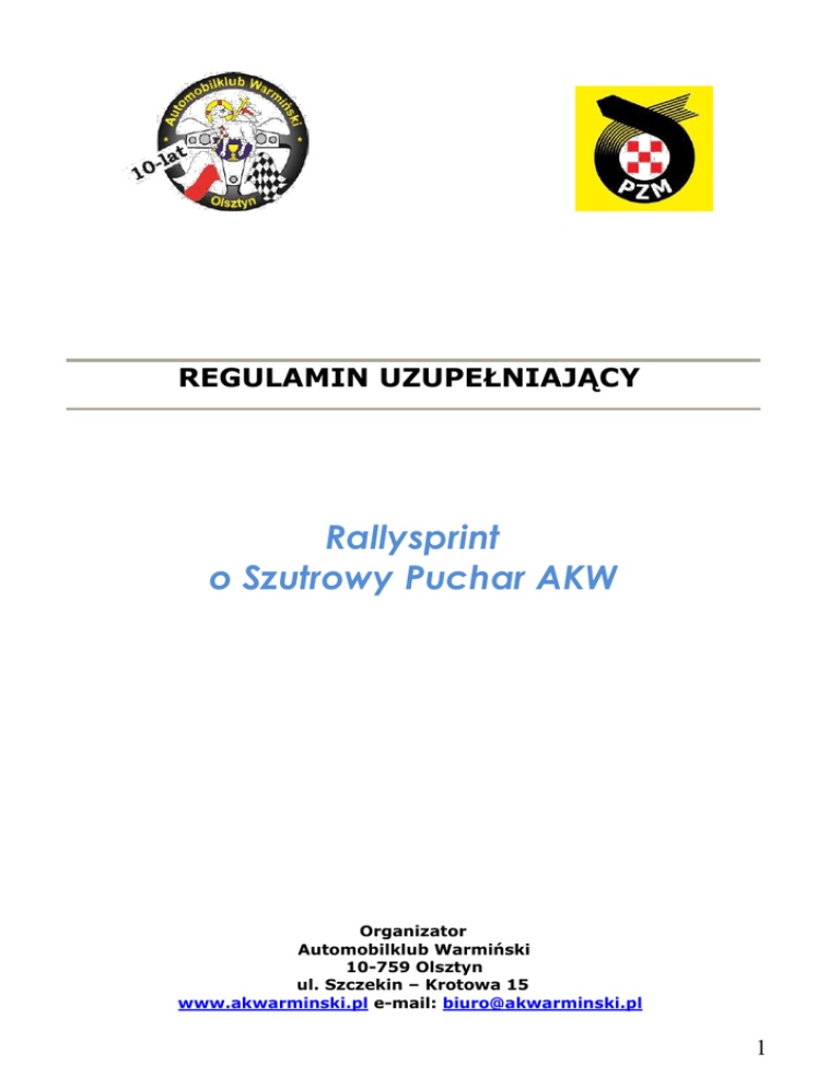REGULAMIN UZUPEŁNIAJĄCY Rallysprint o Szutrowy Puchar AKW Organizator Automobilklub Warmiński 10-759 Olsztyn ul. Szczekin – Krotowa 15 www.akwarminski.pl e-mail: [email protected] 1 1. USTALENIA OGÓLNE Impreza organizowana jest zgodnie z: Ustawą Prawo o Ruchu Drogowym RP Regulaminem Sportowym Rajdów Regionalnych FIA • Regulaminem KJS • Regulaminem Ochrony Środowiska w Sportach Motorowych • niniejszym Regulaminem Uzupełniającym. 1.1.Ranga zawodów Rally Sprint rozgrywany jest jako: 4 runda Szutrowego Pucharu AK Warmińskiego 1.2.Miejsce i termin Imprezy Zawody odbędą się w dniu: 9.10.2016 (niedziela) 1.3. Lokalizacja Biura Frączki – tor szutrowy 1.4. Lokalizacja Startu i Mety Tor szutrowy 1.5. Charakterystyka Imprezy Trasę stanowić będzie tor szutrowy zamknięty o długości : 2490 m. 1.6. Wiza ZO PZM Numer wizy33/2016 z dnia 01.10.2016 wydana przez OKSS ZO PZM w Olsztynie. 2. ORGANIZACJA 2.1. Nazwa Organizatora Automobilklub Warmiński 10-756 Olsztyn ul. Szczekin - Krotowa 15 e-mail: [email protected] 2.2. Osoby Oficjalne Przewodniczący ZSS Członek ZSS Członek ZSS Dyrektor Zawodów Z-ca Dyr. ds. Sportowych, Sędziów Kierownik Trasy i Zabezpieczenia Kierownik Pomiaru Czasu Kierownik Komisji Obliczeń Kierownik Badania Kontrolnego Kierownik Strefy Serwisowej Kierownik Biura Zawodów Maciej Fijałkowski Agnieszka Pazik Maciej Wysocki Cezary Raczkowski Wojciech Fijałkowski Dominik Przybysz Paweł Tuchowski Robert Radzio Marek Bratkowski Józef Grygianiec Iwona Fijałkowska 2 3. Program zawodów Godz. wydarzenie 08:30 Otwarcie Biura Otwarcie listy zgłoszeń Odbiór Administracyjny 09:15 Zamknięcie listy zgłoszeń 08:30 - 09:30 Badanie kontrolne BK 1 Zapoznanie z trasą (pieszo) oraz za samochodem organizatora 09:40 Opublikowanie listy startowej 09:45 Odprawa z uczestnikami 10:00 Start ok 14:00 Meta 14:15 Opublikowanie końcowej klasyfikacji prowizorycznej 14:45 Rozdanie pucharów Miejsce Biuro Rallysprintu – tor szutrowy Frączki Niedziela 9 października 2016 data 4. ZGŁOSZENIA 4.1.Załoga 4.1.1. Załogę stanowią dwie lub jedna osoba, określani jako kierowca lub kierowca i pilot. Kierowca musi mieć prawo jazdy, pilot ukończone 17 lat. 4.1.2. Kierowca nie może posiadać jakiejkolwiek licencji kierowcy sportu samochodowego w rozumieniu przepisów Polskiego Związku Motorowego, za wyjątkiem startu zawodników w odpowiedniej klasie. 4.1.3. Wszystkich uczestników obowiązuje całkowity zakaz treningów na trasie poza wyznaczonymi godzinami, jak również na terenie dróg dojazdowych i parku serwisowego od czasu zatwierdzenia Regulaminu Uzupełniającego do czasu zakończenia zawodów pod rygorem kary finansowej do wykluczenia z zawodów włącznie. 4.1.4. Dyrektor może ukarać uczestnika za brak dyscypliny sportowej. Za niesportowe zachowanie lub nie zastosowanie się do poleceń Dyrektora, kierownictwa lub innych osób funkcyjnych Rally Sprintu – do 50 sek. kary, a w przypadkach drastycznych – wykluczenie. 4.2.Obowiązki Załogi Do obowiązków Załogi należy: 4.2.1. Obecność na odprawie uczestników 4.2.2. Przejazd trasy imprezy w podanej przez Organizatora w kolejności i kierunku zgodnym ze schematem. 4.2.3. Odbycie wszystkich prób w zapiętych pasach bezpieczeństwa, zapiętych kaskach ochronnych, z włączonymi światłami mijania i zamkniętymi szybami. Nieprzestrzeganie powyższych przepisów pociągnie za sobą karę do wykluczenia włącznie. 4.2.4.Ze względu na konfigurację trasy zezwala się na start do 2 kierowców w jednym pojeździe. 3 4.3.Procedura Zgłoszeń 4.3. Zgłoszenia będą przyjmowane pocztą elektroniczną do dnia 7.10.2016 do godz. 12:00 oraz w dniu zawodów 9.10.2016 od godz. 08:30 w Biurze do godz. 9:15. Oryginał zgłoszenia musi być podpisany przez obydwu członków załogi i złożony w Biurze Zawodów. 4.3.1. Zgłoszenie jest zawarciem umowy cywilno - prawnej z organizatorem. 4.3.2. Organizator ma prawo nie przyjęcia zgłoszenia bez podania przyczyny. 4.3.3. Przez fakt podpisania zgłoszenia załoga przyjmuje do wiadomości, że startuje w imprezie na własną odpowiedzialność i zrzeka się wszelkich praw do odszkodowań za straty wynikłe podczas imprezy. Zrzeczenie to dotyczy FIA, PZM, Organizatora, osób oficjalnych występujących w imprezie i innych uczestników. 4.3.4. Organizator nie przyjmuje na siebie odpowiedzialności za szkody i straty w stosunku do załóg i ich sprzętu, jak również spowodowanych przez nie w sposób pośredni lub bezpośredni w stosunku do osób trzecich. 4.4 Maksymalna ilość uczestników 4.4.1. Maksymalna liczba startujących załóg: 40 4.4.2. W przypadku zgłoszenia więcej niż 40 załóg o przyjęciu decydować będzie kolejność wpływu zgłoszeń do Biura Zawodów. Zgłoszenia bez wpłaty wpisowego nie będą przyjmowane. 4.5 Pojazdy dopuszczone Do udziału w Zawodach dopuszcza się samochody osobowe w rozumieniu Prawa o Ruchu Drogowym lub osobowo/towarowe na bazie podwozia samochodu osobowego, ze sztywnym zamkniętym dachem, posiadające ważne dokumenty uprawniające do poruszania się po drogach publicznych RP i spełniające wymogi regulaminowe Rally Sprintu. Organizator nie dopuści do startu pojazdu z którego wycieka jakikolwiek płyn eksploatacyjny. 4.6 Podział na Klasy K-1 do 1400 cm3 K–2 powyżej 1400cm3 do 1600 cm3 K–3 powyżej 1600cm3 do 2000 cm3 K–4 powyżej 2000 cm3 oraz pojazdy z napędem na cztery koła GOŚĆ zawodnicy posiadający licencję kierowcy sportu samochodowego 4.6.1. W klasyfikacji generalnej nie będą klasyfikowani kierowcy z klasy Gość 4 4.7. Wpisowe, wpłaty, zwroty 4.7.1. Wysokość wpisowego na tej imprezie wynosi: 160 zł 140 zł 100 zł dla kierowców/uczestników niezrzeszonych w PZM dla kierowcy/uczestnika zrzeszonego w PZM dla członków AKW 4.7.2. Wpłaty wpisowego przyjmowane będą gotówką w czasie odbioru dokumentów w Biurze Zawodów. 4.7.3. Zwrot wpłaty może nastąpić w przypadku odwołania Zawodów lub 