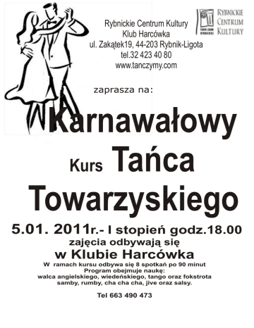 Rybnickie Centrum Kultury Klub Harcówka ul. Zak¹tek19, 44-203 Rybnik-Ligota tel.32 423 40 80 www.tanczymy.com Karnawa³owy Kurs Tañca Towarzyskiego 5.01. 2011r.- I stopieñ godz.18.00 zajêcia odbywaj¹ siê w Klubie Harcówka W ramach kursu odbywa siê 8 spotkañ po 90 minut Program obejmuje naukê: walca angielskiego, wiedeñskiego, tango oraz fokstrota samby, rumby, cha cha cha, jive oraz salsy. Tel 663 490 473