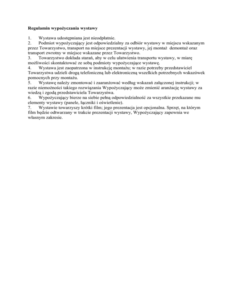 Regulamin wypożyczania wystawy 1. Wystawa udostępniana jest