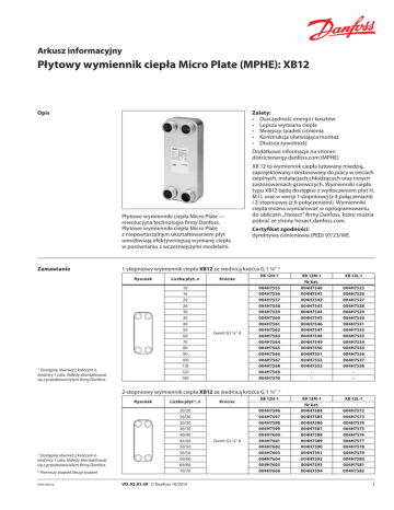 Arkusz informacyjny Płytowy wymiennik ciepła Micro Plate (MPHE): XB12 Opis Zalety: • Oszczędność energii i kosztów • Lepsza wymiana ciepła • Mniejszy spadek ciśnienia • Konstrukcja ułatwiająca montaż • Dłuższa żywotność Dodatkowe informacje na stronie: districtenergy.danfoss.com (MPHE) Płytowe wymienniki ciepła Micro Plate — rewolucyjna technologia firmy Danfoss. Płytowe wymienniki ciepła Micro Plate z niepowtarzalnym ukształtowaniem płyt umożliwiają efektywniejszą wymianę ciepła w porównaniu z wcześniejszymi modelami. Zamawianie XB 12 to wymiennik ciepła lutowany miedzią, zaprojektowany i dostosowany do pracy w sieciach cieplnych, instalacjach chłodzących oraz innych zastosowaniach grzewczych. Wymienniki ciepła typu XB12 będą dostępne z wytłoczeniem płyt H, M i L oraz w wersji 1-stopniowej (z 4 połączeniami) i 2-stopniowej (z 6 połączeniami). Wymienniki ciepła można wymiarować w oprogramowaniu do obliczeń „Hexact” firmy Danfoss, które można pobrać ze strony hexact.danfoss.com. Certyfikat zgodności: dyrektywa ciśnieniowa (PED) 97/23/WE. 1-stopniowy wymiennik ciepła XB12 ze średnicą króćca G 1 ¼” 1) Rysunek Liczba płyt, n 10 16 20 26 30 36 40 50 60 70 80 90 100 110 120 140 Dostępny również z króćcem o średnicy 1 cala. Należy skontaktować się z przedstawicielem firmy Danfoss. 1) Króciec Gwint G1 ¼” A XB 12H-1 004H7555 004H7556 004H7557 004H7558 004H7559 004H7560 004H7561 004H7562 004H7563 004H7564 004H7565 004H7566 004H7567 004H7568 004H7569 004H7570 XB 12M-1 Nr kat. 004H7540 004H7541 004H7542 004H7543 004H7544 004H7545 004H7546 004H7547 004H7548 004H7549 004H7550 004H7551 004H7552 004H7553 - XB 12L-1 004H7525 004H7526 004H7527 004H7528 004H7529 004H7530 004H7531 004H7532 004H7533 004H7534 004H7535 004H7536 004H7537 004H7538 - 2-stopniowy wymiennik ciepła XB12 ze średnicą króćca G 1 ¼” 1) Rysunek Dostępny również z króćcem o średnicy 1 cala. Należy skontaktować się z przedstawicielem firmy Danfoss. 1) 2) Pierwszy stopień/drugi stopień DEN-SMT/SI Liczba płyt2), n 20/20 26/26 30/30 36/36 40/40 46/46 50/50 56/56 60/60 66/66 70/70 VD.JQ.A1.49 © Danfoss 10/2014 Króciec Gwint G1 ¼” A XB 12H-1 004H7596 004H7597 004H7598 004H7599 004H7600 004H7601 004H7602 004H7603 004H7604 004H7605 004H7606 XB 12M-1 Nr kat. 004H7584 004H7585 004H7586 004H7587 004H7588 004H7589 004H7590 004H7591 004H7592 004H7593 004H7594 XB 12L-1 004H7572 004H7573 004H7574 004H7575 004H7576 004H7577 004H7578 004H7579 004H7580 004H7581 004H7582 1 Arkusz informacyjny Płytowy wymiennik ciepła Micro Plate XB 12 Zamawianie (ciąg dalszy) Akcesoria: Izolacja dla wymiennika 1-stopniowego Izolacja EPP (spieniony polipropylen) Liczba płyt Izolacja PU (poliuretan) Typ płyty (liczba płyt) H M Liczba płyt L 10 16 004H4201 20 004H4201 26 30 36 36 40 40 004H4202 50 70 004H4202 Izolacja EPP jest niedostępna; w tym rozmiarze prosimy zamówić izolację PU. 1) Akcesoria: Izolacja dla wymiennika 2-stopniowego 140 20/20 36/36 004H4203 1) - - 120 - - 140 H M 004H4201 004H4201 66/66 Izolacja EPP jest niedostępna; w tym rozmiarze prosimy zamówić izolację PU. 20/20 26/26 004H4202 40/40 66/66 1) 1) 004H4211 004H4211 004H4212 004H4212 004H4213 004H4212 70/70 004H4213 004H4214 Akcesoria — wspornik 1) Opis Złączka gwintowana L 004H4211 56/56 60/60 1) Akcesoria — złączki 004H4210 M 004H4210 50/50 004H4203 Złączka do wspawania - 46/46 004H4203 Złączka do lutowania - - Typ płyty (liczba płyt) H 36/36 70/70 0,5 mm 004H4213 - 30/30 004H4203 60/60 1) Liczba płyt L 004H4202 004H4202 004H4212 Izolacja PU (poliuretan) Typ płyty (liczba płyt) 46/46 56/56 004H4212 110 40/40 50/50 004H4212 100 1) 26/26 30/30 004H4211 004H4211 90 004H4203 Izolacja EPP (spieniony polipropylen) Liczba płyt 80 004H4210 004H4211 70 120 004H4210 60 004H4203 90 110 004H4210 50 004H4202 80 100 L 16 004H4201 30 60 M 10 20 26 Typ płyty (liczba płyt) H Króciec Nr kat.1) G 1 ¼" A / 28 mm 004B1358 G 1"A / 22 mm 004B2906 G 1"A / 18 mm 004B2905 G 1"A / 15 mm 004B2904 G 1"A / DN20 003H6909 G 1"A / DN25 004B2903 G 1 ¼" / DN25 003H6910 G 1 ¼" / DN32 004B1343 G 1 ¼" / G 1" 004H4205 G 1 ¼" / G 1 ½" 004H4206 G 1" / G¾" 004B2913 Rysunek Nr kat. 004H4200 1) Zestaw wspornika składa się ze wspornika oraz dwóch pierścieni Segera Komplet zawiera dwie złączki z nakrętkami łączącymi oraz uszczelki 1) Budowa i działanie 2-stopniowe wymienniki ciepła firmy Danfoss są wyposażone w 6 króćców, ponieważ przeważnie stosowane są do podgrzewania CWU. Dostępny jest jeden dodatkowy króciec, który umożliwia cyrkulację ciepłej wody, oraz jeden króciec do podłączenia i wydobywania ciepła z wody powracającej z podgrzewającego wymiennika ciepła. Króćce T112 i T212 można zablokować, jeśli nie są używane. T11 - Strona pierwotna, wlot T12 - Strona pierwotna, wylot T112- Strona pierwotna, wtórny wlot (2-stopień) T21 - Strona wtórna, wlot T22 - Strona wtórna, wylot T212- Strona wtórna, wtórny wlot (2-stopień) 2 VD.JQ.A1.49 © Danfoss 10/2014 DEN-SMT/SI Arkusz informacyjny Płytowy wymiennik ciepła Micro Plate XB 12 Dane techniczne Typ XB 12L-1 XB 12M-1 XB 12H-1 Maks. ciśnienie robocze bar 25 Temperatura min./maks. °C -10 / 180 SC: Woda obiegowa/wodny roztwór glikolu do 50% IC: wodny roztwór glikolu etylenowego, propylenowego, wodne roztwory etanolu i inne odpowiednie media wykorzystywane do wymiany ciepła. (Należy skontaktować się z przedstawicielem firmy Danfoss). 0,042 0,032 0,027 Czynnik Objętość/kanał l Rodzaje króćców Gwint zewn. walcowy, zg. z DIN ISO 228/1 Średnica króćca G 1 ¼” lub G 1” Masa 1-stopniowy: Króciec G 1 ¼” / G 1”: 1,53+0,076*n / 1,36+0,076*n kg 2-stopniowy: Króciec G 1 ¼” / G 1”: 1,77+0,076*n / 1,52+0,076*n Materiał Płyta Stal nierdzewna EN 1.4404 (AISI 316L) Lutowanie twarde Miedź Izolacja Typ Przewodność cieplna λ Stała Krótkotrwała (szczytowa) Temperatura maksymalna PU