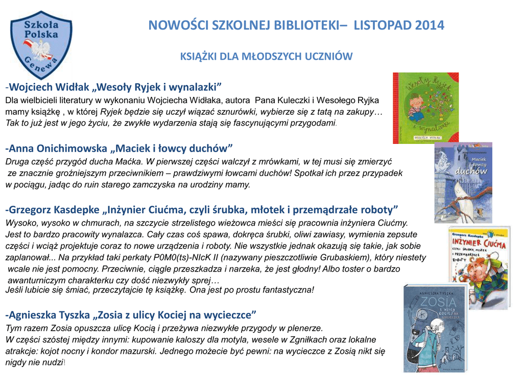 NOWOŚCI SZKOLNEJ BIBLIOTEKI– LISTOPAD 2014 KSIĄŻKI DLA MŁODSZYCH UCZNIÓW -Wojciech Widłak „Wesoły Ryjek i wynalazki” Dla wielbicieli literatury w wykonaniu Wojciecha Widłaka, autora Pana Kuleczki i Wesołego Ryjka mamy książkę , w której Ryjek będzie się uczył wiązać sznurówki, wybierze się z tatą na zakupy… Tak to już jest w jego życiu, że zwykłe wydarzenia stają się fascynującymi przygodami. -Anna Onichimowska „Maciek i łowcy duchów” Druga część przygód ducha Maćka. W pierwszej części walczył z mrówkami, w tej musi się zmierzyć ze znacznie groźniejszym przeciwnikiem – prawdziwymi łowcami duchów! Spotkał ich przez przypadek w pociągu, jadąc do ruin starego zamczyska na urodziny mamy. -Grzegorz Kasdepke „Inżynier Ciućma, czyli śrubka, młotek i przemądrzałe roboty” Wysoko, wysoko w chmurach, na szczycie strzelistego wieżowca mieści się pracownia inżyniera Ciućmy. Jest to bardzo pracowity wynalazca. Cały czas coś spawa, dokręca śrubki, oliwi zawiasy, wymienia zepsute części i wciąż projektuje coraz to nowe urządzenia i roboty. Nie wszystkie jednak okazują się takie, jak sobie zaplanował... Na przykład taki perkaty P0M0(ts)-NIcK II (nazywany pieszczotliwie Grubaskiem), który niestety wcale nie jest pomocny. Przeciwnie, ciągle przeszkadza i narzeka, że jest głodny! Albo toster o bardzo awanturniczym charakterku czy dość niezwykły sprej… Jeśli lubicie się śmiać, przeczytajcie tę książkę. Ona jest po prostu fantastyczna! -Agnieszka Tyszka „Zosia z ulicy Kociej na wycieczce” Tym razem Zosia opuszcza ulicę Kocią i przeżywa niezwykłe przygody w plenerze. W części szóstej między innymi: kupowanie kaloszy dla motyla, wesele w Zgniłkach oraz lokalne atrakcje: kojot nocny i kondor mazurski. Jednego możecie być pewni: na wycieczce z Zosią nikt się nigdy nie nudzi! KSIĄŻKI DLA TROCHĘ STARSZYCH LUB NAWET PRAWIE DOROSŁYCH UCZNIÓW -Rafał Witek „Zgniłobrody i luneta przeznaczenia” Pierwszy tom dowcipnej serii! To wszystko przez moje nazwisko! Gdybym nazywała się Gabrysia Grzeczniutka, to ludzie inaczej by mnie traktowali. Ale Gabrysi Bzik mogą się czepiać do woli. Dlatego ciągle ląduję na dywaniku u dyrektora. Któregoś razu wylądowałam tam z Nilsonem Makówką, kolegą z klasy. On zna na pamięć chyba wszystkie kodeksy świata i nie waha się ich użyć! Muszę powiedzieć, że te jego prawnicze zainteresowania czasem się przydają – trudno gościa przegadać, nawet dyrektor ma z tym kłopot! No więc trochę się z Nilsonem zakumplowaliśmy. Ale nie myślcie, że ze sobą chodzimy! Ja doskonale potrafię chodzić sama, nie jest mi do tego potrzebny żaden chłopak. Za to wspólne przygotowanie projektu do szkoły oraz próba ucywilizowania pirata z Karaibów? To zupełnie inna historia… -Rafał Witek „Zgniłobrody i luneta przeznaczenia” Tym razem Nilson miał dość. Jego ojciec znowu odwołał wspólne wakacje! Jedyne, co pozostało Nilsonowi, to zażądać nagrody pocieszenia w postaci odjechanego prezentu. Niestety, nic nie poszło zgodnie z planem. Za to wpakowaliśmy się w grube kłopoty i utknęliśmy sami daleko od domu. Jak daleko? Jakieś 100 lat z kawałkiem… -Anna Łacina „Czynnik miłości” Gdyby rodzina Cullenów chodziła do liceum Patrycji, wszystko wyglądałoby inaczej. Ale takie rzeczy dzieją się tylko w książkach. Poza nimi czeka codzienność: despotyczny ojciec urządzający w domu hałaśliwe imprezy, zahukana matka i zgryźliwi nauczyciele. Do tego najlepsza przyjaciółka zakochała się w Tajemniczym Poecie… A jednak… W życie Patrycji nieoczekiwanie wkracza ktoś bardzo podobny do Edwarda, bohatera ulubionej powieści: ta sama blada cera, podobnie podkrążone oczy, nieziemska uroda… Czy chłopak rzeczywiście skrywa mroczny sekret? Powieść Anny Łaciny opowiada o dorastaniu do dojrzałej i odpowiedzialnej miłości, trudnych wyborach oraz decyzjach, które mogą zaważyć na całym życiu. -Suzanne Collins„Igrzyska śmierci”, „W pierścieniu ognia”, „Kosogłos” Książki o bohaterskiej nastolatce Katniss, która ma w sobie odwagę i determinację, żeby samotnie przeciwstawić się imperium zła, są porywającą lekturą.