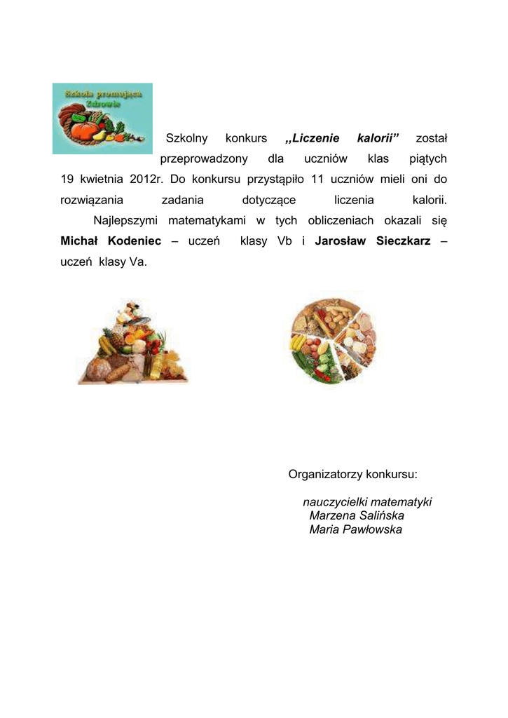 Szkolny ,,Liczenie konkurs przeprowadzony dla uczniów kalorii” został klas piątych 19 kwietnia 2012r. Do konkursu przystąpiło 11 uczniów mieli oni do rozwiązania zadania dotyczące liczenia kalorii. Najlepszymi matematykami w tych obliczeniach okazali się Michał Kodeniec – uczeń klasy Vb i Jarosław Sieczkarz – uczeń klasy Va. Organizatorzy konkursu: nauczycielki matematyki Marzena Salińska Maria Pawłowska