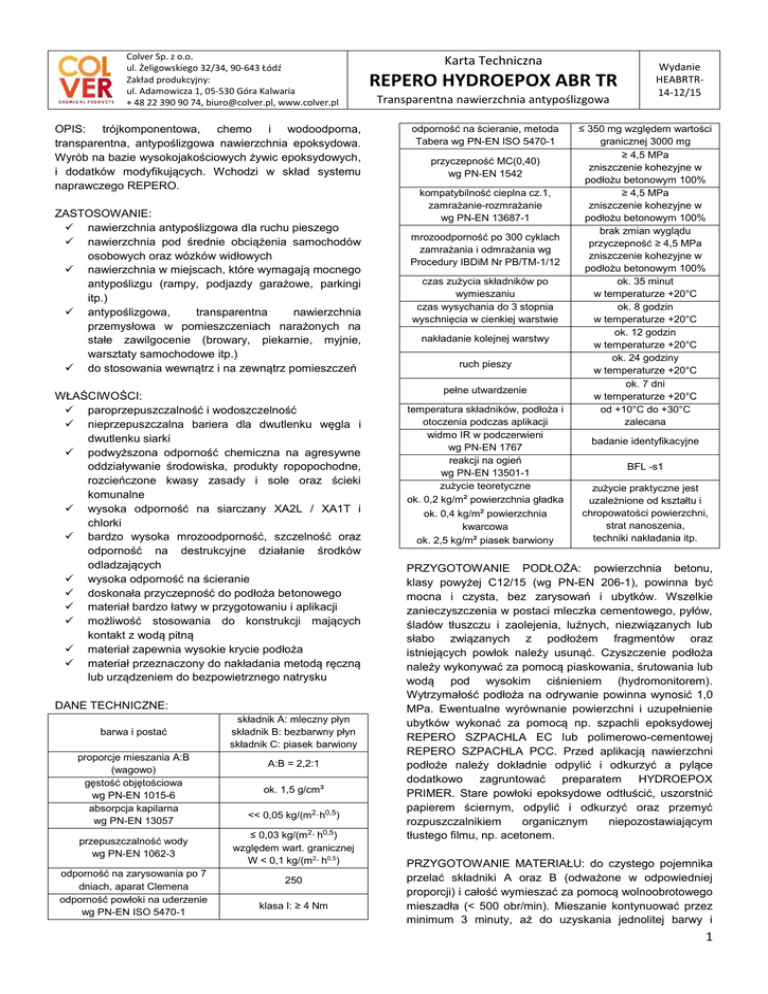 Colver Sp. z o.o. ul. Żeligowskiego 32/34, 90-643 Łódź Zakład produkcyjny: ul. Adamowicza 1, 05-530 Góra Kalwaria + 48 22 390 90 74, [email protected], www.colver.pl OPIS: trójkomponentowa, chemo i wodoodporna, transparentna, antypoślizgowa nawierzchnia epoksydowa. Wyrób na bazie wysokojakościowych żywic epoksydowych, i dodatków modyfikujących. Wchodzi w skład systemu naprawczego REPERO. ZASTOSOWANIE: nawierzchnia antypoślizgowa dla ruchu pieszego nawierzchnia pod średnie obciążenia samochodów osobowych oraz wózków widłowych nawierzchnia w miejscach, które wymagają mocnego antypoślizgu (rampy, podjazdy garażowe, parkingi itp.) antypoślizgowa, transparentna nawierzchnia przemysłowa w pomieszczeniach narażonych na stałe zawilgocenie (browary, piekarnie, myjnie, warsztaty samochodowe itp.) do stosowania wewnątrz i na zewnątrz pomieszczeń WŁAŚCIWOŚCI: paroprzepuszczalność i wodoszczelność nieprzepuszczalna bariera dla dwutlenku węgla i dwutlenku siarki podwyższona odporność chemiczna na agresywne oddziaływanie środowiska, produkty ropopochodne, rozcieńczone kwasy zasady i sole oraz ścieki komunalne wysoka odporność na siarczany XA2L / XA1T i chlorki bardzo wysoka mrozoodporność, szczelność oraz odporność na destrukcyjne działanie środków odladzających wysoka odporność na ścieranie doskonała przyczepność do podłoża betonowego materiał bardzo łatwy w przygotowaniu i aplikacji możliwość stosowania do konstrukcji mających kontakt z wodą pitną materiał zapewnia wysokie krycie podłoża materiał przeznaczony do nakładania metodą ręczną lub urządzeniem do bezpowietrznego natrysku DANE TECHNICZNE: barwa i postać proporcje mieszania A:B (wagowo) gęstość objętościowa wg PN-EN 1015-6 absorpcja kapilarna wg PN-EN 13057 przepuszczalność wody wg PN-EN 1062-3 odporność na zarysowania po 7 dniach, aparat Clemena odporność powłoki na uderzenie wg PN-EN ISO 5470-1 składnik A: mleczny płyn składnik B: bezbarwny płyn składnik C: piasek barwiony A:B = 2,2:1 ok. 1,5 g/cm³ << 0,05 kg/(m2·h0,5) ≤ 0,03 kg/(m2· h0,5) względem wart. granicznej W < 0,1 kg/(m2· h0,5) 250 klasa I: ≥ 4 Nm Karta Techniczna REPERO HYDROEPOX ABR TR Transparentna nawierzchnia antypoślizgowa odporność na ścieranie, metoda Tabera wg PN-EN ISO 5470-1 przyczepność MC(0,40) wg PN-EN 1542 kompatybilność cieplna cz.1, zamrażanie-rozmrażanie wg PN-EN 13687-1 mrozoodporność po 300 cyklach zamrażania i odmrażania wg Procedury IBDiM Nr PB/TM-1/12 czas zużycia składników po wymieszaniu czas wysychania do 3 stopnia wyschnięcia w cienkiej warstwie nakładanie kolejnej warstwy ruch pieszy pełne utwardzenie temperatura składników, podłoża i otoczenia podczas aplikacji widmo IR w podczerwieni wg PN-EN 1767 reakcji na ogień wg PN-EN 13501-1 zużycie teoretyczne ok. 0,2 kg/m² powierzchnia gładka ok. 0,4 kg/m² powierzchnia kwarcowa ok. 2,5 kg/m² piasek barwiony Wydanie HEABRTR14-12/15 ≤ 350 mg względem wartości granicznej 3000 mg ≥ 4,5 MPa zniszczenie kohezyjne w podłożu betonowym 100% ≥ 4,5 MPa zniszczenie kohezyjne w podłożu betonowym 100% brak zmian wyglądu przyczepność ≥ 4,5 MPa zniszczenie kohezyjne w podłożu betonowym 100% ok. 35 minut w temperaturze +20°C ok. 8 godzin w temperaturze +20°C ok. 12 godzin w temperaturze +20°C ok. 24 godziny w temperaturze +20°C ok. 7 dni w temperaturze +20°C od +10°C do +30°C zalecana badanie identyfikacyjne BFL -s1 zużycie praktyczne jest uzależnione od kształtu i chropowatości powierzchni, strat nanoszenia, techniki nakładania itp. PRZYGOTOWANIE PODŁOŻA: powierzchnia betonu, klasy powyżej C12/15 (wg PN-EN 206-1), powinna być mocna i czysta, bez zarysowań i ubytków. Wszelkie zanieczyszczenia w postaci mleczka cementowego, pyłów, śladów tłuszczu i zaolejenia, luźnych, niezwiązanych lub słabo związanych z podłożem fragmentów oraz istniejących powłok należy usunąć. Czyszczenie podłoża należy wykonywać za pomocą piaskowania, śrutowania lub wodą pod wysokim ciśnieniem (hydromonitorem). Wytrzymałość podłoża na odrywanie powinna wynosić 1,0 MPa. Ewentualne wyrównanie powierzchni i uzupełnienie ubytków wykonać za pomocą np. szpachli epoksydowej REPERO SZPACHLA EC lub polimerowo-cementowej REPERO SZPACHLA PCC. Przed aplikacją nawierzchni podłoże należy dokładnie odpylić i odkurzyć a pylące dodatkowo zagruntować preparatem HYDROEPOX PRIMER. Stare powłoki epoksydowe odtłuścić, uszorstnić papierem ściernym, odpylić i odkurzyć oraz przemyć rozpuszczalnikiem organicznym niepozostawiającym tłustego filmu, np. acetonem. PRZYGOTOWANIE MATERIAŁU: do czystego pojemnika przelać składniki A oraz B (odważone w odpowiedniej proporcji) i całość wymieszać za pomocą wolnoobrotowego mieszadła (˂ 500 obr/min). Mieszanie kontynuować przez minimum 3 minuty, aż do uzyskania jednolitej barwy i 1 jednorodnej konsystencji. Zaleca się przeniesienie całości do czystego pojemnika i ponowne zamieszanie. Podczas mieszania należy zwrócić uwagę na zgarnianie masy ze ścianek oraz dna naczynia. Nie wolno mieszać ręcznie. Temperatura ma wpływ na lepkość żywicy epoksydowej. Składniki produktu przed użyciem powinny być przechowywane w temperaturze +15÷+25°C przez co najmniej 12 godzin. Zaleca się aby jednorazowo przygotować taką ilość materiału, która zostanie zużyta w ciągu czasu przydatności do użycia. SPOSÓB APLIKACJI: po utwardzeniu warstwy primera (po 12÷24 godzinach w zależności od temperatury) można przystąpić do naniesienia powłoki za pomocą pędzla lub wałka np. z włosiem z owczej wełny (do pierwszej warstwy nawierzchni antypoślizgowej można alternatywnie zastosować powłokę barwioną w masie HYDROEPOX). Na mokrą, świeżo pomalowaną powłokę rozsypać z nadmiarem składnik C (tzw. „plaża”). Pozostawić do utwardzenia. Po ok. 12 godzinach (w temperaturze 20°C) usuną