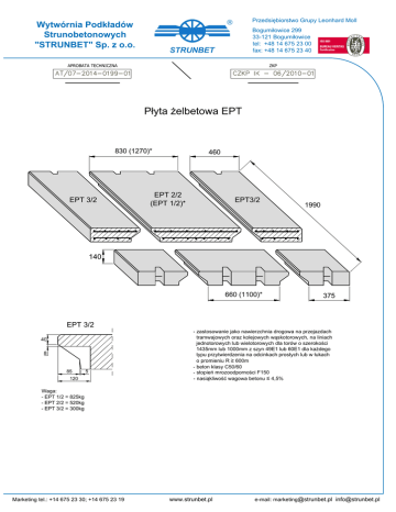 Przedsiębiorstwo Grupy Leonhard Moll Bogumiłowice 299 33-121 Bogumiłowice tel: +48 14 675 23 00 fax: +48 14 675 23 40 Strunobetonowych "STRUNBET" Sp. z o.o. APROBATA TECHNICZNA ZKP Płyta żelbetowa EPT 830 (1270)* EPT 3/2 460 EPT 2/2 (EPT 1/2)* EPT3/2 1990 140 660 (1100)* 375 EPT 3/2 40 8 85 5 120 - zastosowanie jako nawierzchnia drogowa na przejazdach tramwajowych oraz kolejowych wąskotorowych, na liniach jednotorowych lub wielotorowych dla torów o szerokości 1435mm lub 1000mm z szyn 49E1 lub 60E1 dla każdego typu przytwierdzenia na odcinkach prostych lub w łukach o promieniu R ≥ 600m - beton klasy C50/60 - stopień mrozoodporności F150 - nasiąkliwość wagowa betonu ≤ 4,5% Waga: - EPT 1/2 = 825kg - EPT 2/2 = 520kg - EPT 3/2 = 300kg Marketing tel.: +14 675 23 30; +14 675 23 19 www.strunbet.pl e-mail: [email protected] [email protected]
