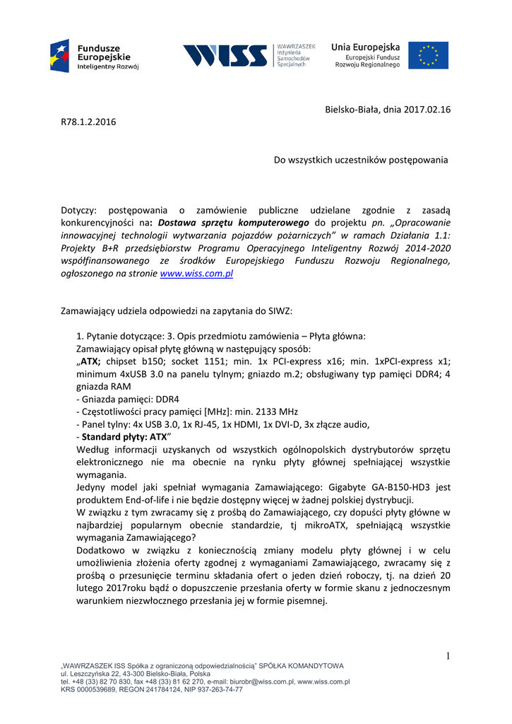 Bielsko-Biała, dnia 2017.02.16 R78.1.2.2016 Do wszystkich uczestników postępowania Dotyczy: postępowania o zamówienie publiczne udzielane zgodnie z zasadą konkurencyjności na: Dostawa sprzętu komputerowego do projektu pn. „Opracowanie innowacyjnej technologii wytwarzania pojazdów pożarniczych” w ramach Działania 1.1: Projekty B+R przedsiębiorstw Programu Operacyjnego Inteligentny Rozwój 2014-2020 współfinansowanego ze środków Europejskiego Funduszu Rozwoju Regionalnego, ogłoszonego na stronie www.wiss.com.pl Zamawiający udziela odpowiedzi na zapytania do SIWZ: 1. Pytanie dotyczące: 3. Opis przedmiotu zamówienia – Płyta główna: Zamawiający opisał płytę główną w następujący sposób: „ATX; chipset b150; socket 1151; min. 1x PCI-express x16; min. 1xPCI-express x1; minimum 4xUSB 3.0 na panelu tylnym; gniazdo m.2; obsługiwany typ pamięci DDR4; 4 gniazda RAM - Gniazda pamięci: DDR4 - Częstotliwości pracy pamięci [MHz]: min. 2133 MHz - Panel tylny: 4x USB 3.0, 1x RJ-45, 1x HDMI, 1x DVI-D, 3x złącze audio, - Standard płyty: ATX” Według informacji uzyskanych od wszystkich ogólnopolskich dystrybutorów sprzętu elektronicznego nie ma obecnie na rynku płyty głównej spełniającej wszystkie wymagania. Jedyny model jaki spełniał wymagania Zamawiającego: Gigabyte GA-B150-HD3 jest produktem End-of-life i nie będzie dostępny więcej w żadnej polskiej dystrybucji. W związku z tym zwracamy się z prośbą do Zamawiającego, czy dopuści płyty główne w najbardziej popularnym obecnie standardzie, tj mikroATX, spełniającą wszystkie wymagania Zamawiającego? Dodatkowo w związku z koniecznością zmiany modelu płyty głównej i w celu umożliwienia złożenia oferty zgodnej z wymaganiami Zamawiającego, zwracamy się z prośbą o przesunięcie terminu składania ofert o jeden dzień roboczy, tj. na dzień 20 lutego 2017roku bądź o dopuszczenie przesłania oferty w formie skanu z jednoczesnym warunkiem niezwłocznego przesłania jej w formie pisemnej. 1 „WAWRZASZEK ISS Spółka z ograniczoną odpowiedzialnością” SPÓŁKA KOMANDYTOWA ul. Leszczyńska 22, 43-300 Bielsko-Biała, Polska tel. +48 (33) 82 70 830, fax +48 (33) 81 62 270, e-mail: [email protected], www.wiss.com.pl KRS 0000539689, REGON 241784124, NIP 937-263-74-77 Odpowiedzi: 1. Zamawiający dopuszcza płyty główne w standardzie mikroATX. Zamawiający nie zmienia terminu składania ofert ani nie zmienia formy złożenia oferty. Otrzymują: 1. wszyscy postępowania za pośrednictwem strony internetowej www.wiss.com.pl oraz https://bazakonkurencyjnosci.funduszeeuropejskie.gov.pl/ 2. a/a 2 „WAWRZASZEK ISS Spółka z ograniczoną odpowiedzialnością” SPÓŁKA KOMANDYTOWA ul. Leszczyńska 22, 43-300 Bielsko-Biała, Polska tel. +48 (33) 82 70 830, fax +48 (33) 81 62 270, e-mail: [email protected], www.wiss.com.pl KRS 0000539689, REGON 241784124, NIP 937-263-74-77