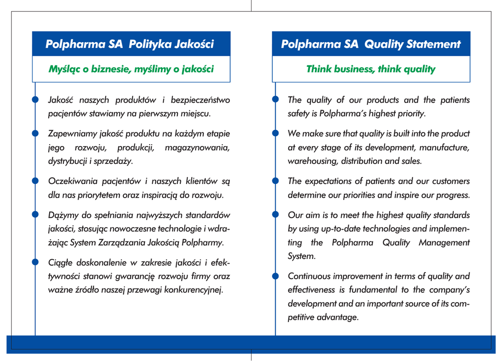 Polpharma SA Polityka Jakości Polpharma SA Quality Statement Myśląc o biznesie, myślimy o jakości Think business, think quality Jakość naszych produktów i bezpieczeństwo The quality of our products and the patients pacjentów stawiamy na pierwszym miejscu. safety is Polpharma’s highest priority. Zapewniamy jakość produktu na każdym etapie We make sure that quality is built into the product jego at every stage of its development, manufacture, rozwoju, produkcji, magazynowania, dystrybucji i sprzedaży. warehousing, distribution and sales. Oczekiwania pacjentów i naszych klientów są The expectations of patients and our customers dla nas priorytetem oraz inspiracją do rozwoju. determine our priorities and inspire our progress. Dążymy do spełniania najwyższych standardów Our aim is to meet the highest quality standards jakości, stosując nowoczesne technologie i wdra- by using up-to-date technologies and implemen- żając System Zarządzania Jakością Polpharmy. ting the Polpharma Quality Management Ciągłe doskonalenie w zakresie jakości i efek- System. tywności stanowi gwarancję rozwoju firmy oraz Continuous improvement in terms of quality and ważne źródło naszej przewagi konkurencyjnej. effectiveness is fundamental to the company’s development and an important source of its competitive advantage.