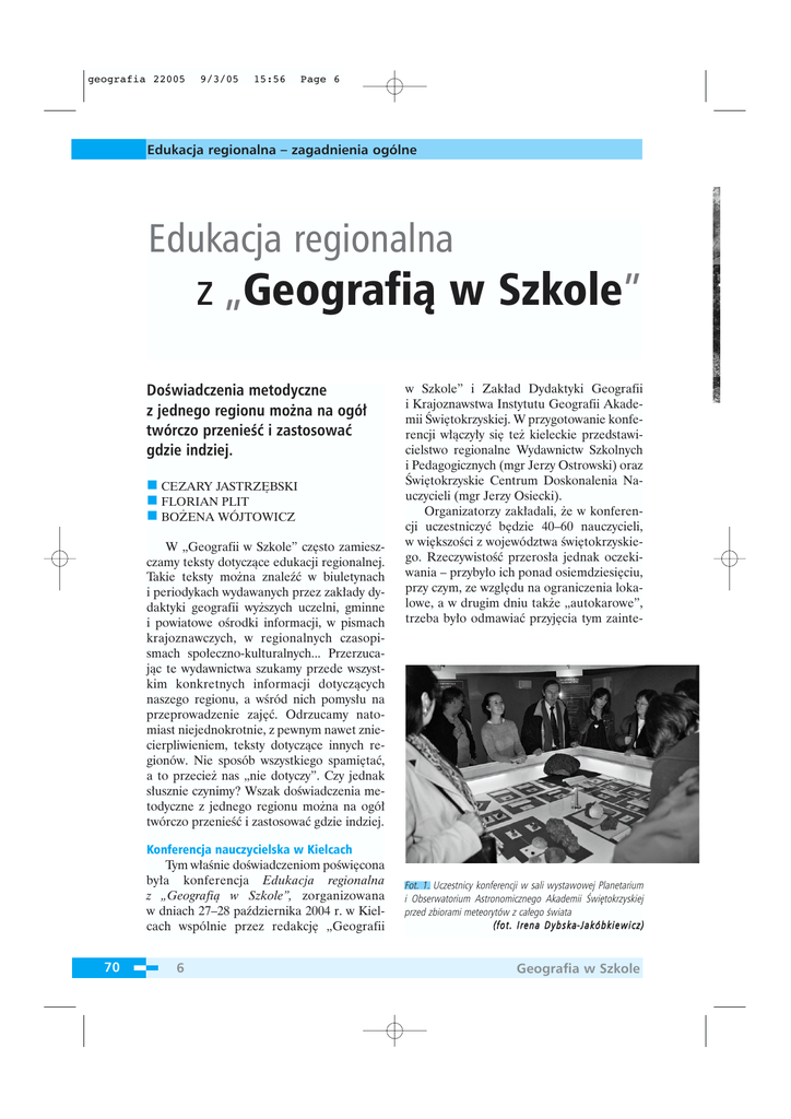 geografia 22005 9/3/05 15:56 Page 6 Edukacja regionalna – zagadnienia ogólne Edukacja regionalna z „Geografià w Szkole” DoÊwiadczenia metodyczne z jednego regionu mo˝na na ogó∏ twórczo przenieÊç i zastosowaç gdzie indziej. CEZARY JASTRZ¢BSKI FLORIAN PLIT BO˚ENA WÓJTOWICZ W „Geografii w Szkole” cz´sto zamieszczamy teksty dotyczàce edukacji regionalnej. Takie teksty mo˝na znaleêç w biuletynach i periodykach wydawanych przez zak∏ady dydaktyki geografii wy˝szych uczelni, gminne i powiatowe oÊrodki informacji, w pismach krajoznawczych, w regionalnych czasopismach spo∏eczno-kulturalnych... Przerzucajàc te wydawnictwa szukamy przede wszystkim konkretnych informacji dotyczàcych naszego regionu, a wÊród nich pomys∏u na przeprowadzenie zaj´ç. Odrzucamy natomiast niejednokrotnie, z pewnym nawet zniecierpliwieniem, teksty dotyczàce innych regionów. Nie sposób wszystkiego spami´taç, a to przecie˝ nas „nie dotyczy”. Czy jednak s∏usznie czynimy? Wszak doÊwiadczenia metodyczne z jednego regionu mo˝na na ogó∏ twórczo przenieÊç i zastosowaç gdzie indziej. Konferencja nauczycielska w Kielcach Tym w∏aÊnie doÊwiadczeniom poÊwi´cona by∏a konferencja Edukacja regionalna z „Geografià w Szkole”, zorganizowana w dniach 27–28 paêdziernika 2004 r. w Kielcach wspólnie przez redakcj´ „Geografii 70 6 w Szkole” i Zak∏ad Dydaktyki Geografii i Krajoznawstwa Instytutu Geografii Akademii Âwi´tokrzyskiej. W przygotowanie konferencji w∏àczy∏y si´ te˝ kieleckie przedstawicielstwo regionalne Wydawnictw Szkolnych i Pedagogicznych (mgr Jerzy Ostrowski) oraz Âwi´tokrzyskie Centrum Doskonalenia Nauczycieli (mgr Jerzy Osiecki). Organizatorzy zak∏adali, ˝e w konferencji uczestniczyç b´dzie 40–60 nauczycieli, w wi´kszoÊci z województwa Êwi´tokrzyskiego. RzeczywistoÊç przeros∏a jednak oczekiwania – przyby∏o ich ponad osiemdziesi´ciu, przy czym, ze wzgl´du na ograniczenia lokalowe, a w drugim dniu tak˝e „autokarowe”, trzeba by∏o odmawiaç przyj´cia tym zainte- Fot. 1. Uczestnicy konferencji w sali wystawowej Planetarium i Obserwatorium Astronomicznego Akademii Âwi´tokrzyskiej przed zbiorami meteorytów z ca∏ego Êwiata ( f o t . I r e n a D y b s k a- J a k ó b k i e w i c z ) Geografia w Szkole geografia 22005 9/3/05 15:56 Page 7 Edukacja regionalna – zagadnienia ogólne Fot. 2. M∏odzawy Ma∏e. „Ogród na Rozstajach” – za∏o˝ony przez artyst´ rzeêbiarza Tadeusza Kurczyn´, ukazujàcy walory Êrodowiska przyrodniczego: znajduje si´ tu wiele gatunków drzew, krzewów i roÊlin kwiatowych, wodospad, jaskinia (fot. Andrzej Tarasiewicz) i mnóstwo ptaków resowanym, którzy zg∏osili si´ w terminach póêniejszych. Mimo, ˝e program by∏ d∏ugi i bardzo intensywny, niemal wszyscy uczestnicy dotrwali do koƒca, a o du˝ym zainteresowaniu Êwiadczy∏y m.in. liczne pytania zadawane referentom. W pierwszym dniu uczestnicy konferencji wys∏uchali 10 referatów poruszajàcych ró˝ne aspekty edukacji regionalnej i nawiàzujàcych – z za∏o˝enia – do artyku∏ów opublikowanych w ró˝nych latach na ∏amach „Geografii w Szkole” (uczestnicy konferencji otrzymali teczki z powielonymi tekstami tych artyku∏ów). Dziewi´ç spoÊród referatów wyg∏oszonych na konferencji zamieszczamy w niniejszym numerze czasopisma. Mamy nadziej´, ˝e choç dotyczà one edukacji regionalnej, to ich przydatnoÊç ma ponadregionalny charakter. Uczestnicy konferencji wys∏uchali te˝ interesujàcego referatu dra hab. Andersa Szczepaƒskiego ze Szwecji (syna polskiego ˝o∏nierza spod Monte Cassino), który opowiada∏ o prowadzonych w tym kraju zaj´ciach w terenie, przypominajàcych troch´ nasze „zielone szko∏y”, a troch´ Êcie˝ki dydaktyczne. Tego samego dnia mgr Cezary Jastrz´bski pokrótce przygotowa∏ uczestników do zapowiedzianego na dzieƒ nast´pny 2/2005 objazdu terenowego. Nast´pnie przedstawiciele Wydawnictw Szkolnych i Pedagogicznych omówili nowoÊci wydawnicze i najbli˝sze plany swojej oficyny, zaprezentowali tablic´ multimedialnà, która ostatnio zyskuje coraz wi´kszà popularnoÊç oraz rozdali drobne upominki ksià˝kowe. Pierwszy, bardzo pracowity dzieƒ zakoƒczy∏y zaj´cia warsztatowe przeprowadzone w trzech grupach: w pracowni komputerowej, gdzie dr Robert So∏tysik prezentowa∏ edukacyjne programy komputerowe, w lapidarium, po którym oprowadza∏ dr Boles∏aw Kowalski, pokazujàc zbiory najró˝niejszych g∏azów narzutowych z terenu Polski, wreszcie w obserwatorium astronomicznym Akademii Âwi´tokrzyskiej – tu uczestnicy obejrzeli teleskop i przygotowywane planetarium oraz podziwiali zbiory meteorytów z ca∏ego Êwiata (fot. 1.). Zaj´cia terenowe W drugim dniu uczestnicy konferencji i warsztatów dla nauczycieli geografii brali Fot. 3. Alicja Skowronek, nauczycielka geografii w Publicznym Gimnazjum nr2 w Rudkach – wykonujàca szkic krajobrazu za pomocà „barw natury” (m.in. kawa∏ka kory) (fot. Miros∏aw Mularczyk) 7 71 geografia 22005 9/3/05 15:56 Page 8 Edukacja regionalna – zagadnienia ogólne poznawanie stylów architektonicznych, szkic krajobrazu rysowany „barwami natury” (za pomocà Êrodków dost´pnych w naturze: marchewki, buraka, kawa∏ka kory, zielonego liÊcia itp. – fot. 3). Wykonane zadania podlega∏y ewaluacji (fot. 4). Fot. 4. Uczestnicy prezentujàcy swoje szkice krajobrazowe (fot. Miros∏aw Mularczyk) udzia∏ w zaj´ciach terenowych pod nazwà „Edukacja regionalna – walory krajoznawcze Niecki Nidziaƒskiej”. Wyznaczono 9 stanowisk dydaktycznych, obejmujàcych najbardziej interesujàce aspekty krajoznawcze makroregionu. W Borkowie dr Boles∏aw Kowalski ukaza∏ tutejszy krajobraz morfologiczny jako konsekwencj´ budowy geologicznej, oglàdaliÊmy te˝ kopalni´ gipsu. Z kolei w Busku Zdroju dr Robert So∏tysik scharakteryzowa∏ wody mineralne Niecki Nidziaƒskiej, ich w∏aÊciwoÊci i znaczenie. Pozos