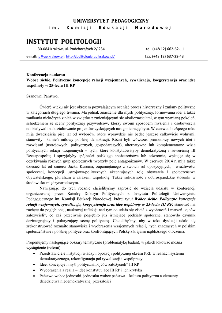 UNIWERSYTET PEDAGOGICZNY i m . K o m i s j i E d u k a c j i N a r o d o w e j INSTYTUT POLITOLOGII 30-084 Kraków, ul. Podchorążych 2/ 234 tel. (+48 12) 662-62-11 e-mail: [email protected] ; http://politologia.up.krakow.pl/ fax. (+48 12) 637-22-43 Konferencja naukowa Wobec siebie. Polityczne koncepcje relacji wzajemnych, rywalizacja, koegzystencja oraz idee wspólnoty w 25-leciu III RP Szanowni Państwo, Ćwierć wieku nie jest okresem pozwalającym oceniać proces historyczny i zmiany polityczne w kategoriach długiego trwania. Ma jednak znaczenie dla myśli politycznej, formowania idei a także zanikania niektórych z nich w związku z zmieniającymi się okolicznościami, w tym wymianą pokoleń, schodzeniem ze sceny politycznej przywódców, którzy swoim sposobem myślenia i osobowością oddziaływali na kształtowanie projektów zyskujących następnie rację bytu. W czerwcu bieżącego roku mija dwadzieścia pięć lat od wyborów, które wprawdzie nie będąc jeszcze całkowicie wolnymi, stanowiły kamień milowy polskiej demokracji. Różni byli wówczas promotorzy nowych idei i rozwiązań (ustrojowych, politycznych, gospodarczych), alternatywne lub komplementarne wizje politycznych relacji wzajemnych – tych, które konstytuowałyby demokratyczną i suwerenną III Rzeczpospolitą i sprzyjałyby spójności polskiego społeczeństwa lub odwrotnie, wpisując się w oczekiwania różnych grup społecznych tworzyły pole antagonizmów. W czerwcu 2014 r. mija także dziesięć lat od śmierci Jacka Kuronia, zapamiętanego z swoich ról opozycyjnych, wrażliwości społecznej, koncepcji ustrojowo-politycznych akcentujących rolę obywatela i społeczeństwa obywatelskiego, pluralizm a zarazem wspólnotę. Także solidarność i dobrosąsiedzkie stosunki w środowisku międzynarodowym. Nawiązując do tych rocznic chcielibyśmy zaprosić do wzięcia udziału w konferencji organizowanej przez Katedrę Doktryn Politycznych z Instytutu Politologii Uniwersytetu Pedagogicznego im. Komisji Edukacji Narodowej, której tytuł Wobec siebie. Polityczne koncepcje relacji wzajemnych, rywalizacja, koegzystencja oraz idee wspólnoty w 25-leciu III RP, stanowić ma zachętę do pogłębionej, naukowej refleksji nad tym co udało się ziścić z wyobrażeń i marzeń „ojców założycieli”, co zaś przeciwnie pogłębiło już istniejące podziały społeczne, stanowiło czynnik dezintegrujący i polaryzujący scenę polityczną. Chcielibyśmy, aby w toku dyskusji udało się zrekonstruować rozmaite stanowiska i wyobrażenia wzajemnych relacji, tych znaczących w polskim społeczeństwie i polskiej polityce oraz konfrontujących Polskę z krajami najbliższego otoczenia. Proponujemy następujące obszary tematyczne (problematykę badań), w jakich lokować można wystąpienie (referat): • Przedstawiciele instytucji władzy i opozycji politycznej okresu PRL w realiach systemu demokratycznego, rekonfiguracja pól rywalizacji i współpracy • Idee, koncepcje i myśl polityczna „ojców założycieli” III RP • Wyobrażenia a realia – idee konstytuujące III RP i ich krytyka • Państwo wobec jednostki, jednostka wobec państwa – kultura polityczna a elementy dziedzictwa niedemokratycznej przeszłości UNIWERSYTET PEDAGOGICZNY i m . K o m i s j i E d u k a c j i N a r o d o w e j INSTYTUT POLITOLOGII 30-084 Kraków, ul. Podchorążych 2/ 234 tel. (+48 12) 662-62-11 e-mail: [email protected] ; http://politologia.up.krakow.pl/ fax. (+48 12) 637-22-43 • • • • • • • • • Podziały socjopolityczne i ich artykulacja w dyskursie politycznym 1989-2014 Płaszczyzny polaryzacji i potencjalnego konsensu w polskiej polityce Większość wobec mniejszości, mniejszość wobec większości: problemy etniczne, religijne i in. w programach współczesnych partii, organizacji i ruchów społecznych Kreowanie politycznych tożsamości – troska o przegranych polskiej transformacji Poszukiwanie nowego wroga jako funkcja pożądanej spójności Role opozycji parlamentarnej i pozaparlamentarnej – współtworzenie czy hamowanie procesów decyzyjnych, odpowiedzialność czy jej brak Adaptacja i swoistość idei komunitariańskich (Między) narodowe sympatie i antypatie Polaków czasu III RP: przyjaciele, rywale, "swoi" i "obcy" Sąsiedztwo – współczesne koncepcje stosunków z Niemcami, Rosją, Ukrainą i państwami wyszehradzkimi Na konferencję projektowaną w terminie 29-30 maja 2014 r. zapraszamy politologów, socjologów, historyków zajmujących się najnowszymi dziejami Polski, w tym przede wszystkim badaczy współczesnej myśli społecznej i politycznej. Konferencja odbywać się będzie w ośrodku w Beskidzie Wyspowym (ok. 50 km od Krakowa). Wyjazd z Krakowa w dniu Konferencji. Organizatorzy zapewniają dojazd, noclegi, wyżywienie, niestandardowe podsumowanie obrad (włącznie z zwiedzaniem Obserwatorium Astronomicznego UP na Suhorze) oraz opublikowanie referatów w monografii lub zeszytach naukowych „Annales Universitatis Paedagogicae Cracoviensis. Studia Politologica”. Przewidujemy opłatę konferencyjną w wysokości 450 zł. Na zgłoszenia uczestników wraz z tematami wystąpień oraz ich krótkim abstraktami czekamy do 30 marca 2014 r. Zgłoszenia prosimy nadsyłać do Instytutu Politologii Uniwersytetu Pedagogicznego, 30-498 Kraków, ul. Podchorążych 2 (z dopiskiem Konferencja – PL) lub na adres emailowy: [email protected] lub [email protected]. Organizatorzy zastrzegają sobie możliwość nie przyjęcia zgłoszenia, jeśli temat wystąpienia nie koresponduje z problematyką konferencji. W imieniu organizatorów Konferencji prof. dr hab. Michał Śliwa dr Magdalena Mikołajczyk dr Agata Tasak