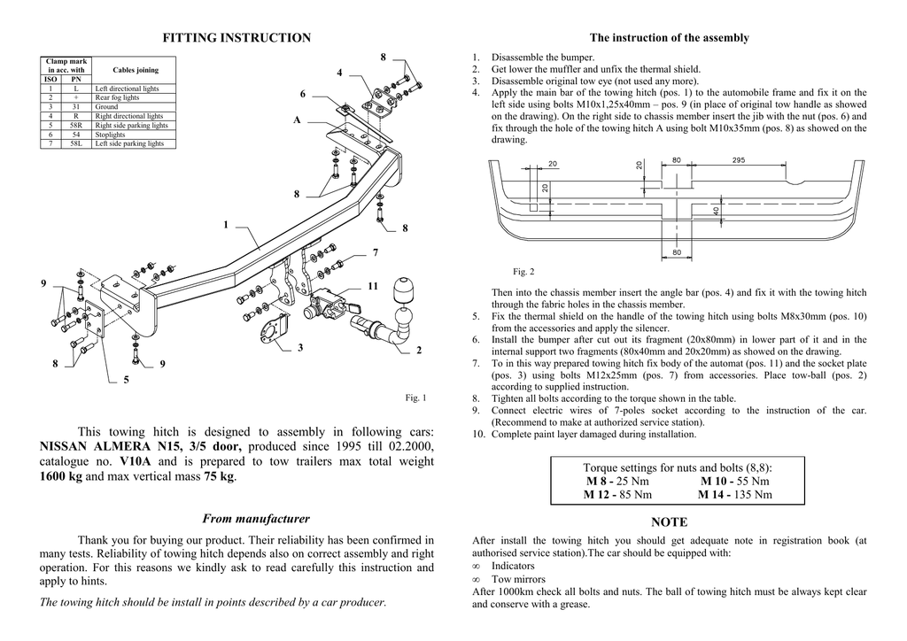 The instruction of the assembly FITTING INSTRUCTION Clamp mark in acc. with ISO PN 1 L 2 + 3 31 4 R 5 58R 6 54 7 58L 8 Cables joining 1. 2. 3. 4. 4 Left directional lights Rear fog lights Ground Right directional lights Right side parking lights Stoplights Left side parking lights 6 A Disassemble the bumper. Get lower the muffler and unfix the thermal shield. Disassemble original tow eye (not used any more). Apply the main bar of the towing hitch (pos. 1) to the automobile frame and fix it on the left side using bolts M10x1,25x40mm – pos. 9 (in place of original tow handle as showed on the drawing). On the right side to chassis member insert the jib with the nut (pos. 6) and fix through the hole of the towing hitch A using bolt M10x35mm (pos. 8) as showed on the drawing. 8 1 8 7 Fig. 2 9 11 3 8 2 9 5 Fig. 1 This towing hitch is designed to assembly in following cars: NISSAN ALMERA N15, 3/5 door, produced since 1995 till 02.2000, catalogue no. V10A and is prepared to tow trailers max total weight 1600 kg and max vertical mass 75 kg. From manufacturer Thank you for buying our product. Their reliability has been confirmed in many tests. Reliability of towing hitch depends also on correct assembly and right operation. For this reasons we kindly ask to read carefully this instruction and apply to hints. The towing hitch should be install in points described by a car producer. Then into the chassis member insert the angle bar (pos. 4) and fix it with the towing hitch through the fabric holes in the chassis member. 5. Fix the thermal shield on the handle of the towing hitch using bolts M8x30mm (pos. 10) from the accessories and apply the silencer. 6. Install the bumper after cut out its fragment (20x80mm) in lower part of it and in the internal support two fragments (80x40mm and 20x20mm) as showed on the drawing. 7. To in this way prepared towing hitch fix body of the automat (pos. 11) and the socket plate (pos. 3) using bolts M12x25mm (pos. 7) from accessories. Place tow-ball (pos. 2) according to supplied instruction. 8. Tighten all bolts according to the torque shown in the table. 9. Connect electric wires of 7-poles socket according to the instruction of the car. (Recommend to make at authorized service station). 10. Complete paint layer damaged during installation. Torque settings for nuts and bolts (8,8): M 8 - 25 Nm M 10 - 55 Nm M 12 - 85 Nm M 14 - 135 Nm NOTE After install the towing hitch you should get adequate note in registration book (at authorised service station).The car should be equipped with: • Indicators • Tow mirrors After 1000km check all bolts and nuts. The ball of towing hitch must be always kept clear and conserve with a grease. PPUH AUTO-HAK S.J. Towing hitch accessories: Produkcja Zaczepów Kulowych Henryk & Zbigniew Nejman 76-200 SŁUPSK ul. Słoneczna 16K tel/fax (059) 8-414-414; 8-414-413 Email: [email protected] www. autohak.com.pl Towing hitch (without electrical set) Class: A50-X Cat. no. V10A Designed for: Manufacturer: NISSAN Model: ALMERA Type: 3/5 door (N15) produced since 1995 till 02.2000 Technical data: D-value: 8,09 kN maximum trailer weight: 1600 kg maximum vertical cup mass: 75 kg Approval number according to Directive 94/20/EC: e20*94/20*0575*00 Foreword This towing hitch is designed according to rules of safety traffic regulations. The towing hitch is a safety component and can be install only by qualified personnel. Any alteration or conversion of the towing hitch is prohibited and would lead to cancellation of design certification. Remove insulating compound and underseal from vehicle (if present) in the area of the matting surfaces of the towing hitch. The vehicle manufacturer’s specifications regarding trailer load and max. vertical cup load are decisive for driving, and values for the towing hitch cannot be exceeded. D-value formula: Max trailer weight [kg] x Max vehicle weight [kg] Max trailer weight [kg] + Max vehicle weight [kg] X 9,81 = 1000 D [kN] Kolejność czynności przy montaŜu INSTRUKCJA montaŜu i eksploatacji zaczepu kulowego Oznaczenie zacisku wg ISO PN 1 L 2 + 3 31 4 R 5 58R 6 54 7 58L 8 1. 2. 3. 4. 4 Łączenie przewodów 6 Kierunkowskazy lewe Tylne światła przeciwmgłowe Masa Kierunkowskazy prawe Światła pozycyjne prawe Światła hamowania Światła pozycyjne lewe A Odkręcić zderzak . Opuścić tłumik z zawiesi oraz odkręcić osłonę termiczną. Odkręcić fabryczne ucho holownicze (nie będzie wykorzystane). PrzyłoŜyć belkę główną zaczepu (poz. 1) do ramy samochodu i skręcić z lewej strony śrubami M10x1,25x40mm (poz. 9) w miejscu fabrycznego uchwytu jak pokazano na rysunku. Z prawej strony, do podłuŜnicy wsunąć nakrętkę na wysięgniku (poz. 6) i skręcić przez otwór zaczepu A śrubą M10x35mm (poz. 8) jak pokazano na rysunku. 8 1 8 7 9 Rys. 2 Wycięcie zderzaka 11 3 8 2 9 5 Rys. 1 Zaczep kulowy przeznaczony jest do zamontowania w samochodzie: NISSAN ALMERA N15, 3/5 drz., produkowanym od 1995r. do 02.2000r., numer katalogowy V10A i słuŜy do ciągnięcia przyczep o masie całkowitej do 1600 kg i nacisku na kulę max 75 kg. OD PRODUCENTA Dziękujemy za wybór produkowanego przez naszą firmę zaczepu kulowego. Jego niezawodność została potwierdzona licznymi testami oraz opiniami zadowolonych klientów. JednakŜe niezawodność zaczepów kulowych jest zaleŜna równieŜ od prawidłowego montaŜu oraz prawidłowej eksploatacji. Z tego powodu prosimy Państwa o staranne przeczytanie niniejszej instrukcji montaŜu oraz przestrzeganie zawartych wskazówek. Zaczep naleŜy zamontować w miejscach do tego celu przeznaczonych przez producenta samochodu. Następnie, w podłuŜnicę wsunąć element kątowy zaczepu (poz. 4) z przyspawanymi nakrętkami M10 i skręcić z zaczepem poprzez fabryczne otwory w podłuŜnicy. 5. Przykręcić osłonę termiczną na uchu zaczepu śrubami M8x30mm (poz. 10), z wyposaŜenia oraz przykręcić tłumik. 6. Zamontować zderzak po uprzednim wycięciu w dolnej jego czę