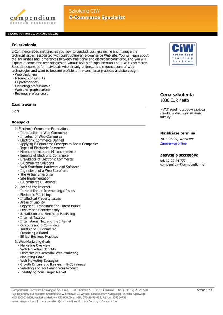 Szkolenie CIW E-Commerce Specialist SIĘGNIJ PO PROFESJONALNĄ WIEDZĘ Cel szkolenia E-Commerce Specialist teaches you how to conduct business online and manage the technical issues associated with constructing an e-commerce Web site. You will learn about the similarities and differences between traditional and electronic commerce, and you will explore e-commerce technologies at various levels of sophistication.The CIW E-Commerce Specialist course is for individuals who already understand the foundations of Web technologies and want to become proficient in e-commerce practices and site design: - Web designers - Internet consultants - IT professionals - Marketing professionals - Web and graphic artists - Business professionals Czas trwania 5 dni Cena szkolenia 1000 EUR netto +VAT zgodnie z obowiązującą stawką w dniu wystawienia faktury Konspekt 1. Electronic Commerce Foundations - Introduction to Web Commerce - Impetus for Web Commerce - Electronic Commerce Defined - Applying E-Commerce Concepts to Focus Companies - Types of Electronic Commerce - Microcommerce and Macrocommerce - Benefits of Electronic Commerce - Drawbacks of Electronic Commerce - E-Commerce Solutions - Web Storefront Hardware and Software - Ingredients of a Web Storefront - The Virtual Enterprise - Site Implementation - E-Commerce Guidelines 2. Law and the Internet - Introduction to Internet Legal Issues - Electronic Publishing - Intellectual Property Issues - Areas of Liability - Copyright, Trademark and Patent Issues - Privacy and Confidentiality - Jurisdiction and Electronic Publishing - Internet Taxation - International Tax and the Internet - Customs and E-Commerce - Tariffs and E-Commerce - Protecting a Brand - Ethical Business Practices 3. Web Marketing Goals - Marketing Overview - Web Marketing Benefits - Examples of Successful Web Marketing - Marketing Goals - Web Marketing Strategies - Growth Drivers and Barriers in E-Commerce - Selecting and Positioning Your Product - Identifying Your Target Market Compendium - Centrum Edukacyjne Sp. z o.o. | ul. Tatarska 5 | 30-103 Kraków | tel. (+48 12) 29 28 500 Sąd Rejonowy dla Krakowa-Śródmieścia w Krakowie XI Wydział Gospodarczy Krajowego Rejestru Sądowego KRS 0000039600, Kapitał zakładowy 450 000,00 zł, NIP: 676-21-71-482, Regon: 357260753 www.compendium.pl | [email protected] | (c) Copyright Compendium Najbliższe terminy 2014-06-02, Warszawa Zarezerwuj online Zapytaj o szczegóły: tel. 12 29 84 777 [email protected] Strona 1 z 4 Szkolenie CIW E-Commerce Specialist SIĘGNIJ PO PROFESJONALNĄ WIEDZĘ 4. Online Product Promotion - Online Promotion Overview - E-Commerce Promotion Considerations - E-Commerce Site Categories - Banner Ads - Advertising Representatives - Banner Ad Positioning - Banner Ad Exchange Networks - Referrer Programs - Blogs and Blogads - Pop-Up and Related Ads - Search Engine Placement - Tags and Search Engines - E-Mail and Marketing - Ad Performance Evaluation - Offline Product Promotion - Ad Campaign Implementation 5. Site Usability - Overview of Usability Issues - Usability Testing - Designing the Site Hierarchy - Page Layout Design Guidelines - Browser Compatibility Issues 6. Customer Relationship Management (CRM) and E- Services - Managing the Customer - Customer Relationship Management - Customer Service Concepts - Customer Service Tools and Methodology - E-Service Action Plan - Integrating CRM and Customer Service 7. Business-to-Business Frameworks - B2B E-Business Overview - E-Commerce Fundamentals - Business Concepts - Internet Marketplaces - Tools and Technologies - Electronic Data Interchange (EDI) - Open Buying on the Internet (OBI) - Open Trading Protocol (OTP) - Web Services 8. E-Commerce Site Creation Packages — Outsourcing - Outsourcing Site Creation Packages - Entry-Level Outsourcing: Online Instant Storefronts - Online Outsourcing Solutions - Outsourcing: Mid-Level Offline Instant Storefronts - Mid-Level Offline Storefront Products - Outsourcing: High-Level Offline Instant Storefronts - High-Level Offline Storefront Products - Auctions: The Other E-Commerce Option 9. E-Commerce Site Creation Software - Microsoft Commerce Server 2007 Overview - Web Server Overview - Microsoft Internet Information Services (IIS) 6.0 - IIS 6.0 Preparation - IIS 6.0 Installation - IIS 6.0 Configuration - Sun Java System Web Server 6.1 - Open-Source Solutions - Sizing Your Hardware Compendium - Centrum Edukacyjne Sp. z o.o. | ul. Tatarska 5 | 30-103 Kraków | tel. (+48 12) 29 28 500 Sąd Rejonowy dla Krakowa-Śródmieścia w Krakowie XI Wydział Gospodarczy Krajowego Rejestru Sądowego KRS 0000039600, Kapitał zakładowy 450 000,00 zł, NIP: 676-21-71-482, Regon: 357260753 www.compendium.pl | [email protected] | (c) Copyright Compendium Strona 2 z 4 Szkolenie CIW E-Commerce Specialist SIĘGNIJ PO PROFESJONALNĄ WIEDZĘ 10. Site Development Software Implementation - Commerce Site Development Overview - Database Servers - Commerce Site Development 11. E-Commerce Site Development Using Commerce Server - Building Commerce Solutions - Commerce Site Management - Solution Site Customization 12. Creating an Online Catalog - Catalog Design - Commerce Server 2007 Catalog Definitions - Building a Base Catalog - Virtual Catalogs - Using Commerce Server to Support B2B Commerce 13. Inventory Control and Order Processing - Inventory Management - Inventory Systems - Designing Order Systems - Order System Implementation 14. Payment Gateways - Payment Processing in E-Commerce - Choosing Payment-Processing Methods - Credit Card Processing - Managing Transactions - Implementing PayPal - Online Check Processing - Preventing Fraud 15. E-Service Implementation and Support - Implementing Customer Support - E-Mail and User Forums - Frequently Asked Questions (FAQ) Implementation - Knowledge Base 16. Transaction and Web Site Security - Overview of Transaction Security - Purposes of Security - Encryption and Decryption - Public Key Infrastructure (PKI) - X.509 Stan