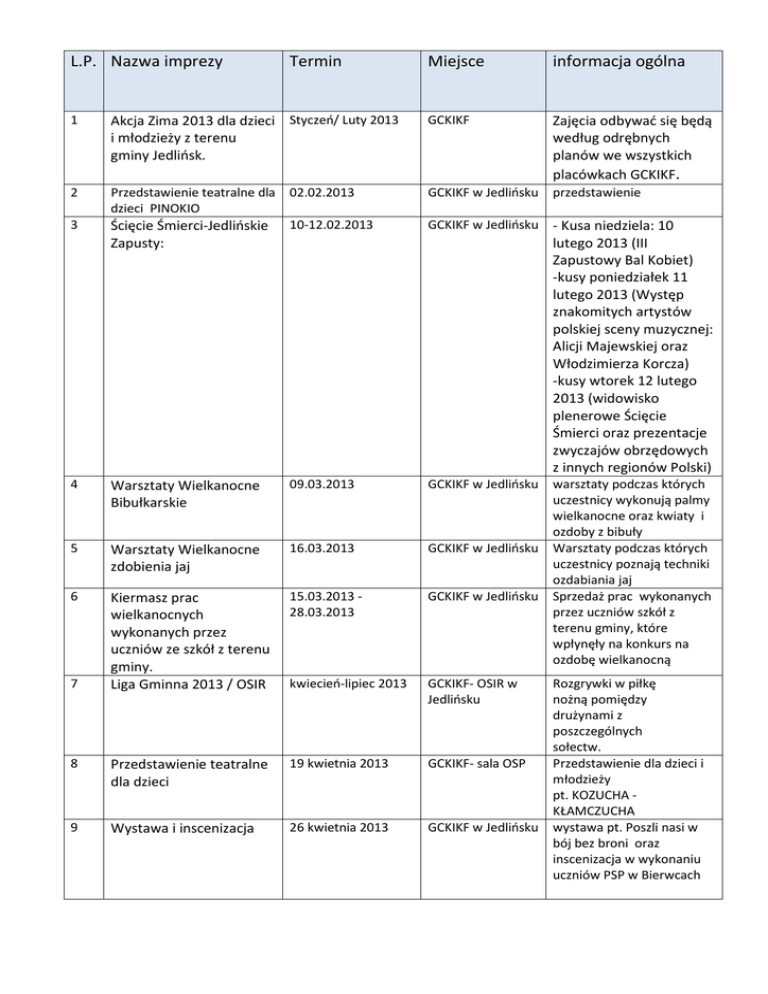 L.P. Nazwa imprezy Termin Miejsce informacja ogólna 1 Akcja Zima 2013 dla dzieci Styczeń/ Luty 2013 i młodzieży z terenu gminy Jedlińsk. GCKIKF Zajęcia odbywać się będą według odrębnych planów we wszystkich placówkach GCKIKF. 2 Przedstawienie teatralne dla 02.02.2013 dzieci PINOKIO Ścięcie Śmierci-Jedlińskie 10-12.02.2013 GCKIKF w Jedlińsku przedstawienie GCKIKF w Jedlińsku - Kusa niedziela: 10 lutego 2013 (III Zapustowy Bal Kobiet) -kusy poniedziałek 11 lutego 2013 (Występ znakomitych artystów polskiej sceny muzycznej: Alicji Majewskiej oraz Włodzimierza Korcza) -kusy wtorek 12 lutego 2013 (widowisko plenerowe Ścięcie Śmierci oraz prezentacje zwyczajów obrzędowych z innych regionów Polski) warsztaty podczas których uczestnicy wykonują palmy wielkanocne oraz kwiaty i ozdoby z bibuły Warsztaty podczas których uczestnicy poznają techniki ozdabiania jaj Sprzedaż prac wykonanych przez uczniów szkół z terenu gminy, które wpłynęły na konkurs na ozdobę wielkanocną 3 Zapusty: 4 Warsztaty Wielkanocne Bibułkarskie 09.03.2013 GCKIKF w Jedlińsku 5 Warsztaty Wielkanocne zdobienia jaj 16.03.2013 GCKIKF w Jedlińsku 6 Kiermasz prac wielkanocnych wykonanych przez uczniów ze szkół z terenu gminy. Liga Gminna 2013 / OSIR 15.03.2013 28.03.2013 GCKIKF w Jedlińsku kwiecień-lipiec 2013 GCKIKF- OSIR w Jedlińsku 8 Przedstawienie teatralne dla dzieci 19 kwietnia 2013 GCKIKF- sala OSP 9 Wystawa i inscenizacja 26 kwietnia 2013 GCKIKF w Jedlińsku 7 Rozgrywki w piłkę nożną pomiędzy drużynami z poszczególnych sołectw. Przedstawienie dla dzieci i młodzieży pt. KOZUCHA KŁAMCZUCHA wystawa pt. Poszli nasi w bój bez broni oraz inscenizacja w wykonaniu uczniów PSP w Bierwcach 10 Wyjazd do Teatru dla mieszkańców 27 Kwietnia 2013 GCKIF w Jedlińsku Wyjazd do Teatru w Lublinie organizowany dla mieszkańców gminy Jedlińsk. (wyjazd odpłatny) 11 Majówka 2013 Impreza integracyjna dla mieszkańców odbywająca się w świetlicy w Bierwieckiej Woli. 12 Maja 2013 Świetlica w Bierwieckiej Woli Impreza integracyjno –rekreacyjna Turniej rodzin szczegóły w regulaminie 12 Wystawa Maj/ Czerwiec 2013 GCKIKF w Jedlińsku Czerwiec 2013 GCKIKF/ sala OSP Czerwiec 2013 Muzeum Gombrowicza we Wsoli / Jedlińsk Wystawa prac artystycznych prezentacja umiejętności osób uczęszczających na koła zainteresowań event kulturalny 13 Dzień Działacza Kultury – 14 Apetyt (na) Gombrowicza 15 „Sobótka” 23 czerwca 2013 16 Akcja Lato 2013 Lipiec, Sierpień 2013 17 Zjazd motocyklistów 5-7 Lipca 2013 OSIR w Jedlińsku oraz Lisów GCKIKF w Jedlińsku, Lisowie , Bierwieckiej Woli, Jedlance, Ludwikowie ,OSIR w Jedlińsku OSIR w Jedlińsku Impreza kulturalna nawiązująca do dawnych tradycji Zajęcia dla dzieci i młodzieży według planów tygodniowych 18 Turniej ,, Dzikich Drużyn” – dla dzieci i młodzieży Lipiec 2013 OSIR w Jedlińsku Rozgrywki w piłce nożnej / szczegóły w regulaminie 19 Turniej siatkówki plażowej o Puchar Wójta Gminy Lipiec/Sierpień 2013 OSIR w Jedlińsku 20 Turniej Koszykówki Trio Basket Lipiec/ sierpień 2013 OSIR w Jedlińsku 21 Rajd Rowerowy Sierpień 2013 GCKIKF w Jedlińsku 22 Święto Plonów – VIII Turniej Sołectw 1 września 2013 GCKIKF Jedlińsk Rozgrywki w siatkówce plażowej / szczegóły w regulaminie Rozgrywki w koszykówkę/ szczegóły w regulaminie impreza rekreacyjnokrajoznawcza dla wszystkich miłośników aktywnego wypoczynku impreza integracyjna nawiązująca do impreza plenerowa 23 XXVI Międzynarodowy Festiwal Muzyki Organowej Wrzesień 2013 24 Obrzędy jesienne - Święto pieczonego ziemniaka Wrzesień 2013 25 Wyjazd do Teatru, Opery lub Operetki dla mieszkańców gminy Jedlińsk. Wrzesień/Październik GCKIKF w Jedlińsku 2013 26 Przedstawienie teatralne dla dzieci Październik 2013 GCKIKF w Jedlińsku 27 XVIII Konkurs Poezji Patriotycznej Listopad 2013 GCKIKF w Jedlińsku przedstawienie interaktywne dla dzieci i młodzieży konkurs poezji 28 Święto Niepodległości 11 Listopada 11 Listopada 2013 GCKIKF w Jedlińsku Święto Narodowe 29 ,,Andrzejki”- Wieczór wróżb, dyskoteka dla dzieci i młodzieży Listopad 2013 GCKIKF Jedlińsk spotkanie integracyjne dla dzieci 30 VI Mikołajkowy Turniej w Szachy i Warcaby Warsztaty- wykonanie ozdób Bożonarodzeniowych Jedlińskie spotkania z Kolędami i pastorałkami Grudzień 2013 GCKIKF w Jedlińsku turniej Grudzień 2013 GCKIKF w Jedlińsku zajęcia artystyczne Grudzień 2013 GCKIKF w Jedlińsku konkurs 33 Gminny konkurs plastyczny na ,,Ozdobę choinkową” rozstrzygnięcie konkursu Grudzień 2013 GCKIKF w Jedlińsku/ sala OSP podsumowanie konkursu 34 Wieczór Wigilijny na Rynku montaż słowno muzyczny Grudzień 2013 Rynek w Jedlińsku spotkanie okolicznościowe 35 Powitanie Nowego Roku 2014 na Rynku Grudzień 2013 Rynek w Jedlińsku impreza plenerowa /pokaz fajerwerków 31 32 Kościół pw. św. Piotra i Andrzeja w Jedlińsku Świetlica w Ludwikowie dawnych tradycji obrzędowych koncert muzyki organowej impreza integracyjna nawiązująca do dawnych tradycji Wyjazd organizowany dla mieszkańców gminy Jedlińsk. (wyjazd odpłatny)