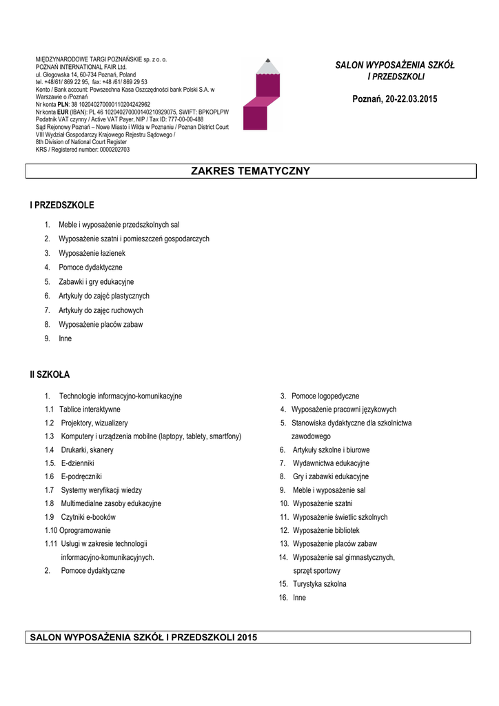 MIĘDZYNARODOWE TARGI POZNAŃSKIE sp. z o. o. POZNAŃ INTERNATIONAL FAIR Ltd. ul. Głogowska 14, 60-734 Poznań, Poland tel. +48/61/ 869 22 95, fax: +48 /61/ 869 29 53 Konto / Bank account: Powszechna Kasa Oszczędności bank Polski S.A. w Warszawie o /Poznań Nr konta PLN: 38 102040270000110204242962 Nr konta EUR (IBAN): PL 46 102040270000140210929075, SWIFT: BPKOPLPW Podatnik VAT czynny / Active VAT Payer, NIP / Tax ID: 777-00-00-488 Sąd Rejonowy Poznań – Nowe Miasto i Wilda w Poznaniu / Poznan District Court VIII Wydział Gospodarczy Krajowego Rejestru Sądowego / 8th Division of National Court Register KRS / Registered number: 0000202703 Kapitał zakładowy / Share capital: 42 310 200,00 PLN SALON WYPOSAŻENIA SZKÓŁ I PRZEDSZKOLI Poznań, 20-22.03.2015 ZAKRES TEMATYCZNY I PRZEDSZKOLE 1. Meble i wyposażenie przedszkolnych sal 2. Wyposażenie szatni i pomieszczeń gospodarczych 3. Wyposażenie łazienek 4. Pomoce dydaktyczne 5. Zabawki i gry edukacyjne 6. Artykuły do zajęć plastycznych 7. Artykuły do zajęc ruchowych 8. Wyposażenie placów zabaw 9. Inne II SZKOŁA 1. Technologie informacyjno-komunikacyjne 3. Pomoce logopedyczne 1.1 Tablice interaktywne 4. Wyposażenie pracowni językowych 1.2 Projektory, wizualizery 5. Stanowiska dydaktyczne dla szkolnictwa 1.3 Komputery i urządzenia mobilne (laptopy, tablety, smartfony) zawodowego 1.4 Drukarki, skanery 6. Artykuły szkolne i biurowe 1.5. E-dzienniki 7. Wydawnictwa edukacyjne 1.6 E-podręczniki 8. Gry i zabawki edukacyjne 1.7 Systemy weryfikacji wiedzy 9. Meble i wyposażenie sal 1.8 Multimedialne zasoby edukacyjne 10. Wyposażenie szatni 1.9 Czytniki e-booków 11. Wyposażenie świetlic szkolnych 1.10 Oprogramowanie 12. Wyposażenie bibliotek 1.11 Usługi w zakresie technologii 13. Wyposażenie placów zabaw informacyjno-komunikacyjnych. 2. Pomoce dydaktyczne 14. Wyposażenie sal gimnastycznych, sprzęt sportowy 15. Turystyka szkolna 16. Inne SALON WYPOSAŻENIA SZKÓŁ I PRZEDSZKOLI 2015
