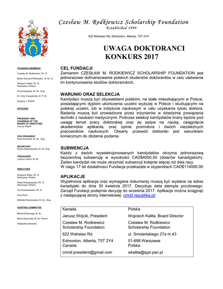 Czesław M. Rodkiewicz Scholarship Foundation Established 1999 622 Wahstao Rd, Edmonton, Alberta, T5T 2Y4 UWAGA DOKTORANCI KONKURS 2017 FOUNDING MEMBERS Czesław M. Rodkiewicz, Ph. D. Beata Goncerz-Pietraszko, B. Sc. N. Wojciech Kalita, Ph. D. Warszawa, Poland CEL FUNDACJI Zamiarem CZESŁAW M. RODKIEWICZ SCHOLARSHIP FOUNDATION jest jednorazowe dofinansowanie polskich studentów doktorantów w celu ułatwienia im kontynuowania studiów doktoranckich. Anna Kozarska, M. Sc., Eng. Dr. Artur Kruszelnicki, D. P. M. Gregory J. Rudolf OFFICERS PRESIDENT AND CHAIRMAN OF THE BOARD OF DIRECTORS Janusz Wójcik VICE-PRESIDENT Anna Kozarska, M. Sc., Eng. SECRETARY Ariana Staniszewska, M. Sc. Eng. TREASURER Justyna Janisz, M. Sc. DIRECTORS Wojciech Kalita, Ph. D. Warszawa, Poland Pawel Kołodziejczak, Ph. D. Warszawa, Poland Jan Kowalczewski, Ph. D. Anna Kura WARUNKI ORAZ SELEKCJA Kandydaci muszą być obywatelami polskimi, na stałe mieszkającymi w Polsce, posiadającymi dyplom ukończenia uczelni wyższej w Polsce i studiującymi na polskiej uczelni, lub w instytucie naukowym w celu uzyskania tytułu doktora. Badania muszą być prowadzone przez inżynierów w dziedzinie powiązania techniki z naukami medycznymi. Podczas selekcji kandydatów brany będzie pod uwagę temat pracy doktorskiej oraz jej wpływ na naukę, osiągnięcia akademickie aplikanta, oraz opinie promotora i dwóch niezależnych pracowników naukowych. Otwarty przewód doktorski jest warunkiem koniecznym do złożenia podania. SUBWENCJA Każdy z dwóch wyselekcjonowanych kandydatów otrzyma jednorazową bezzwrotną subwencję w wysokości CAD$4000.00 (dolarów kanadyjskich). Żaden kandydat nie może otrzymać subwencji kolejnie więcej niż dwa razy. W ciagu 17 lat dzialalnosci Fundacja przekazala w stypendiach CAD$114000.00 APLIKACJE Wypełniona aplikacja oraz wymagane dokumenty muszą być wysłane na adres kanadyjski do dnia 30 kwietnia 2017. Decyduje data stempla pocztowego. Zarząd Fundacji podejmie decyzję do września 2017. Aplikacje można ściągnąć z następującej strony internetowej: cmrsf.republika.pl/ Elżbieta Pasiorowska, M. Sc., Eng. AUDITING COMMITTEE Michał Dziarmaga, B. Sc. Marie Muszyński, B. Sc. Pharm Władysław Serewko Kanada Polska Janusz Wójcik, President Wojciech Kalita, Board Director Czesław M. Rodkiewicz Scholarship Foundation Czesław M. Rodkiewicz Scholarship Foundation 622 Wahstao Rd ul. Smoleńskiego 27a m.43 Edmonton, Alberta, T5T 2Y4 Canada 01-698 Warszawa Polska [email protected] [email protected]