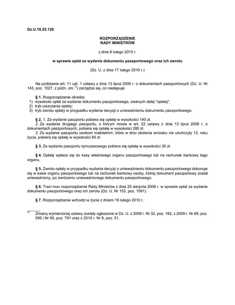 Dz.U.10.25.126 ROZPORZĄDZENIE RADY MINISTRÓW z dnia 9 lutego 2010 r. w sprawie opłat za wydanie dokumentu paszportowego oraz ich zwrotu (Dz. U. z dnia 17 lutego 2010 r.) Na podstawie art. 11 ust. 1 ustawy z dnia 13 lipca 2006 r. o dokumentach paszportowych (Dz. U. Nr 1) 143, poz. 1027, z późn. zm. ) zarządza się, co następuje: § 1. Rozporządzenie określa: 1) wysokość opłat za wydanie dokumentu paszportowego, zwanych dalej "opłatą"; 2) tryb uiszczania opłaty; 3) tryb zwrotu opłaty w przypadku wydania decyzji o unieważnieniu dokumentu paszportowego. § 2. 1. Za wydanie paszportu pobiera się opłatę w wysokości 140 zł. 2. Za wydanie drugiego paszportu, o którym mowa w art. 22 ustawy z dnia 13 lipca 2006 r. o dokumentach paszportowych, pobiera się opłatę w wysokości 280 zł. 3. Za wydanie paszportu osobom małoletnim, które w dniu złożenia wniosku nie ukończyły 13. roku życia, pobiera się opłatę w wysokości 60 zł. § 3. Za wydanie paszportu tymczasowego pobiera się opłatę w wysokości 30 zł. § 4. Opłatę wpłaca się do kasy właściwego organu paszportowego lub na rachunek bankowy tego organu. § 5. Zwrotu opłaty w przypadku wydania decyzji o unieważnieniu dokumentu paszportowego dokonuje się w kasie organu paszportowego lub na rachunek bankowy osoby, której dokument paszportowy został unieważniony, po zwróceniu unieważnionego dokumentu paszportowego. § 6. Traci moc rozporządzenie Rady Ministrów z dnia 25 sierpnia 2006 r. w sprawie opłat za wydanie dokumentu paszportowego oraz ich zwrotu (Dz. U. Nr 153, poz. 1091). § 7. Rozporządzenie wchodzi w życie z dniem 19 lutego 2010 r. ______ 1) Zmiany wymienionej ustawy zostały ogłoszone w Dz. U. z 2008 r. Nr 32, poz. 192, z 2009 r. Nr 69, poz. 595 i Nr 95, poz. 791 oraz z 2010 r. Nr 8, poz. 51.
