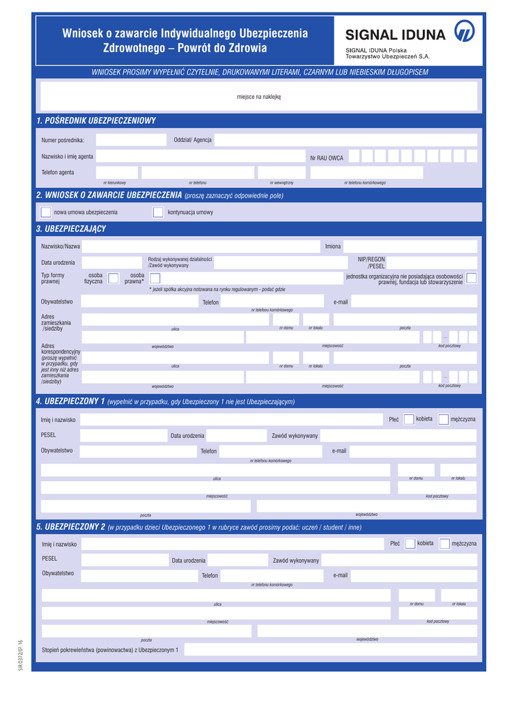 Wniosek o zawarcie Indywidualnego Ubezpieczenia Zdrowotnego – Powrót do Zdrowia WNIOSEK PROSIMY WYPEŁNIĆ CZYTELNIE, DRUKOWANYMI LITERAMI, CZARNYM LUB NIEBIESKIM DŁUGOPISEM miejsce na naklejkę 1. POŚREDNIK UBEZPIECZENIOWY Oddział/ Agencja Numer pośrednika: Nazwisko i imię agenta Nr RAU OWCA Telefon agenta nr kierunkowy nr telefonu nr wewnętrzny nr telefonu komórkowego 2. WNIOSEK O ZAWARCIE UBEZPIECZENIA (proszę zaznaczyć odpowiednie pole) nowa umowa ubezpieczenia kontynuacja umowy 3. UBEZPIECZAJĄCY Nazwisko/Nazwa Imiona Typ formy prawnej NIP/REGON /PESEL Rodzaj wykonywanej działalności /Zawód wykonywany Data urodzenia osoba fizyczna osoba prawna* jednostka organizacyjna nie posiadająca osobowości prawnej, fundacja lub stowarzyszenie * jeżeli spółka akcyjna notowana na rynku regulowanym - podać gdzie Obywatelstwo e-mail Telefon nr telefonu komórkowego Adres zamieszkania /siedziby nr domu ulica Adres korespondencyjny nr lokalu kod pocztowy miejscowość województwo (proszę wypełnić w przypadku, gdy jest inny niż adres zamieszkania /siedziby) poczta ulica nr domu nr lokalu poczta kod pocztowy miejscowość województwo 4. UBEZPIECZONY 1 (wypełnić w przypadku, gdy Ubezpieczony 1 nie jest Ubezpieczającym) Płeć Imię i nazwisko PESEL Data urodzenia Obywatelstwo kobieta mężczyzna Zawód wykonywany e-mail Telefon nr telefonu komórkowego nr domu ulica nr lokalu kod pocztowy miejscowość województwo poczta 5. UBEZPIECZONY 2 (w przypadku dzieci Ubezpieczonego 1 w rubryce zawód prosimy podać: uczeń / student / inne) Płeć Imię i nazwisko PESEL Data urodzenia Obywatelstwo kobieta mężczyzna Zawód wykonywany e-mail Telefon nr telefonu komórkowego nr domu ulica kod pocztowy SIR 0372/0?.16 miejscowość poczta Stopień pokrewieństwa (powinowactwa) z Ubezpieczonym 1 nr lokalu województwo 6. UBEZPIECZONY 3 (w przypadku dzieci Ubezpieczonego 1 w rubryce zawód prosimy podać: uczeń/ student/ inne) kobieta Płeć Imię i nazwisko PESEL Data urodzenia Obywatelstwo mężczyzna Zawód wykonywany e-mail Telefon nr telefonu komórkowego nr domu ulica nr lokalu kod pocztowy miejscowość województwo poczta Stopień pokrewieństwa (powinowactwa) z Ubezpieczonym 1 7. WNIOSKOWANY ZAKRES OCHRONY I SKŁADKI (proszę zaznaczyć wybrany zakres ochrony znakiem X we właściwym polu) Warianty Składka (zgodnie z wybranym wariantem płatności, bez uwzględnienia rabatu*) Ubezpieczony 1 Wariant 1 Wariant 2 Wariant 3 Ubezpieczony 2 Wariant 1 Wariant 2 Wariant 3 Ubezpieczony 3 Wariant 1 Wariant 2 Wariant 3 Składka miesięczna 6,67 PLN 12,14 PLN 14,22 PLN Suma *W przypadku płatności rocznych, półrocznych i kwartalnych przysługuje zniżka w wysokości odpowiednio 4%, 2% i 1%. 8. WARIANT PŁATNOŚCI I KWOTA SKŁADKI DO ZAPŁATY (proszę zaznaczyć wybrany wariant płatności znakiem X we właściwym polu) Miesięczny Kwartalny Półroczny Składka do zapłaty: Roczny Wnioskowana data rozpoczęcia ochrony ubezpieczeniowej: D D M M R R R R W przypadku wyboru wariantu płatności innego niż miesięczny, składka może różnić się o +/- 1,00 PLN od składki wskazanej na polisie. 9. OŚWIADCZENIA Oświadczam, że: 1. Oświadczam, że w ciągu ostatnich 5 lat mój wniosek o przystąpienie/ odnowienie ubezpieczenia nie został odrzucony przez żadne towarzystwo ubezpieczeniowe.* 2. Wszystkie dane zawarte w tym wniosku są prawdziwe i zgodne z moją najlepszą wiedzą. Jestem świadomy(a), że podanie informacji niezgodnych z prawdą lub zatajenie informacji stanowi naruszenie umowy ubezpieczenia i może skutkować brakiem odpowiedzialności SIGNAL IDUNA Polska Towarzystwo Ubezpieczeń S.A. 3. O świadczam, że doręczone mi zostały Ogólne Warunki Ubezpieczenia, Warunki Produktu oraz Katalog Świadczeń Gwarantowanych obowiązujące w dniu zawarcia umowy i zapoznałem(am) się z ich treścią. Zapoznałem(am) się również z treścią i zakresem pełnomocnictwa wystawionego przez SIGNAL IDUNA Polska TU S.A. pośrednikowi ubezpieczeniowemu, który przyjął wniosek. Wyrażam zgodę na przekazanie informacji o zawarciu umowy ubezpieczenia do placówek medycznych SIGNAL IDUNA Polska Towarzystwo Ubezpieczeń S.A. 4. W yrażam zgodę na występowanie w trybie przepisów art. 38 ust. 1-9 ustawy z dnia 11 września 2015 r. o działalności ubezpieczeniowej i reasekuracyjnej przez SIGNAL IDUNA Polska Towarzystwo Ubezpieczeń S.A. do podmiotów wykonujących działalność leczniczą w rozumieniu przepisów o działalności leczniczej, tudzież do innych zakładów ubezpieczeń, z pytaniami i prośbami dotyczącymi okoliczności wymienionych w powołanych przepisach ustawy o działalności ubezpieczeniowej i reasekuracyjnej (w szczególności mojego stanu zdrowia i udzielonych mi usług zdrowotnych, z wyłączeniem wyników badań genetycznych), w celach związanych z oceną ryzyka ubezpieczeniowego i weryfikacją podanych przeze mnie danych oraz ustaleniem prawa do świadczenia z zawartej umowy ubezpieczenia i wysokością tego świadczenia. Ponadto zgadzam się na występowanie do Narodowego Funduszu Zdrowia o informacje w zakresie świadczeniodawców (nazwa i adres), którzy udzielili mi świadczeń opieki zdrowotnej w związku z wypadkiem lub zdarzeniem losowym.* 5. Upoważniam personel medyczny, w tym każdego lekarza, grupową praktykę lekarską, a także każdą placówkę służby zdrowia, które posiadają o mnie informacje do ujawnienia ich treści SIGNAL IDUNA Polska Towarzystwo Ubezpieczeń S.A. oraz jego reasekuratorom, a w szczególności każdej informacji o moim stanie zdrowia, w zakresie niezbędnym do przeprowadzenia oceny ryzyka ubezpieczeniowego lub ustalenia odpowiedzialności z tytułu umowy ubezpieczenia zawartej na podstawie niniejszego wniosku oraz wyrażam zgodę na występowanie przez SIGNAL IDUNA Polska Towarzystwo Ubezpieczeń S.A. o powyższe informacje w tym o kserokopię dokumentacji medycznej do ww. podmiotów.* 6. Wyrażam zgodę na udostępnieni