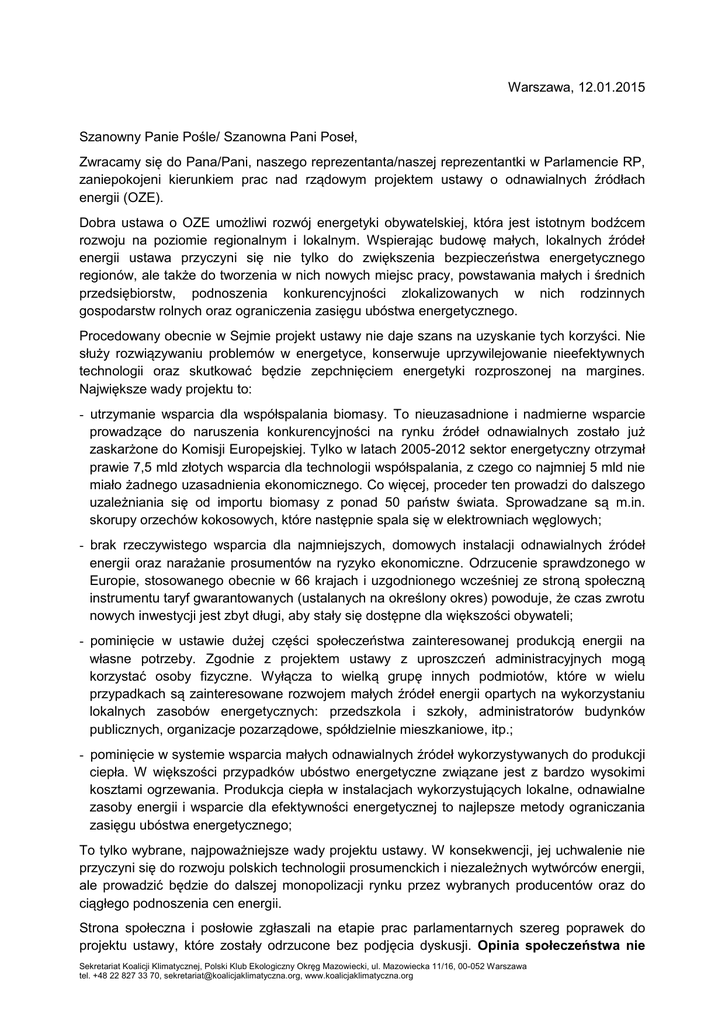Warszawa, 12.01.2015 Szanowny Panie Pośle/ Szanowna Pani Poseł, Zwracamy się do Pana/Pani, naszego reprezentanta/naszej reprezentantki w Parlamencie RP, zaniepokojeni kierunkiem prac nad rządowym projektem ustawy o odnawialnych źródłach energii (OZE). Dobra ustawa o OZE umożliwi rozwój energetyki obywatelskiej, która jest istotnym bodźcem rozwoju na poziomie regionalnym i lokalnym. Wspierając budowę małych, lokalnych źródeł energii ustawa przyczyni się nie tylko do zwiększenia bezpieczeństwa energetycznego regionów, ale także do tworzenia w nich nowych miejsc pracy, powstawania małych i średnich przedsiębiorstw, podnoszenia konkurencyjności zlokalizowanych w nich rodzinnych gospodarstw rolnych oraz ograniczenia zasięgu ubóstwa energetycznego. Procedowany obecnie w Sejmie projekt ustawy nie daje szans na uzyskanie tych korzyści. Nie służy rozwiązywaniu problemów w energetyce, konserwuje uprzywilejowanie nieefektywnych technologii oraz skutkować będzie zepchnięciem energetyki rozproszonej na margines. Największe wady projektu to: - utrzymanie wsparcia dla współspalania biomasy. To nieuzasadnione i nadmierne wsparcie prowadzące do naruszenia konkurencyjności na rynku źródeł odnawialnych zostało już zaskarżone do Komisji Europejskiej. Tylko w latach 2005-2012 sektor energetyczny otrzymał prawie 7,5 mld złotych wsparcia dla technologii współspalania, z czego co najmniej 5 mld nie miało żadnego uzasadnienia ekonomicznego. Co więcej, proceder ten prowadzi do dalszego uzależniania się od importu biomasy z ponad 50 państw świata. Sprowadzane są m.in. skorupy orzechów kokosowych, które następnie spala się w elektrowniach węglowych; - brak rzeczywistego wsparcia dla najmniejszych, domowych instalacji odnawialnych źródeł energii oraz narażanie prosumentów na ryzyko ekonomiczne. Odrzucenie sprawdzonego w Europie, stosowanego obecnie w 66 krajach i uzgodnionego wcześniej ze stroną społeczną instrumentu taryf gwarantowanych (ustalanych na określony okres) powoduje, że czas zwrotu nowych inwestycji jest zbyt długi, aby stały się dostępne dla większości obywateli; - pominięcie w ustawie dużej części społeczeństwa zainteresowanej produkcją energii na własne potrzeby. Zgodnie z projektem ustawy z uproszczeń administracyjnych mogą korzystać osoby fizyczne. Wyłącza to wielką grupę innych podmiotów, które w wielu przypadkach są zainteresowane rozwojem małych źródeł energii opartych na wykorzystaniu lokalnych zasobów energetycznych: przedszkola i szkoły, administratorów budynków publicznych, organizacje pozarządowe, spółdzielnie mieszkaniowe, itp.; - pominięcie w systemie wsparcia małych odnawialnych źródeł wykorzystywanych do produkcji ciepła. W większości przypadków ubóstwo energetyczne związane jest z bardzo wysokimi kosztami ogrzewania. Produkcja ciepła w instalacjach wykorzystujących lokalne, odnawialne zasoby energii i wsparcie dla efektywności energetycznej to najlepsze metody ograniczania zasięgu ubóstwa energetycznego; To tylko wybrane, najpoważniejsze wady projektu ustawy. W konsekwencji, jej uchwalenie nie przyczyni się do rozwoju polskich technologii prosumenckich i niezależnych wytwórców energii, ale prowadzić będzie do dalszej monopolizacji rynku przez wybranych producentów oraz do ciągłego podnoszenia cen energii. Strona społeczna i posłowie zgłaszali na etapie prac parlamentarnych szereg poprawek do projektu ustawy, które zostały odrzucone bez podjęcia dyskusji. Opinia społeczeństwa nie Sekretariat Koalicji Klimatycznej, Polski Klub Ekologiczny Okręg Mazowiecki, ul. Mazowiecka 11/16, 00-052 Warszawa tel. +48 22 827 33 70, [email protected], www.koalicjaklimatyczna.org powinna być ignorowana, dlatego domagamy się wprowadzenia do ustawy zmian zapewniających wsparcie energetyce obywatelskiej. Podstawowe z nich to: 1. wprowadzenie taryf gwarantowanych dla najmniejszych źródeł prosumenckich, 2. rozszerzenie definicji prosumenta o inne podmioty, np.: spółdzielnie, wspólnoty mieszkaniowe, szkoły, 3. stworzenia warunków do rozwoju produkcji ciepła z rozproszonych odnawialnych źródeł 4. wycofanie się z dalszego wspierania wielkoskalowego współspalania biomasy. Bez powyższych zmian ustawa o OZE nie powinna zostać przyjęta. W sytuacji, w której co najmniej 50% polskiego społeczeństwa chce zostać producentem ciepła i energii elektrycznej, opowiedzenie się po stronie społeczeństwa będzie ważnym argumentem w przypadku starania się o ponowny wybór do Sejmu jesienią 2015 roku. Lista sygnatariuszy: Urszula Stefanowicz, Rzecznik ds. politycznych Koalicji Klimatycznej Członkowie: Fundacja Aeris Futuro, Fundacja ClientEarth Poland, Fundacja Efektywnego Wykorzystania Energii, Fundacja Ekologiczna Arka, Fundacja Ekologiczna Ziemi Legnickiej Zielona Akcja, Fundacja EkoRozwoju FER, Fundacja GAP Polska, Fundacja Greenpeace Polska, Fundacja Na Rzecz Zrównoważonego Rozwoju, Instytut na rzecz Ekorozwoju, Liga Ochrony Przyrody, Polski Klub Ekologiczny Okręg Dolnośląski, Polski Klub Ekologiczny Okręg Górnośląski, Polski Klub Ekologiczny Okręg Mazowiecki, Polski Klub Ekologiczny Okręg Świętokrzyski, Polski Klub Ekologiczny Okręg Wschodnio-Pomorski, Pracownia na rzecz Wszystkich Istot, Stowarzyszenie Ekologiczne Eko-Unia, Stowarzyszenie Ekologiczno-Kulturalne Klub Gaja, Społeczny Instytut Ekologiczny, WWF Polska, Zielone Mazowsze, Związek Stowarzyszeń Polska Zielona Sieć. Grzegorz Wiśniewski, Prezes, Instytut Energetyki Odnawialnej Mariusz Wójcik, Członek Zarządu – Dyrektor Fundacji, Fundacja na rzecz Energetyki Zrównoważonej Monika Szymańska, Prezes, Fundacja na rzecz Rozwoju Polskiego Rolnictwa Rafał Górski, Prezes Zarządu, Instytut Spraw Obywatelskich Mieczysław Koch, Wiceprezes Zarządu, Stowarzyszenie Energii Odnawialnej (SEO) Krzysztof Gorczyca, Prezes, Towarzystwo dla Natury i Człowieka. Sekretariat Koalicji Kl