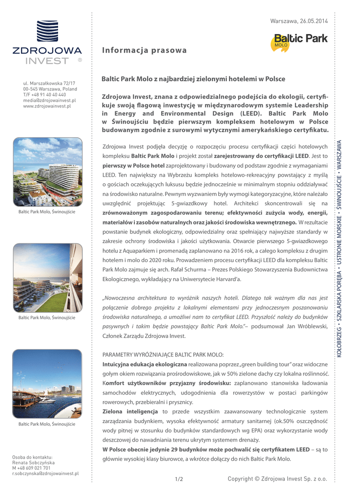 Warszawa, 26.05.2014 Informacja prasowa Baltic Park Molo z najbardziej zielonymi hotelemi w Polsce LEED. Ten największy na Wybrzeżu kompleks hotelowo-rekreacyjny powstający z myślą o gościach oczekujących luksusu będzie jednocześnie w minimalnym stopniu oddziaływać na środowisko naturalne. Pewnym wyzwaniem były wymogi kategoryzacyjne, które należało uwzględnić Baltic Park Molo, Świnoujście projektując 5-gwiazdkowy hotel. Architekci skoncentrowali się na zrównoważonym zagospodarowaniu terenu; efektywności zużycia wody, energii, materiałów i zasobów naturalnych oraz jakości środowiska wewnętrznego. W rezultacie powstanie budynek ekologiczny, odpowiedzialny oraz spełniający najwyższe standardy w zakresie ochrony środowiska i jakości użytkowania. Otwarcie pierwszego 5-gwiazdkowego hotelu z Aquaparkiem i promenadą zaplanowano na 2016 rok, a całego kompleksu z drugim hotelem i molo do 2020 roku. Prowadzeniem procesu certyfikacji LEED dla kompleksu Baltic Park Molo zajmuje się arch. Rafał Schurma – Prezes Polskiego Stowarzyszenia Budownictwa Ekologicznego, wykładający na Uniwersytecie Harvard’a. „Nowoczesna architektura to wyróżnik naszych hoteli. Dlatego tak ważnym dla nas jest połączenie dobrego projektu z lokalnymi elementami przy jednoczesnym poszanowaniu Baltic Park Molo, Świnoujście środowiska naturalnego, a umożliwi nam to certyfikat LEED. Przyszłość należy do budynków pasywnych i takim będzie powstający Baltic Park Molo.”– podsumował Jan Wróblewski, Członek Zarządu Zdrojowa Invest. PARAMETRY WYRÓŻNIAJĄCE BALTIC PARK MOLO: Intuicyjna edukacja ekologiczna realizowana poprzez „green building tour” oraz widoczne gołym okiem rozwiązania prośrodowiskowe, jak w 50% zielone dachy czy lokalna roślinność. Komfort użytkowników przyjazny środowisku: zaplanowano stanowiska ładowania samochodów elektrycznych, udogodnienia dla rowerzystów w postaci parkingów rowerowych, przebieralni i prysznicy. Zielona inteligencja to przede wszystkim zaawansowany technologicznie system Baltic Park Molo, Świnoujście zarządzania budynkiem, wysoka efektywność armatury sanitarnej (ok.50% oszczędność wody pitnej w stosunku do budynków standardowych wg EPA) oraz wykorzystanie wody deszczowej do nawadniania terenu ukrytym systemem drenaży. W Polsce obecnie jedynie 29 budynków może pochwalić się certyfikatem LEED – są to Osoba do kontaktu: Renata Sobczyńska M +48 609 021 701 [email protected] głównie wysokiej klasy biurowce, a wkrótce dołączy do nich Baltic Park Molo. 1/2 Copyright © Zdrojowa Invest Sp. z o.o. ŚWINOUJŚCIE pierwszy w Polsce hotel zaprojektowany i budowany od podstaw zgodnie z wymaganiami USTRONIE MORSKIE kompleksu Baltic Park Molo i projekt został zarejestrowany do certyfikacji LEED. Jest to SZKLARSKA PORĘBA Zdrojowa Invest podjęła decyzję o rozpoczęciu procesu certyfikacji części hotelowych WARSZAWA Zdrojowa Invest, znana z odpowiedzialnego podejścia do ekologii, certyfikuje swoją flagową inwestycję w międzynarodowym systemie Leadership in Energy and Environmental Design (LEED). Baltic Park Molo w Świnoujściu będzie pierwszym kompleksem hotelowym w Polsce budowanym zgodnie z surowymi wytycznymi amerykańskiego certyfikatu. KOŁOBRZEG ul. Marszałkowska 72/17 00-545 Warszawa, Poland T/F +48 91 40 40 440 [email protected] www.zdrojowainvest.pl O deweloperze Zdrojowa Invest to dynamicznie rozwijający się rodzinny, kołobrzeski holding inwestycyjno-deweloperski i hotelarski w segmencie second home. Największy deweloper apartamentów wakacyjnych i sieć condo hoteli, których jest również pionierem w Polsce. ul. Marszałkowska 72/17 00-545 Warszawa, Poland T/F +48 91 40 40 440 [email protected] www.zdrojowainvest.pl Naszym głównym produktem są obiekty apartamentowo-hotelowe i usługowe z opcjonalnym systemem zarządzania wynajmem, czyli apartamenty na sprzedaż z gwarancją zysku dla Kupującego i możliwością korzystania z apartamentu na własne potrzeby. Wszystkie inwestycje mają charakter premium, a realizowane są w najpiękniejszych polskich miejscowościach wypoczynkowych i tylko w topowych lokalizacjach. największych polskich podmiotów gospodarczych „Rzeczpospolitej” – Lista 2000. Natomiast kołobrzeski Marine Hotel*****, którego jest inwestorem, był centrum pobytowym Reprezentacji Królestwa Danii podczas Euro 2012. i środowisko w ramach, odpowiednio, programu Zdrojowa Art i Zdrojowa Eco Friendly. Więcej informacji na: www.zdrojowainvest.pl Baltic Park Molo, Świnoujście Ściągnij logotypy i zdjęcia naszych inwestycji w wysokiej rozdzielczości z: www.zdrojowainvest.pl SZKLARSKA PORĘBA zakładka: Biuro Prasowe >> Pobierz multimedia USTRONIE MORSKIE ŚWINOUJŚCIE Zdrojowa Invest jest grupą odpowiedzialną społecznie, troszczącą się o rozwój sztuki WARSZAWA Zdrojowa Invest odnosi liczne sukcesy. M.in. w 2011 roku znalazła się w zestawieniu KOŁOBRZEG Baltic Park Molo, Świnoujście Baltic Park Molo, Świnoujście Osoba do kontaktu: Renata Sobczyńska M +48 609 021 701 [email protected] 2/2 Copyright © Zdrojowa Invest Sp. z o.o.