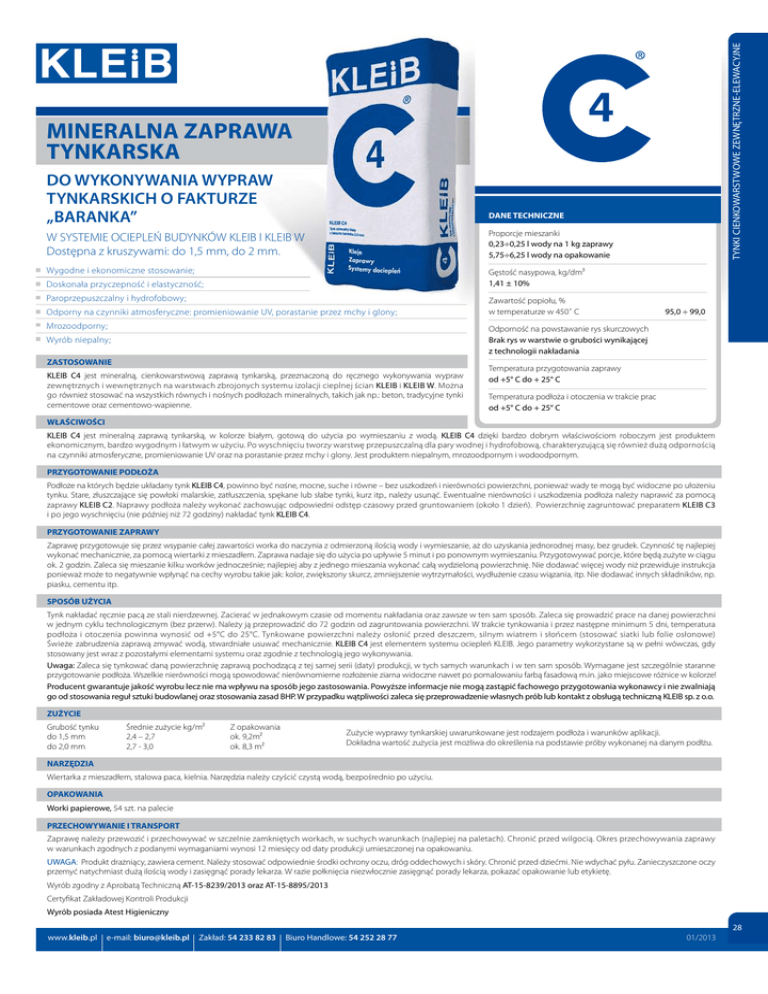 TYNKI CIENKOWARSTWOWE ZEWNĘTRZNE-ELEWACYJNE MINERALNA ZAPRAWA TYNKARSKA DO WYKONYWANIA WYPRAW TYNKARSKICH O FAKTURZE „BARANKA” DANE TECHNICZNE W SYSTEMIE OCIEPLEŃ BUDYNKÓW KLEIB I KLEIB W Dostępna z kruszywami: do 1,5 mm, do 2 mm. Proporcje mieszanki 0,23÷0,25 l wody na 1 kg zaprawy 5,75÷6,25 l wody na opakowanie Wygodne i ekonomiczne stosowanie; Gęstość nasypowa, kg/dm³ 1,41 ± 10% Doskonała przyczepność i elastyczność; Paroprzepuszczalny i hydrofobowy; Odporny na czynniki atmosferyczne: promieniowanie UV, porastanie przez mchy i glony; Mrozoodporny; Zawartość popiołu, % w temperaturze w 450˚ C 95,0 ÷ 99,0 Odporność na powstawanie rys skurczowych Brak rys w warstwie o grubości wynikającej z technologii nakładania Wyrób niepalny; ZASTOSOWANIE KLEIB C4 jest mineralną, cienkowarstwową zaprawą tynkarską, przeznaczoną do ręcznego wykonywania wypraw zewnętrznych i wewnętrznych na warstwach zbrojonych systemu izolacji cieplnej ścian KLEIB i KLEIB W. Można go również stosować na wszystkich równych i nośnych podłożach mineralnych, takich jak np.: beton, tradycyjne tynki cementowe oraz cementowo-wapienne. Temperatura przygotowania zaprawy od +5° C do + 25° C Temperatura podłoża i otoczenia w trakcie prac od +5° C do + 25° C WŁAŚCIWOŚCI KLEIB C4 jest mineralną zaprawą tynkarską, w kolorze białym, gotową do użycia po wymieszaniu z wodą. KLEIB C4 dzięki bardzo dobrym właściwościom roboczym jest produktem ekonomicznym, bardzo wygodnym i łatwym w użyciu. Po wyschnięciu tworzy warstwę przepuszczalną dla pary wodnej i hydrofobową, charakteryzującą się również dużą odpornością na czynniki atmosferyczne, promieniowanie UV oraz na porastanie przez mchy i glony. Jest produktem niepalnym, mrozoodpornym i wodoodpornym. PRZYGOTOWANIE PODŁOŻA Podłoże na których będzie układany tynk KLEIB C4, powinno być nośne, mocne, suche i równe – bez uszkodzeń i nierówności powierzchni, ponieważ wady te mogą być widoczne po ułożeniu tynku. Stare, złuszczające się powłoki malarskie, zatłuszczenia, spękane lub słabe tynki, kurz itp., należy usunąć. Ewentualne nierówności i uszkodzenia podłoża należy naprawić za pomocą zaprawy KLEIB C2. Naprawy podłoża należy wykonać zachowując odpowiedni odstęp czasowy przed gruntowaniem (około 1 dzień). Powierzchnię zagruntować preparatem KLEIB C3 i po jego wyschnięciu (nie później niż 72 godziny) nakładać tynk KLEIB C4. PRZYGOTOWANIE ZAPRAWY Zaprawę przygotowuje się przez wsypanie całej zawartości worka do naczynia z odmierzoną ilością wody i wymieszanie, aż do uzyskania jednorodnej masy, bez grudek. Czynność tę najlepiej wykonać mechanicznie, za pomocą wiertarki z mieszadłem. Zaprawa nadaje się do użycia po upływie 5 minut i po ponownym wymieszaniu. Przygotowywać porcje, które będą zużyte w ciągu ok. 2 godzin. Zaleca się mieszanie kilku worków jednocześnie; najlepiej aby z jednego mieszania wykonać całą wydzieloną powierzchnię. Nie dodawać więcej wody niż przewiduje instrukcja ponieważ może to negatywnie wpłynąć na cechy wyrobu takie jak: kolor, zwiększony skurcz, zmniejszenie wytrzymałości, wydłużenie czasu wiązania, itp. Nie dodawać innych składników, np. piasku, cementu itp. SPOSÓB UŻYCIA Tynk nakładać ręcznie pacą ze stali nierdzewnej. Zacierać w jednakowym czasie od momentu nakładania oraz zawsze w ten sam sposób. Zaleca się prowadzić prace na danej powierzchni w jednym cyklu technologicznym (bez przerw). Należy ją przeprowadzić do 72 godzin od zagruntowania powierzchni. W trakcie tynkowania i przez następne minimum 5 dni, temperatura podłoża i otoczenia powinna wynosić od +5°C do 25°C. Tynkowane powierzchni należy osłonić przed deszczem, silnym wiatrem i słońcem (stosować siatki lub folie osłonowe) Świeże zabrudzenia zaprawą zmywać wodą, stwardniałe usuwać mechanicznie. KLEIB C4 jest elementem systemu ociepleń KLEIB. Jego parametry wykorzystane są w pełni wówczas, gdy stosowany jest wraz z pozostałymi elementami systemu oraz zgodnie z technologią jego wykonywania. Uwaga: Zaleca się tynkować daną powierzchnię zaprawą pochodzącą z tej samej serii (daty) produkcji, w tych samych warunkach i w ten sam sposób. Wymagane jest szczególnie staranne przygotowanie podłoża. Wszelkie nierówności mogą spowodować nierównomierne rozłożenie ziarna widoczne nawet po pomalowaniu farbą fasadową m.in. jako miejscowe różnice w kolorze! Producent gwarantuje jakość wyrobu lecz nie ma wpływu na sposób jego zastosowania. Powyższe informacje nie mogą zastąpić fachowego przygotowania wykonawcy i nie zwalniają go od stosowania reguł sztuki budowlanej oraz stosowania zasad BHP. W przypadku wątpliwości zaleca się przeprowadzenie własnych prób lub kontakt z obsługą techniczną KLEIB sp. z o.o. ZUŻYCIE Grubość tynku do 1,5 mm do 2,0 mm Średnie zużycie kg/m² 2,4 – 2,7 2,7 - 3,0 Z opakowania ok. 9,2m² ok. 8,3 m² Zużycie wyprawy tynkarskiej uwarunkowane jest rodzajem podłoża i warunków aplikacji. Dokładna wartość zużycia jest możliwa do określenia na podstawie próby wykonanej na danym podłżu. NARZĘDZIA Wiertarka z mieszadłem, stalowa paca, kielnia. Narzędzia należy czyścić czystą wodą, bezpośrednio po użyciu. OPAKOWANIA Worki papierowe, 54 szt. na palecie PRZECHOWYWANIE I TRANSPORT Zaprawę należy przewozić i przechowywać w szczelnie zamkniętych workach, w suchych warunkach (najlepiej na paletach). Chronić przed wilgocią. Okres przechowywania zaprawy w warunkach zgodnych z podanymi wymaganiami wynosi 12 miesięcy od daty produkcji umieszczonej na opakowaniu. UWAGA: Produkt drażniący, zawiera cement. Należy stosować odpowiednie środki ochrony oczu, dróg oddechowych i skóry. Chronić przed dziećmi. Nie wdychać pyłu. Zanieczyszczone oczy przemyć natychmiast dużą ilością wody i zasięgnąć porady lekarza. W razie