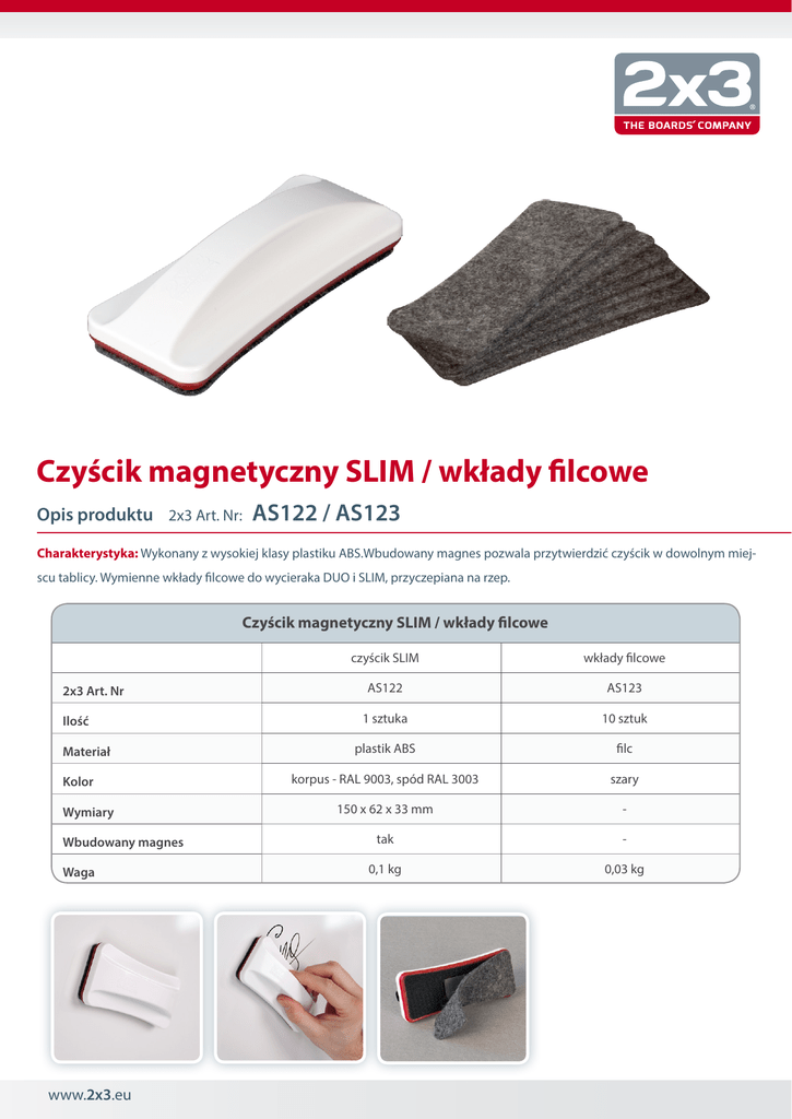 Czyścik magnetyczny SLIM / wkłady filcowe Opis produktu 2x3 Art. Nr: AS122 / AS123 Charakterystyka: Wykonany z wysokiej klasy plastiku ABS.Wbudowany magnes pozwala przytwierdzić czyścik w dowolnym miejscu tablicy. Wymienne wkłady filcowe do wycieraka DUO i SLIM, przyczepiana na rzep. Czyścik magnetyczny SLIM / wkłady filcowe 2x3 Art. Nr Ilość Materiał Kolor Wymiary Wbudowany magnes Waga www.2x3.eu czyścik SLIM wkłady filcowe AS122 AS123 1 sztuka 10 sztuk plastik ABS filc korpus - RAL 9003, spód RAL 3003 szary 150 x 62 x 33 mm - tak - 0,1 kg 0,03 kg
