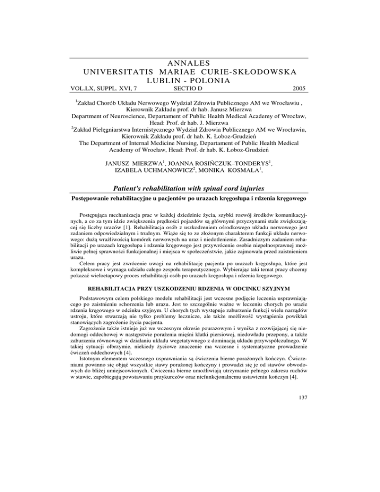 ANNALES UNIVERSITATIS MARIAE CURIE-SKŁODOWSKA LUBLIN - POLONIA VOL.LX, SUPPL. XVI, 7 SECTIO D 2005 1 Zakład Chorób Układu Nerwowego Wydział Zdrowia Publicznego AM we Wrocławiu , Kierownik Zakładu prof. dr hab. Janusz Mierzwa Department of Neuroscience, Departament of Public Health Medical Academy of Wrocław, Head: Prof. dr hab. J. Mierzwa 2 Zakład Pielęgniarstwa Internistycznego Wydział Zdrowia Publicznego AM we Wrocławiu, Kierownik Zakładu prof. dr hab. K. Łoboz-Grudzień The Department of Internal Medicine Nursing, Departament of Public Health Medical Academy of Wrocław, Head: Prof. dr hab. K. Łoboz-Grudzień JANUSZ MIERZWA1, JOANNA ROSIŃCZUK–TONDERYS1, IZABELA UCHMANOWICZ2, MONIKA KOSMALA1, Patient's rehabilitation with spinal cord injuries Postępowanie rehabilitacyjne u pacjentów po urazach kręgosłupa i rdzenia kręgowego Postępująca mechanizacja prac w każdej dziedzinie życia, szybki rozwój środków komunikacyjnych, a co za tym idzie zwiększenia prędkości pojazdów są głównymi przyczynami stale zwiększającej się liczby urazów [1]. Rehabilitacja osób z uszkodzeniem ośrodkowego układu nerwowego jest zadaniem odpowiedzialnym i trudnym. Wiąże się to ze złożonym charakterem funkcji układu nerwowego: dużą wrażliwością komórek nerwowych na uraz i niedotlenienie. Zasadniczym zadaniem rehabilitacji po urazach kręgosłupa i rdzenia kręgowego jest przywrócenie osobie niepełnosprawnej możliwie pełnej sprawności funkcjonalnej i miejsca w społeczeństwie, jakie zajmowała przed zaistnieniem urazu. Celem pracy jest zwrócenie uwagi na rehabilitację pacjenta po urazach kręgosłupa, które jest kompleksowe i wymaga udziału całego zespołu terapeutycznego. Wybierając taki temat pracy chcemy pokazać wieloetapowy proces rehabilitacji osób po urazach kręgosłupa i rdzenia kręgowego. REHABILITACJA PRZY USZKODZENIU RDZENIA W ODCINKU SZYJNYM Podstawowym celem polskiego modelu rehabilitacji jest wczesne podjęcie leczenia usprawniającego po zaistnieniu schorzenia lub urazu. Jest to szczególnie ważne w leczeniu chorych po urazie rdzenia kręgowego w odcinku szyjnym. U chorych tych występuje zaburzenie funkcji wielu narządów ustroju, które stwarzają nie tylko problemy lecznicze, ale także możliwość wystąpienia powikłań stanowiących zagrożenie życia pacjenta. Zagrożenie także istnieje już we wczesnym okresie pourazowym i wynika z rozwijającej się niedomogi oddechowej w następstwie porażenia mięśni klatki piersiowej, niedowładu przepony, a także zaburzenia równowagi w działaniu układu wegetatywnego z dominacją układu przywspółczulnego. W takiej sytuacji olbrzymie, niekiedy życiowe znaczenie ma wczesne i systematyczne prowadzenie ćwiczeń oddechowych [4]. Istotnym elementem wczesnego usprawniania są ćwiczenia bierne porażonych kończyn. Ćwiczeniami powinno się objąć wszystkie stawy porażonej kończyny i prowadzi się je od stawów obwodowych do bliżej umiejscowionych. Ćwiczenia bierne umożliwiają utrzymanie pełnego zakresu ruchów w stawie, zapobiegają powstawaniu przykurczów oraz niefunkcjonalnemu ustawieniu kończyn [4]. 137 U chorych z porażeniem niecałkowitym lub postępującą poprawą neurologiczną, ustępowaniem porażeń, konieczne jest wdrożenie ćwiczeń czynnych. Przy śladowym ruchu czynnym egzekwuje się skurcze izometryczne, stopniowo przechodząc do ćwiczeń w odciążeniu [4]. Kolejnym etapem są ćwiczenia wolne (bez wspomagania) będące formą przejściową od ćwiczeń z odciążeniem do ćwiczeń z oporem. Ważną rolę odgrywa też wczesna pionizacja chorego, zarówno ze względów pielęgnacyjnych (poprawa trofiki tkanek, profilaktyka odleżyn, powikłań płucnych) jak i dążenie do odtworzenia ruchu postawy [4]. Pionizację bierną zaczyna się w miarę możliwości już w pierwszych dniach po urazie kręgosłupa, od uniesienia od strony głowy łóżka lub stołu pionizacyjnego pod kątem 30º [4]. W okresie tym rozpoczyna się również ćwiczenia ogólnokondycyjne, mające na celu zwiększenie ogólnej sprawności chorego, wytrzymałości, tolerancji przedłużonego wysiłku, wzmocnienie czynnych grup mięśni. Po przygotowaniu ogólnokondycyjnym, jeśli stan neurologiczny na to pozwala, rozpoczyna się pionizację czynną i naukę chodzenia. U pacjentów po urazie rdzenia szyjnego poprawa neurologiczna dotyczy zazwyczaj w większym stopniu kończyn dolnych niż górnych. Dlatego naukę chodzenia w takich przypadkach należy rozpocząć od poruszania się chorego z pomocą wysokiego balkonika z podpasznikami. Chorzy z porażeniem lub głębokim niedowładem czterokończynowym mają ograniczone możliwości lokomocyjne poruszania się na wózku inwalidzkim [4]. REHABILITACJA CHORYCH PO USZKODZENIU RDZENIA W ODCINKU PIERSIOWYM I LĘDŹWIOWYM Uszkodzenia rdzenia w odcinku piersiowym i lędźwiowym nie powodują zaburzenia funkcji kończyn górnych, co u chorych porażonych pozwala na dobre przystosowanie do trybu życia w wózku inwalidzkim. Szanse leczenia i pełnej samoobsługi są tym większe im niższy jest poziom uszkodzenia układu nerwowego i im mniejsze jest nasilenie zaburzeń neurologicznych. Dlatego tak ważne znaczenie już w okresie wczesnym po urazie mają ćwiczenia miejscowe, których celem jest poprawienie sprawności, zwiększenie zakresów ruchów i siły mięśni kończyn czy narządu, którego funkcje zostały zaburzone w następstwie choroby czy urazu. Do tej grupy ćwiczeń zaliczamy [3]: 1) ćwiczenia bierne, 2) ćwiczenia czynne, 3) ćwiczenia specjalne. Ćwiczenia bierne są wykonywane przez osobę usprawniającą bez udziału chorego. Stosowane są u osób z porażeniami lub znacznymi niedowładami zarówno o charakterze wiotkim jak i spastycznym. Celem ich jest utrzymanie pełnego zakresu ruchów w stawie, zapobieganie powstawaniu przykurczów torebkowych i więzadłowych oraz utrzymanie właściwej długości i elastyczności mię