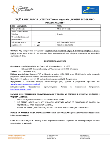 : CZĘŚĆ 1. DEKLARACJA UCZESTNICTWA w wyprawie „WIOSNA BEZ GRANIC PTASZYSKA 2016" IMIĘ I NAZWISKO: Data urodzenia: Adres zamieszkania: Telefon: W razie konieczności powiadomić: Zgłoszenie wraz z asystentem: PESEL: M-ce urodzenia: E-mail: TAK NIE Jeśli TAK podać imię i nazwisko asystenta: UWAGA! Aby wziąć udział w wyjeździe asystent musi wypełnić CZĘŚĆ 2. Deklaracji znajdującą się na końcu. W pierwszej kolejności akceptowani będą asystenci osób potrzebujących wsparcia we wszystkich czynnościach dnia. INFORMACJE O WYJEŹDZIE Organizator: Fundacja Podróże Bez Granic, ul. Warszawska 43/1, 81-309 Gdynia/ GIFT Centrum Podróży, ul. Wąwozowa 18, 02-798 Warszawa Termin: 15 – 17 kwietnia 2016, Zbiórka uczestników: Dworzec PKP w Koninie w piątek 15.04.2016 o ok. 17.30 lub dla osób chcących przyjechać samodzielnie w miejscu zakwaterowania około 18:00. Uczestnicy: 15 osób, w tym 12 - 13 osób z niepełnosprawnością i 2-3 asystentów. Wyżywienie: 2 śniadania/ kolacja/ obiado-kolacja/ grill, zgodnie z programem opisanym na: www.fundacja.podrozebezgranic.pl Zakwaterowanie: Gospodarstwo agroturystyczne: Ranczo w miejscowości Wrąbczynek http://www.agroranczo.pl/ ZAZNACZ JEŚLI POTRZEBUJESZ ZAKWATEROWANIA W POKOJU NA PARTERZE Z SZERSZYMI WEJŚCIAMI I WIĘKSZĄ ŁAZIENKĄ: POTRZEBUJĘ POKOJU NA PARTERZE I WIĘKSZEJ ŁAZIENKI NIE BĘDZIE ŁATWO, ALE PRZY WSPARCIU ASYSTENTA WEJDĘ PO SCHODACH DO POKOJU NA PIĘTRZE I DAM RADĘ ZE ZWYKŁĄ ŁAZIENKĄ NIE MA PROBLEMU, POKÓJ NA PIĘTRZE ZE STANDARDOWĄ ŁAZIENKĄ MI ODPOWIADA. POKOJE NA PARTERZE NIE SĄ W DOSŁOWNYM SENSIE DOSTOSOWANE (brak uchwytów i dostosowanych kabin prysznicowych) CENA WYJAZDU: 100,00 zł - dotyczy osób z niepełnosprawnością. Asystenci nie ponoszą żadnych kosztów uczestnictwa w wyjeździe. Fundacja Podróże bez Granic www.PodróżeBezGranic.pl [email protected] ul. Warszawska 43/1 81-309 Gdynia +48 692 44 51 88 KRS: 0000441552 REGON: 221789255 NIP: 586-228-01-64 : Warunkiem uczestnictwa jest przesłanie prawidłowo wypełnionej dekl-aracji do dnia 1 kwietnia 2016 na adres: [email protected] z TEMATEM MAILA: Imię i nazwiskoWiosna bez Granic lub pocztą na adres Fundacji. Z otrzymanych zgłoszeń Zespół Fundacji wyłoni najbardziej motywowaną i zróżnicowaną grupę pod kątem wieku, doświadczenia, stopnia i rodzaju niepełnosprawności. O wyniku rekrutacji osoby zgłaszające się zostaną poinformowane drogą mailową do dnia 4 kwietnia. Po potwierdzeniu uczestnictwa, należy uiścić opłatę za wyjazd w terminie do 8 kwietnia 2016. W przypadku braku wpłaty w określonym terminie na wyjazd zakwalifikowania zostanie osoba z listy rezerwowej. Dane do przelewu: Fundacja Podróże bez Granic, ul. Warszawska 43/1, 81-309 Gdynia mBank: 96 1140 2017 0000 4702 1297 1748 Tytułu przelewu: Imię i nazwisko_Wiosna bez Granic W przypadku rezygnacji z wyjazdu, opłata może zostać zwrócona wyłącznie gdy na wolne miejsce zostanie zakwalifikowany inny uczestnik i uiści pełną opłatę. W przypadku braku chętnych w odpowiedzi na ogłoszenie fundacji, nową osobę może wskazać uczestnik rezygnujący, zastępująca go osoba musi jednak spełniać wszystkie wymagania wynikające z warunków wyjazdu. a. Organizator nie ponosi odpowiedzialności za pieniądze i rzeczy wartościowe uczestników, b. Uczestnik wycieczki korzysta i czynnie uczestniczy we wszystkich zajęciach organizowanych przez organizatora i stosuje się do regulaminu placówki noclegowej, c. Uczestnik ponosi materialną odpowiedzialność za szkody powstałe z winy uczestnika, INFORMACJE DODATKOWE: Informacje w tej części formularze będą stanowić podstawę do zakwalifikowania uczestników na wyjazd. Naszym celem jest aby grupa była jak najbardziej zmotywowana i gotowa na aktywne uczestnictwo we wszystkich jego aspektach. Chcemy także aby grupa była w jak największym stopniu zróżnicowana pod kątem stopnia i rodzaju niepełnosprawności, płci i wieku. MOTYWACJA DO WYJAZDU – opisz dlaczego chcesz z nami pojechać: Fundacja Podróże bez Granic www.PodróżeBezGranic.pl [email protected] ul. Warszawska 43/1 81-309 Gdynia +48 692 44 51 88 KRS: 0000441552 REGON: 221789255 NIP: 586-228-01-64 : CZY WCZEŚNIEJ UCZESTNICZYŁAŚ/UCZESTNICZYŁEŚ W JAKICHŚ IMPREZACH LUB WYJAZDACH O CHARAKTERZE REKREACYJNYM I SPORTOWYM? – jeśli tak to w jakich i jak często? Czy były one organizowane przez jakąś Fundację/ organizację? CZY W TRUDNYM WYBOISTYM TERENIE BĘDZIESZ W STANIE SAMODZIELNIE TRZYMAĆ SIĘ UCHWYTÓW W SAMOCHODZIE I UTRZYMAĆ STABILNĄ, SIEDZĄCĄ POZYCJĘ PIONOWĄ? a) TAK – stabilne siedzenie nie stanowi dla mnie żadnego problemu b) NIE – potrzebuję spionizowania dodatkowymi pasami SKĄD BĘDZIESZ DO NAS JECHAĆ? (proszę podać nazwę miasta/ miejscowości/wsi – pole OBOWIĄZKOWE, niezbędne do logistycznego zaplanowania wyjazdu. W JAKI SPOSÓB DOWIEDZIAŁAŚ(EŚ) SIĘ O NINIEJSZYM WYJEŹDZIE FUNDACJI PODRÓŻE BEZ GRANIC? Opis niepełnosprawności i stopień samodzielności - informacje niezbędne do logistycznego zaplanowania wyjazdu i wsparcia opiekunów w uwzględnieniem indywidualnych potrzeb – bardzo prosimy o szczegółowy opis niepełnosprawności i stopnia samodzielności w zakresie samoobsługi, codziennych czynności życiowych, sposób poruszania się. Opis sposobu poruszania się, sprawności kończyn górnych i dolnych. Stopień radzenia sobie z jedzeniem, codzienną toaletą.: Fundacja Podróże bez Granic www.PodróżeBezGranic.pl [email protected] ul. Warszawska 43/1 81-309 Gdynia +48 692 44 51 88 KRS: 0000441552 REGON: 221789255 NIP: 586-228-01-64 : Jakiego wsparcia potrzebujesz ze strony swojego asystenta lub/i organizatorów, aby móc w pełni i najbardziej komfortowo uczestniczyć w wyjeździe? Czy oprócz schorzenia będącego bezpośrednią przyczyną Twojej niepełnosprawności masz jakieś schorzenia towarzyszące lub specjalne potrzeby np. dietę? (jeśli tak proszę