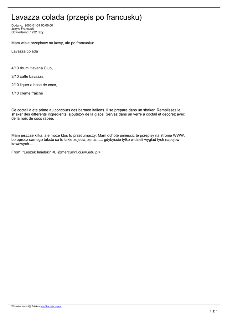 Lavazza colada (przepis po francusku) Dodano: 2000-01-01 00:00:00 Język: Francuski Odwiedzono: 1222 razy. Mam wiele przepisow na kawy, ale po francusku: Lavazza colada 4/10 rhum Havana Club, 3/10 caffe Lavazza, 2/10 liquer a base de coco, 1/10 creme fraiche Ce coctail a ete prime au concours des barmen italiens. Il se prepare dans un shaker. Remplissez le shaker des differents ingredients, ajoutez-y de la glace. Servez dans un verre a coctail et decorez avec de la noix de coco rapee. Mam jeszcze kilka, ale moze ktos to przetlumaczy. Mam ochote umiescic te przepisy na stronie WWW, bo oprocz samego tekstu sa tu takie zdjecia, ze az...... gdybyscie tylko widzieli wyglad tych napojow kawowych..... From: "Leszek Imielski" <[email protected]> Wirtualna Kuchni@ Polska - http://kuchnia.now.pl przepis nr 3175, plik wygenerowano 2017.03.08 18:57 1z1
