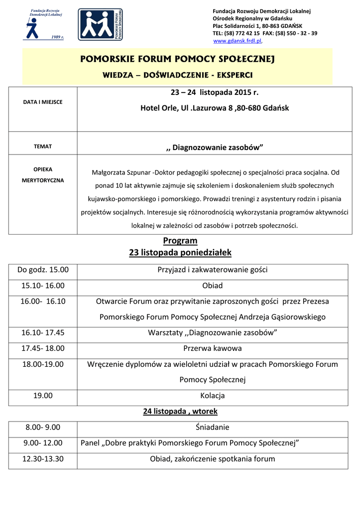 Fundacja Rozwoju Demokracji Lokalnej Ośrodek Regionalny w Gdańsku Plac Solidarności 1, 80-863 GDAŃSK TEL: (58) 772 42 15 FAX: (58) 550 - 32 - 39 www.gdansk.frdl.pl, 23 – 24 listopada 2015 r. DATA I MIEJSCE Hotel Orle, Ul .Lazurowa 8 ,80-680 Gdańsk TEMAT ,, Diagnozowanie zasobów” OPIEKA Małgorzata Szpunar -Doktor pedagogiki społecznej o specjalności praca socjalna. Od MERYTORYCZNA ponad 10 lat aktywnie zajmuje się szkoleniem i doskonaleniem służb społecznych kujawsko-pomorskiego i pomorskiego. Prowadzi treningi z asystentury rodzin i pisania projektów socjalnych. Interesuje się różnorodnością wykorzystania programów aktywności lokalnej w zależności od zasobów i potrzeb społeczności. Program 23 listopada poniedziałek Do godz. 15.00 Przyjazd i zakwaterowanie gości 15.10- 16.00 Obiad 16.00- 16.10 Otwarcie Forum oraz przywitanie zaproszonych gości przez Prezesa Pomorskiego Forum Pomocy Społecznej Andrzeja Gąsiorowskiego 16.10- 17.45 Warsztaty ,,Diagnozowanie zasobów” 17.45- 18.00 Przerwa kawowa 18.00-19.00 Wręczenie dyplomów za wieloletni udział w pracach Pomorskiego Forum Pomocy Społecznej 19.00 Kolacja 24 listopada , wtorek 8.00- 9.00 9.00- 12.00 12.30-13.30 Śniadanie Panel „Dobre praktyki Pomorskiego Forum Pomocy Społecznej” Obiad, zakończenie spotkania forum Fundacja Rozwoju Demokracji Lokalnej Ośrodek Regionalny w Gdańsku Plac Solidarności 1, 80-863 GDAŃSK TEL: (58) 772 42 15 FAX: (58) 550 - 32 - 39 www.gdansk.frdl.pl, KARTA ZGŁOSZENIA Pomorskie Forum Pomocy Społecznej, Wyspa Sobieszewska 23-24 listopada 2015 Imię i nazwisko uczestnika: ……………................................................………………………………………… Dane do faktury: Nazwa instytucji zgłaszającej: Adres instytucji: NIP: ………….................. Telefon komórkowy do osoby zgłoszonej: ………………………………………….…… Koszt uczestnictwa: □ – osoba zrzeszona w Pomorskim Forum Pomocy Społecznej 250 zł □ – osoba niezrzeszona w Pomorskim Forum Pomocy Społecznej 350 zł (proszę zaznaczyć odpowiedni kwadracik) ........................................ miejscowość i data, podpis ...................................... pieczęć urzędu