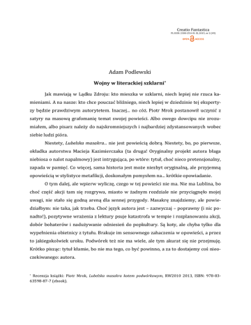 Creatio Fantastica PL ISSN: 2300-2514 R. XI, 2015, nr 2 (49) Adam Podlewski Wojny w literackiej szklarni* Jak mawiają w Lądku Zdroju: kto mieszka w szklarni, niech lepiej nie rzuca kamieniami. A na nasze: kto chce pouczać bliźniego, niech lepiej w dziedzinie tej ekspertyzy będzie prawdziwym autorytetem. Inaczej... no cóż. Piotr Mrok postanowił uczynić z satyry na masową grafomanię temat swojej powieści. Albo owego dowcipu nie zrozumiałem, albo pisarz należy do najskromniejszych i najbardziej zdystansowanych wobec siebie ludzi pióra. Niestety, Lubelska masakra... nie jest powieścią dobrą. Niestety, bo, po pierwsze, okładka autorstwa Macieja Kazimierczaka (ta druga! Oryginalny projekt autora błaga niebiosa o nalot napalmowy) jest intrygująca, po wtóre: tytuł, choć nieco pretensjonalny, zapada w pamięć. Co więcej, sama historia jest może niezbyt oryginalną, ale przyjemną opowieścią w stylistyce metafikcji, doskonałym pomysłem na... krótkie opowiadanie. O tym dalej, ale wpierw wyliczę, czego w tej powieści nie ma. Nie ma Lublina, bo choć część akcji tam się rozgrywa, miasto w żadnym rozdziale nie przyciągnęło mojej uwagi, nie stało się godną areną dla sennej przygody. Masakrę znajdziemy, ale powiedziałbym: nie taka, jak trzeba. Choć język autora jest – zazwyczaj – poprawny (i nic ponadto!), pozytywne wrażenia z lektury psuje katastrofa w tempie i rozplanowaniu akcji, dobór bohaterów i nadużywanie odniesień do popkultury. Są koty, ale chyba tylko dla wypełnienia obietnicy z tytułu. Brakuje im sensownego zahaczenia w opowieści, a przez to jakiegokolwiek uroku. Podwórek też nie ma wiele, ale tym akurat się nie przejmuję. Krótko pisząc: tytuł kłamie, bo nie ma tego, co być powinno, a za to dostajemy coś nieoczekiwanego: autora. Recenzja książki: Piotr Mrok, Lubelska masakra kotem podwórkowym, RW2010 2013, ISBN: 978-8363598-87-7 (ebook). * Mroka jest tu zbyt wiele. Zbyt wiele zbędnych słów, długie rozciąganie akcji, na pewno w niedopuszczalnej dawce autor zwierza się ze swoich przygód z literaturą, maskując to opowieścią. Fantazyjna historia o pisarzu, który wpada w kłopoty przez bohaterów własnych utworów, może być dobrą kanwą do napisania czegoś przyjemnego, a nawet mądrego (jak stare, ale wciąż dobre Portrety jego dzieci George’a R. R. Martina), byleby autor nie wypracował zbyt wysokiego mniemania o sile tego konceptu. A Piotr Mrok napawa się przez setki cyfrowych stron tym prostym schematem. Nawet taki marudny czytelnik jak ja byłby skłonny owe rozcieńczenie mu wybaczyć, gdyby pisarz zaprezentował w nim coś więcej: dobry język, humor albo chociaż wewnętrznie spójny pomysł na akcję. Nie zaprezentował, a co więcej, postanowił się przed czytelnikiem z tej niedoróbki wytłumaczyć. Lubelska masakra... to historia młodego autora porwanego do krainy wyobraźni przez swoich bohaterów. Wielki świat fantazji radzi sobie sam, rządzony przez Imperatora Paula Atrydę, w jego skład wchodzą dzielnice fabuł Dicka czy innych tytanów fantazji. Akcja powieści rozgrywa się na pograniczu Unii Krain Literackich oraz luźnej konfederacji Grafomanów. Autor skromnie (ale i fachowo) umieszcza kraik swojej twórczości na kresach literatury, ale jeszcze po tej stronie limesu, oddzielony od pustyń fanfiction i potworków szufladowych. Pomyślana zapewne jako efektowna groteska, akcja Lubelskiej masakry... szybko zmienia się w korowód z trudem powiązanych scen, przerywanych przemyśleniami autora na temat literatury (niezbyt odkrywczymi, ale czasem zaskakującymi autokrytycyzmem). Poznajemy poczet sztampowych bohaterów (przecież specjalnie sztampowych, to powieść meta, nieprawdaż?), legion szybko starzejących się odniesień do kultury popularnej oraz obowiązkowy wątek romansowy i trochę młodzieńczego emo-pamiętnika pisarza. I gdy wreszcie ta nudna podróż w dobrze znane rejony zbliża się do końca, Piotr Mrok postanawia wykręcić pierwszy zabawny dowcip czytelnikom; dodajmy: zabawny tylko z perspektywy autora – pisze kawałek dobrej prozy. Dołączone jako urozmaicenie opowiadanie Suchariasza stanowi jedyny literacko udany fragment tej fabularnej masakry. Czytając je, przez chwilę się nawet zastawiałem, czy autor nie jest złośliwym geniuszem, który z całej swej powieści czyni satyrę na grafomaństwo, a na koniec pokazuje, że jak chce, to pisać porządną fantastykę potrafi. Nie odrzuciłem całkiem tej hipotezy; czeka ona w moim umyśle, tuż pod powierzchnią oceanu prawdopodobieństwa. Być może zweryfikuję swoje sądy, sięgając kiedyś po inny ty- tuł Mroka. Do tego jednak potrzebuję jakiejś przynęty, choćby w postaci kolejnego dobrego tytułu i następnej efektownej okładki.
