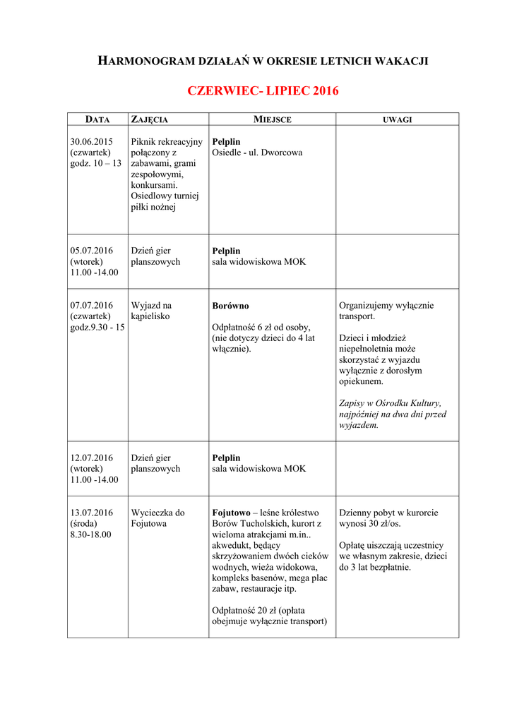 HARMONOGRAM DZIAŁAŃ W OKRESIE LETNICH WAKACJI CZERWIEC- LIPIEC 2016 DATA ZAJĘCIA MIEJSCE UWAGI 30.06.2015 Piknik rekreacyjny Pelplin (czwartek) połączony z Osiedle - ul. Dworcowa godz. 10 – 13 zabawami, grami zespołowymi, konkursami. Osiedlowy turniej piłki nożnej 05.07.2016 (wtorek) 11.00 -14.00 Dzień gier planszowych 07.07.2016 Wyjazd na (czwartek) kąpielisko godz.9.30 - 15 Pelplin sala widowiskowa MOK Borówno Odpłatność 6 zł od osoby, (nie dotyczy dzieci do 4 lat włącznie). Organizujemy wyłącznie transport. Dzieci i młodzież niepełnoletnia może skorzystać z wyjazdu wyłącznie z dorosłym opiekunem. Zapisy w Ośrodku Kultury, najpóźniej na dwa dni przed wyjazdem. 12.07.2016 (wtorek) 11.00 -14.00 Dzień gier planszowych Pelplin sala widowiskowa MOK 13.07.2016 (środa) 8.30-18.00 Wycieczka do Fojutowa Fojutowo – leśne królestwo Borów Tucholskich, kurort z wieloma atrakcjami m.in.. akwedukt, będący skrzyżowaniem dwóch cieków wodnych, wieża widokowa, kompleks basenów, mega plac zabaw, restauracje itp. Odpłatność 20 zł (opłata obejmuje wyłącznie transport) Dzienny pobyt w kurorcie wynosi 30 zł/os. Opłatę uiszczają uczestnicy we własnym zakresie, dzieci do 3 lat bezpłatnie. 14.07.2016 Wyjazd na (czwartek) kąpielisko godz.9.30 - 15 Borówno Odpłatność 6 zł od osoby, (nie dotyczy dzieci do 4 lat włącznie). Organizujemy wyłącznie transport. Dzieci i młodzież niepełnoletnia może skorzystać z wyjazdu wyłącznie z dorosłym opiekunem. Zapisy w Ośrodku Kultury, najpóźniej na dwa dni przed wyjazdem. 19.07.2016 (wtorek) 11.00-13.00 Zajęcia animacyjne Rudno – plac rekreacyjny przy Zajęcia poprowadzą dla dzieci Ośrodku Zdrowia instruktorzy Szkoły Tańca STAKATO z Tczewa 20.07.2016 (środa) 11.00-13.00 Zajęcia animacyjne Lignowy Szlacheckie dla dzieci Plac przy świetlicy wiejskiej 21.07.2016 Wyjazd na (czwartek) kąpielisko godz.9.30 - 15 Borówno Odpłatność 6 zł od osoby, (nie dotyczy dzieci do 4 lat włącznie). Zajęcia poprowadzą instruktorzy Szkoły Tańca STAKATO z Tczewa Organizujemy wyłącznie transport. Dzieci i młodzież niepełnoletnia może skorzystać z wyjazdu wyłącznie z dorosłym opiekunem. Zapisy w Ośrodku Kultury, najpóźniej na dwa dni przed wyjazdem. 22.07.2016 (piątek) 9.30 – 17.30 Wycieczka. Wyjazd do Aquaparku w Sopocie. Sopot Odpłatność: 15 zł/os. (opłata obejmuje wyłącznie transport) Trzygodzinny pobyt w Aquaparku 38 zł/os. Opłatę uiszczają uczestnicy we własnym zakresie, dzieci do 3 lat bezpłatnie. Dzieci i młodzież niepełnoletnia wyłącznie z dorosłym opiekunem. Zapisy w Ośrodku Kultury, najpóźniej tydzień przed wyjazdem. W drodze powrotnej postój w MC Donald’s. 26.07.2016 (środa) 11.00 - 13.00 Zajęcia animacyjne Gręblin dla dzieci Plac przy świetlicy wiejskiej Zajęcia poprowadzą instruktorzy Szkoły Tańca STAKATO z Tczewa 27.07.2016 (środa) 7.00 - 21.00 Wycieczka do Ustki Ustka - spacer po Ustce, latarnia morska, ustecka syrenka, molo, zwiedzanie bunkrów po II wojnie światowej, plażowanie Opłata obejmuje koszt transportu, przewodnika, bilety wstępu. Odpłatność 65 zł/os 28.07.2016 Wyjazd na (czwartek) kąpielisko godz.9.30 - 15 28.07.2016 (czwartek) Widowisko teatralne – „Pod starym Wawelem 12.45 – 13.30 przygód bez liku”, legenda o złym smoku i sprytnym szewczyku Borówno Odpłatność 6 zł od osoby, (nie dotyczy dzieci do 4 lat włącznie). Janiszewo – świetlica wiejska Wstęp wolny. Widowisko Rajkowy – świetlica wiejska teatralne – „Skradzione Wstęp wolny. 14.00 – 14.45 mądrości” to pełna humoru i akcji opowieść, że każda przeczytana książka jest prawdziwą historią Organizujemy wyłącznie transport. Dzieci i młodzież niepełnoletnia może skorzystać z wyjazdu wyłącznie z dorosłym opiekunem. Zapisy w Ośrodku Kultury, najpóźniej na dwa dni przed wyjazdem Widowisko w wykonaniu aktorów Teatru Edukacji i Profilaktyki „MASKA” z Krakowa 28.07.2016 (czwartek) Widowisko w wykonaniu aktorów Teatru Edukacji i Profilaktyki „MASKA” z Krakowa 28.07.2016 (czwartek) Bielawki – świetlica wiejska Widowisko w wykonaniu Widowisko teatralne – „Rycerz i bestia”. 15.30 – 16.15 Spektakl o ekologii, ochronie środowiska, utrzymaniu czystości. Wstęp wolny. 30.07.2016 Zajęcia animacyjne Rożental –świetlica wiejska (sobota) dla dzieci 18.00 – 20.00 aktorów Teatru Edukacji i Profilaktyki „MASKA” z Krakowa Zajęcia poprowadzą instruktorzy Szkoły Tańca STAKATO z Tczewa UWAGA!!! Zapisy na wyjazdy: Zapisy osób chętnych na wyjazdy przyjmujemy w biurze Miejskiego Ośrodka Kultury w Pelplinie, ul. Kościuszki 2A od poniedziałku do piątku w godz. 8.00 – 15.00. Decyduje kolejność zgłoszeń. Przy zapisach wymagana wpłata! Ośrodek Kultury zastrzega prawo dokonania zmian w harmonogramie; może zostać poszerzony o dodatkowe zajęcia lub zmieniony ze względu na złą pogodę albo nieprzewidziane okoliczności. …………………………………………………………………………………………………………………… W sierpniu planujemy wycieczki: KRAKÓW i Energylandii w Zatorze (3 dni) ŁEBA - Słowińskiego Park Narodowy, rejs statkiem na wydmy; TORUŃ – miasto piernika i Kopernika, planetarium HEL - rejs statkiem z Gdańska AQUAPARKw Kwidzynie i Sopocie Ponadto: W sierpniu animator zabaw odwiedzi dzieci w Międzyłężu, Wielkim Garcu, Kulicach i Ropuchach. W okresie wakacji letnich zapraszamy również do udziału w festynach wiejskich. Najbliższy odbędzie się 2 lipca 2016 r. w Janiszewie. AKTUALNOŚCI zawsze na: www.mok.pelplin.pl na tablicy informacyjnej obok poczty na tablicach informacyjnych w sołectwach