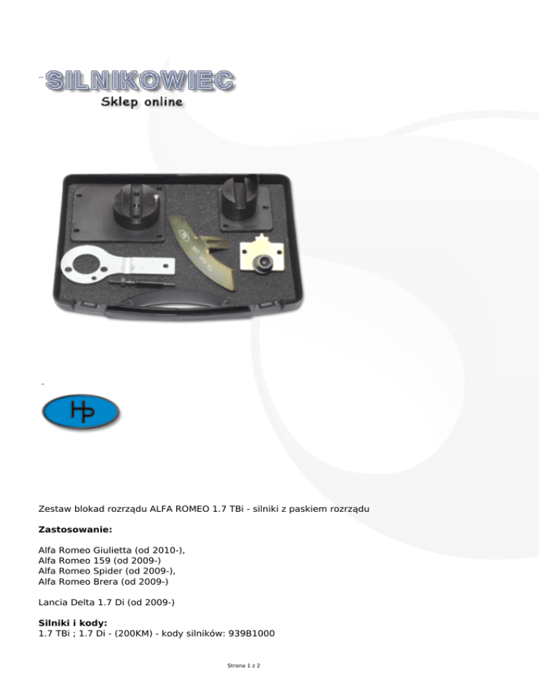 Zestaw blokad rozrządu ALFA ROMEO 1.7 TBi - silniki z paskiem rozrządu Zastosowanie: Alfa Alfa Alfa Alfa Romeo Romeo Romeo Romeo Giulietta (od 2010-), 159 (od 2009-) Spider (od 2009-), Brera (od 2009-) Lancia Delta 1.7 Di (od 2009-) Silniki i kody: 1.7 TBi ; 1.7 Di - (200KM) - kody silników: 939B1000 Strona 1 z 2 1.7 TBi ; 1.7 Di - (235KM) - kody silników: 940A1000 - silniki z paskiem rozrzadu Strona 2 z 2
