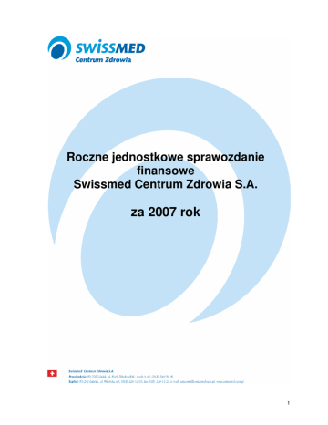 Roczne jednostkowe sprawozdanie finansowe Swissmed Centrum Zdrowia S.A. za 2007 rok 1 Swissmed Centrum Zdrowia S.A. Roczne jednostkowe sprawozdanie finansowe Swissmed Centrum Zdrowia S.A. za okres od 01.01.2007 r. do 31.12.2007 r. (kwoty wyrażone są w tys. zł, o ile nie podano inaczej SPIS TREŚCI I. WYBRANE DANE FINANSOWE, ZAWIERAJĄCE PODSTAWOWE POZYCJE JEDNOSTKOWEGO SPRAWOZDANIA FINANSOWEGO ......................................................................3 II. JEDNOSTKOWE SPRAWOZDANIE FINANSOWE ZA 2007 ROK ....................................................4 II.I. WSTĘP DO JEDNOSTKOWEGO SPRAWOZDANIA FINANSOWEGO ZA 2007 ROK...... 4 II.II. JEDNOSTKOWY BILANS NA DZIEŃ 31 GRUDNIA 2007 ROKU ....................................... 7 II.III. JEDNOSTKOWY RACHUNEK ZYSKÓW I STRAT SWISSMED CENTRUM ZDROWIA S.A. ZA 2007 ROK .......................................................................................................................... 8 II.IV. ZESTAWIENIE ZMIAN W KAPITALE WŁASNYM ZA 2007 ROK ....................................... 9 II.V. RACHUNEK PRZEPŁYWÓW PIENIĘŻNYCH ZA 2007 ROK ............................................ 10 II.VI. INFORMACJA DODATKOWA DO JEDNOSTKOWEGO SPRAWOZDANIA FINANSOWEGO ZA OKRES OD 01.01.2007 r. DO 31.12.2007 r. .............................................. 11 1. ZASADY PRZYJĘTE PRZY SPORZĄDZANIU JEDNOSTKOWEGO SPRAWOZDANIA FINANSOWEGO ZA 2007 ROK.....................................................................................................11 2. ZASADY ZARZĄDZANIA RYZYKIEM ORAZ DZIAŁANIA ZABEZPIECZAJĄCE .......................19 3. WAŻNE OSZACOWANIA I OSĄDY KSIĘGOWE .........................................................................19 4. NOTY OBJAŚNIAJĄCE DO ROCZNEGO JEDNOSTKOWEGO SPRAWOZDANIA FINANSOWEGO SWISSMED CENTRUM ZDROWIA S.A. ZA OKRES OD 01.01.2007 r. DO 31.12.2007 r.............................................................................20 5. POZOSTAŁE DANE OBJAŚNIAJĄCE..........................................................................................34 2 Swissmed Centrum Zdrowia S.A. Roczne jednostkowe sprawozdanie finansowe Swissmed Centrum Zdrowia S.A. za okres od 01.01.2007 r. do 31.12.2007 r. (kwoty wyrażone są w tys. zł, o ile nie podano inaczej I. WYBRANE DANE FINANSOWE, ZAWIERAJĄCE PODSTAWOWE POZYCJE JEDNOSTKOWEGO SPRAWOZDANIA FINANSOWEGO (RÓWNIEŻ PRZELICZONE NA EURO) WYBRANE DANE FINANSOWE Swissmed Centrum Zdrowia S.A. w tys. zł 2007 w tys. EUR 2006 2007 2006 Przychody netto ze sprzedaży produktów, towarów i usług 22 430 17 398 5 939 4 462 Zysk ( strata) z działalności operacyjnej -3 547 -7 904 -939 -2 027 Zysk ( strata ) przed opodatkowaniem -3 800 -9 148 -1 006 -2 346 Zysk netto, z tego przypadający -3 467 -10 278 -918 -2 636 akcjonariuszom podmiotu dominującego -3 467 -10 278 -918 -2 636 Przepływy pieniężne netto z działalności operacyjnej -3 836 -6 483 -1 016 -1 663 Przepływy pieniężne netto z działalności inwestycyjnej -4 484 -1 908 -1 187 -489 Przepływy pieniężne netto z działalności finansowej -2 480 19 734 -657 5 061 -10 800 11 343 -2 860 2 909 35 093 42 467 9 797 11 085 5 072 8 979 1 416 2 344 Przepływy pieniężne netto razem Aktywa razem Zobowiązania i rezerwy na zobowiązania Zobowiązania długoterminowe 702 894 196 233 Zobowiązania krótkoterminowe 4 370 8 085 1 220 2 110 Kapitał własny 30 021 33 488 8 381 8 741 Kapitał przypadający akcjonariuszom podmiotu dominującego 30 021 33 488 8 381 8 741 Kapitał akcyjny 47 595 47 595 13 287 12 423 47 594 839 47 594 839 47 594 839 47 594 839 -0,07 -0,37 -0,02 -0,09 0,63 0,70 0,18 0,18 Liczba akcji Zysk ( strata ) na jedną akcję zwykłą (zł) Wartość księgowa na jedną akcję (w zł /EUR) Do wyliczenia wielkości w EURO zastosowano następujące kursy: OPIS 2007 2006 Kurs średni NBP (przeliczenie pozycji rachunku zysków i strat oraz rachunku przepływów pieniężnych) 3,7768 3,8991 Kurs na ostatni dzień okresu (przeliczenie pozycji bilansu) 3,5820 3,8312 a) przychody netto ze sprzedaży produktów, towarów i materiałów, zysk z działalności operacyjnej, zysk brutto i zysk netto oraz przepływy pieniężne netto z działalności operacyjnej, przepływy pieniężne netto z działalności inwestycyjnej, przepływy pieniężne netto z działalności finansowej i przepływy pieniężne netto za okres od 01.01.2007 roku do 31.12.2007 roku, obliczono przyjmując średni kurs EURO według kursu stanowiącego średnią arytmetyczną średnich kursów NBP na ostatni dzień poszczególnych 12 miesięcy 2007 roku, tj.: 3,7768 PLN/EURO, b) przychody netto ze sprzedaży produktów, towarów i materiałów, zysk z działalności operacyjnej, zysk brutto i zysk netto oraz przepływy pieniężne netto z działalności operacyjnej, przepływy pieniężne netto z działalności inwestycyjnej, przepływy pieniężne netto z działalności finansowej i przepływy pieniężne netto za okres porównywalny, tj. od 01.01.2006 roku do 31.12.2006 roku, obliczono przyjmując średni kurs EURO według kursu stanowiącego średnią arytmetyczną średnich kursów NBP na ostatni dzień poszczególnych 12 miesięcy 2006 roku, tj.: 3,8991 PLN/EURO, c) aktywa razem, zobowiązania i rezerwy na zobowiązania, zobowiązania długoterminowe, zobowiązania krótkoterminowe, kapitał własny oraz kapitał zakładowy na 31.12.2007 roku obliczono przyjmując średni kurs EURO ogłoszony przez NBP na dzień 31.12.2007 roku tj. 3,5820 PLN/EURO, d) aktywa razem, zobowiązania i rezerwy na zobowiązania, zobowiązania długoterminowe, zobowiązania krótkoterminowe, kapitał własny oraz kapitał zakładowy na 31.12.2006 roku obliczono przyjmując średni kurs EURO ogłoszony przez NBP na dzień 31.12.2006 roku tj. 3,8312 PLN/EURO. 3 Swissmed Centrum Zdrowia S.A. Roczne jednostkowe sprawozdanie finansowe Swissmed Centrum Zdrowia S.A. za okres od 01.01.2007 r. do 31.12.2007 r. (kwoty wyrażone są w tys. zł, o ile nie podano inacz