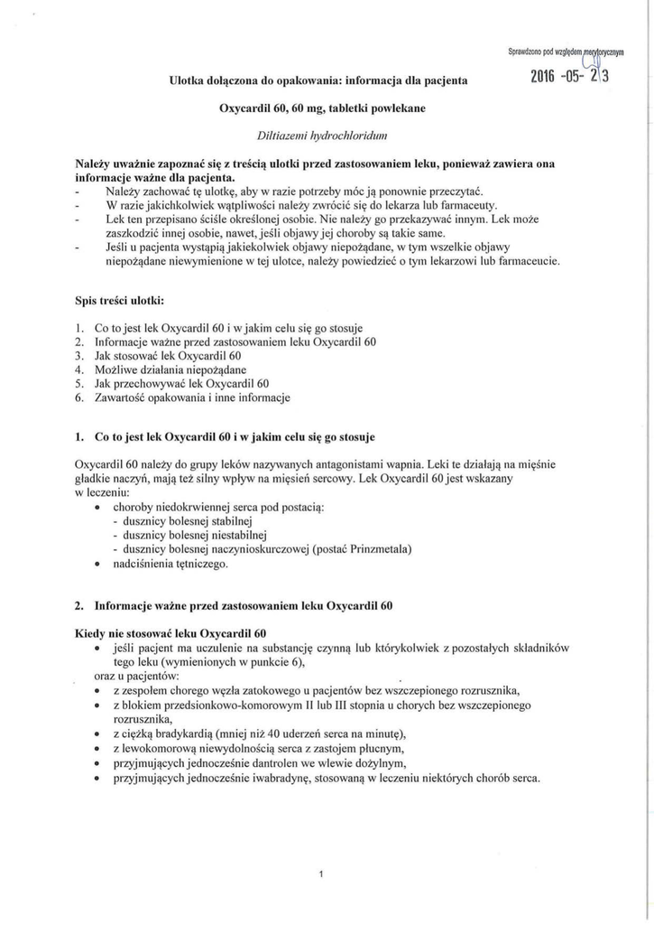 Sprawdzono pod YlZgl~demiJlfryCznym U10tka dol~czona do opalwwania: infOl'macja dla pacjenta 2016 -05-V'2\3 Oxycardil 60,60 mg, tabletki powlekane Diltiazell7i hyd/'ochlo/'idu1l1 Nalezy uwaznie zapoznac sicr z tresci~ ulotld przed zastosowaniem lelm, poniewaz zawiera ona informacje wazne dla pacjenta, NaieZy zachowac ty ulotky, aby w razie potrzeby moe j,! ponownie przeczytac. W razie jakichkolwiek w,!tpliwosci naleZy zwrocic si y do lekarza lub farmaceuty. Lek ten przepisano scisle okreslonej osobie. Nie naleZy go przekazywac innym . Lek moze zaszkodzic innej osobie, nawet, jdli objawy jej choroby S,! takie same. Jesli u pacjenta wyst,!pi,!jakiekolwiek objawy niepoz,!dane, w tym wszelkie objawy niepoz,!dane niewymienione w tej ulotce, naleZy powiedziec 0 tym lekarzowi lub farmaceucie. Spis trdci ulotki: 1. 2. 3. 4. 5. 6. Co to jest lek Oxycardil 60 i w jakim celu si y go stosuje Tnformacje wazne przed zastosowaniem leku Oxycardil 60 Jak stosowac lek Oxycardil60 Mozliwe dzialania niepoz,!dane Jak przechowywac lek Oxycardil 60 Zawartosc opakowania i inne informacje 1. Co to jest lek Oxycardil 60 i w jakim celu sicr go stosuje Oxycardil60 naleZy do gmpy lekow nazywanych antagonistami wapnia. Leki te dzialaj,! na miysnie gladkie naczyn, majl! tei: silny wptyw na miysiell sercowy. Lek Oxycardil 60 jest wskazany w leczeniu: • choroby niedokrwiennej serca pod postacil!: - dusznicy bolesnej stabilnej - dusznicy bolesnej niestabilnej - dusznicy bolesnej naczynioskurczowej (postac Prinzmetala) • nadcisnienia tytniczego. 2, Informacje wazne przed zastosowaniem leku Oxycardil 60 Kiedy nie stosowac lelm Oxycardil 60 • jeSli pacjent ma uczulenie na substancjy czynnl! lub ktorykolwiek z pozostatych sldadnikow tego leku (wymienionych w punkcie 6), oraz u pacjent6w: • z zespolem chorego wyzla zatokowego u pacjentow bez wszczepionego rozrusznika, • z blokiem przedsionkowo-komorowym II lub III stopnia u chorych bez wszczepionego rozrusznika, • z ciyzkl! bradykardil! (mniej niz 40 uderzen serca na minuty), • z lewokomorowl! niewydolnosci,! serca z zastojem plucnym, • przyjmuj,!cych jednoczdnie dantrolen we wlewie dOZylnym , • przyjmuj,!cych jednoczesnie iwabradyny, stosowan,! w leczeniu niektorych chorob serca. Ostrzeienia i srodlti ostroznosci Przed rozpoczyciem stosowania leku Oxycardil 60 naleZy omowie to z lekarzem lub farmaceut~, • w przypadku wyst~pienia zaburzen czynnosci lewej komory serca, bradykardii lub bloku przedsionkowo-komorowego I stopnia naleZy zachowae ostroznose, • w przypadku zastosowania znieczulenia ogolnego naleZy poinformowae lekarza 0 stosowaniu leku Oxycardil 60, gdyz moze on nasilae zaburzenia kurczliwosci, przewodzenia i automatyzmu miysnia sercowego, a takze dzialanie rozszerzaj~ce naczynia krwionosne lekow stosowanych do znieczulenia, • w przypadku pacjentow w podeszlym wieku i pacjentow z niewydolnosci~ nerek lub w~troby mozliwe jest zwiykszenie styzenia diltiazemu w osoczu, dlatego tez pacjenci powinni pozostae pod scisl~ obserwacj~ lekarza; szczcgolnie naleZy kontrolowae Czystose akcji serca, • w przypadku pacjentow, u ktorych wystypuje lyzyko niedroznosci jelit naleZy zachowae ostroznose, gdyz lek Oxycardil 60 hamuje ruchliwose przewodu pokarmowego. Stosowanie leku Oxycardil 60 moze wi~zae siy ze zmianami nastroju, w tym z Stosowanie leku Oxycardil 60 z jedzeniem i piciem Tabletki naleZy przyjmowae bez rozglyzania, przed posilkami, (np. jedna szklanka wody). popijaj~c depresj~. wystarczajilq ilosci~ plynu Ci~za i karmienie piersi~ Jesli pacjentkajest w ci~Zy lub karmi piersi~, przypuszcza ze moze bye w ci~zy lub gdy planuje miee dziecko, powinna poradzie siy lekarza przed zastosowaniem tego leku. Stosowanie leku Oxycardil 60 jest przeciwwskazane w okresie ci~Zy, jak rowniez u kobiet w okresie rozrodczym niestosuj~cych skutecznych metod antykoncepcji. W przypadku koniecznosci stosowania leku Oxycardil 60 u kobiet w czasie laktacji naleZy zastosowae inny sposob karmienia dziecka. Prowadzenie pojazd6w i obslugiwanie maszyn Na podstawie zebranych dzialan niepoz~danych, tj. zawroty glowy (czysto), zle samopoczucie (czysto), zdolnose prowadzenia pojazdow mechanicznych i obslugiwania maszyn moze bye zaburzona, jednak nie przeprowadzono zadnych badan w tym kierunku. Lek Oxycardil 60 a inne leki NaieZy powiedziee lekarzowi 0 wszystkich lekach przyjmowanych przez pacjenta obecnie lub ostatnio, a takze 0 lekach, ktore pacjent planuje stosowae. Oxycardil 60 moze nasilae dzialanie innych lekow przyjmowanych w tym samym czasie. Nalezy poinfol'mowae lekarza, jesli stosuje siy nastypuj~ce leki: • lit - jednoczesne stosowanie z lekiem Oxycardil 60 moze powodowae lyzyko nasilenia dzialania neurotoksycznego litu; • pochodne azotanow - jednoczesne stosowanie z lekiem Oxycardil 60 moze powodowae nasilenie dzialania hipotensyjnego i lyzyko omdlenia (dzialanie rozszerzaj~ce naczynia krwionosne); • teofilina - jednoczesne stosowanie z lekiem Oxycardil 60 moze powodowae zwiykszenie styzenia teofiliny we krwi; • leki blokuj~ce receptOly alfa-adrenergiczne - jednoczesne stosowanie z lekiem Oxycardil 60 antagonistow receptorow alfa-adrenergicznych moze wywolae lub nasi lie niedocisnienie, dlatego stosowanie tego skojarzenia mozna rozwaZye wyl~cznie pod warunkiem scislego monitorowania cisnienia tytniczego; • amiodaron, digoksyna - jednoczesne stosowanie z lekiem Oxycardil 60 moze powodowae zwiykszenie lyzyka wyst~pienia bradykardii, dlatego w trakcie stosowania, zwlaszcza u pacjentow w podeszlym wieku i w przypadku stosowania dUZych dawek, naleZy zachowae ostroznose; • leki blokuj~ce receptOlY beta-adrenergiczne - jednoczesne stosowanie z lekiem Oxycardil 60 moze powodowae zaburzenia lytmu serca (wyraina bradykardia, blok zatokowy), zaburzenia przewodzenia zatokowo-przedsionkowego i przedsionkowo-komorowego oraz niewydolnose serca; 2 • inne leki przeciwatytmiczne - jednoczesne stosowanie z lekiem Oxycardil 60 moze powodowae dodatkowe ryzyko nasilenia dzialan ni