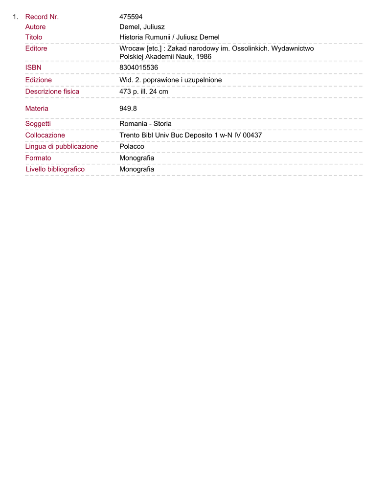 475594 1. Record Nr. Titolo Historia Rumunii / Juliusz Demel