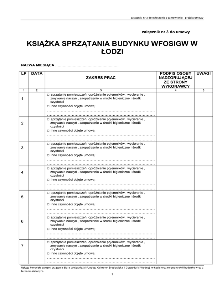 załącznik nr 3 do ogłoszenia o zamówieniu - projekt umowy załącznik nr 3 do umowy KSIĄŻKA SPRZĄTANIA BUDYNKU WFOSIGW W ŁODZI NAZWA MIESIĄCA …………………………………………… LP DATA ZAKRES PRAC 1 2 3 PODPIS OSOBY UWAGI NADZORUJĄCEJ ZE STRONY WYKONAWCY 4 5 □ sprzątanie pomieszczeń, opróżnianie pojemników , wycieranie , 1 zmywanie naczyń , zaopatrzenie w środki higieniczne i środki czystości □ inne czynności objęte umową: ……………………………………………………………………. ……………………………………………………………………. □ sprzątanie pomieszczeń, opróżnianie pojemników , wycieranie , 2 zmywanie naczyń , zaopatrzenie w środki higieniczne i środki czystości □ inne czynności objęte umową: ……………………………………………………………………. ……………………………………………………………………. □ sprzątanie pomieszczeń, opróżnianie pojemników , wycieranie , 3 zmywanie naczyń , zaopatrzenie w środki higieniczne i środki czystości □ inne czynności objęte umową: ……………………………………………………………………. ……………………………………………………………………. □ sprzątanie pomieszczeń, opróżnianie pojemników , wycieranie , 4 zmywanie naczyń , zaopatrzenie w środki higieniczne i środki czystości □ inne czynności objęte umową: ……………………………………………………………………. ……………………………………………………………………. □ sprzątanie pomieszczeń, opróżnianie pojemników , wycieranie , 5 zmywanie naczyń , zaopatrzenie w środki higieniczne i środki czystości □ inne czynności objęte umową: ……………………………………………………………………. ……………………………………………………………………. □ sprzątanie pomieszczeń, opróżnianie pojemników , wycieranie , 6 zmywanie naczyń , zaopatrzenie w środki higieniczne i środki czystości □ inne czynności objęte umową: ……………………………………………………………………. ……………………………………………………………………. □ sprzątanie pomieszczeń, opróżnianie pojemników , wycieranie , 7 zmywanie naczyń , zaopatrzenie w środki higieniczne i środki czystości □ inne czynności objęte umową: ……………………………………………………………………. ……………………………………………………………………. Usługa kompleksowego sprzątania Biura Wojewódzki Fundusz Ochrony Środowiska i Gospodarki Wodnej w Łodzi oraz terenu wokół budynku wraz z terenem zielonym. 1 załącznik nr 3 do ogłoszenia o zamówieniu - projekt umowy □ sprzątanie pomieszczeń, opróżnianie pojemników , wycieranie , 8 zmywanie naczyń , zaopatrzenie w środki higieniczne i środki czystości □ inne czynności objęte umową: ……………………………………………………………………. ……………………………………………………………………. □ sprzątanie pomieszczeń, opróżnianie pojemników , wycieranie , 9 zmywanie naczyń , zaopatrzenie w środki higieniczne i środki czystości □ inne czynności objęte umową: ……………………………………………………………………. ……………………………………………………………………. □ sprzątanie pomieszczeń, opróżnianie pojemników , wycieranie , 10 zmywanie naczyń , zaopatrzenie w środki higieniczne i środki czystości □ inne czynności objęte umową: ……………………………………………………………………. ……………………………………………………………………. □ sprzątanie pomieszczeń, opróżnianie pojemników , wycieranie , 11 zmywanie naczyń , zaopatrzenie w środki higieniczne i środki czystości □ inne czynności objęte umową: ……………………………………………………………………. ……………………………………………………………………. □ sprzątanie pomieszczeń, opróżnianie pojemników , wycieranie , 12 zmywanie naczyń , zaopatrzenie w środki higieniczne i środki czystości □ inne czynności objęte umową: ……………………………………………………………………. ……………………………………………………………………. □ sprzątanie pomieszczeń, opróżnianie pojemników , wycieranie , 13 zmywanie naczyń , zaopatrzenie w środki higieniczne i środki czystości □ inne czynności objęte umową: ……………………………………………………………………. ……………………………………………………………………. □ sprzątanie pomieszczeń, opróżnianie pojemników , wycieranie , 14 15 zmywanie naczyń , zaopatrzenie w środki higieniczne i środki czystości □ inne czynności objęte umową: ……………………………………………………………………. ……………………………………………………………………. □ sprzątanie pomieszczeń, opróżnianie pojemników , wycieranie , zmywanie naczyń , zaopatrzenie w środki higieniczne i środki czystości □ inne czynności objęte umową: 16 ……………………………………………………………………. ……………………………………………………………………. □ sprzątanie pomieszczeń, opróżnianie pojemników , wycieranie , zmywanie naczyń , zaopatrzenie w środki higieniczne i środki czystości □ inne czynności objęte umową: 17 ……………………………………………………………………. ………………………………………………
