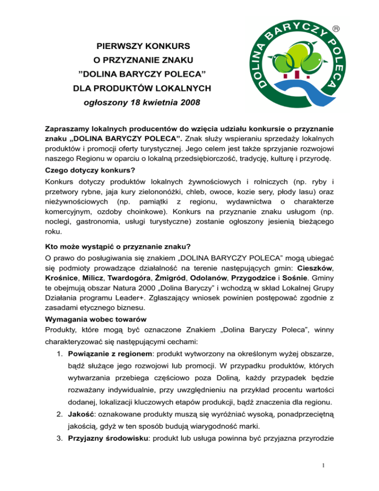PIERWSZY KONKURS O PRZYZNANIE ZNAKU ”DOLINA BARYCZY POLECA” DLA PRODUKTÓW LOKALNYCH ogłoszony 18 kwietnia 2008 Zapraszamy lokalnych producentów do wzięcia udziału konkursie o przyznanie znaku „DOLINA BARYCZY POLECA”. Znak służy wspieraniu sprzedaży lokalnych produktów i promocji oferty turystycznej. Jego celem jest także sprzyjanie rozwojowi naszego Regionu w oparciu o lokalną przedsiębiorczość, tradycję, kulturę i przyrodę. Czego dotyczy konkurs? Konkurs dotyczy produktów lokalnych żywnościowych i rolniczych (np. ryby i przetwory rybne, jaja kury zielononóżki, chleb, owoce, kozie sery, płody lasu) oraz nieżywnościowych (np. pamiątki z regionu, wydawnictwa o charakterze komercyjnym, ozdoby choinkowe). Konkurs na przyznanie znaku usługom (np. noclegi, gastronomia, usługi turystyczne) zostanie ogłoszony jesienią bieżącego roku. Kto może wystąpić o przyznanie znaku? O prawo do posługiwania się znakiem „DOLINA BARYCZY POLECA” mogą ubiegać się podmioty prowadzące działalność na terenie następujących gmin: Cieszków, Krośnice, Milicz, Twardogóra, Żmigród, Odolanów, Przygodzice i Sośnie. Gminy te obejmują obszar Natura 2000 „Dolina Baryczy” i wchodzą w skład Lokalnej Grupy Działania programu Leader+. Zgłaszający wniosek powinien postępować zgodnie z zasadami etycznego biznesu. Wymagania wobec towarów Produkty, które mogą być oznaczone Znakiem „Dolina Baryczy Poleca”, winny charakteryzować się następującymi cechami: 1. Powiązanie z regionem: produkt wytworzony na określonym wyżej obszarze, bądź służące jego rozwojowi lub promocji. W przypadku produktów, których wytwarzania przebiega częściowo poza Doliną, każdy przypadek będzie rozważany indywidualnie, przy uwzględnieniu na przykład procentu wartości dodanej, lokalizacji kluczowych etapów produkcji, bądź znaczenia dla regionu. 2. Jakość: oznakowane produkty muszą się wyróżniać wysoką, ponadprzeciętną jakością, gdyż w ten sposób budują wiarygodność marki. 3. Przyjazny środowisku: produkt lub usługa powinna być przyjazna przyrodzie 1 i wypełniać prawne standardy ochrony środowiska – na każdym etapie produkcji i dystrybucji. Pożądane jest, by pomagały chronić przyrodę regionu. 4. Wyjątkowość produktu, zwłaszcza, jeśli wynika z jego związku z regionem, np.: wykorzystanie tradycyjnych metod produkcji i lokalnych surowców, wyrób rękodzielniczy. 5. Bezpieczeństwo dla ludzi i środowiska: spełniają wymogi jakościowe i normy bezpieczeństwa dla danej grupy wyrobów w świetle aktualnie obowiązujących przepisów, nie zawierają substancji uznanych za szkodliwe dla ludzi. 6. Dostępność: produkt powinien być regularnie dostępny w regionie, z uwzględnieniem specyfiki cyklu produkcyjnego i oferty sezonowej. 7. Rozpoznawalność: produkt powinien być kojarzony z konkretnym wytwórcą. 8. Tradycyjność: przynajmniej roczna obecność producenta i produktu na rynku przed złożeniem wniosku. Prawo użytkowania (licencja) Znaku „DOLINA BARYCZY POLECA” przyznawane jest przez Kapitułę Znaku na okres jednego roku. Zasady funkcjonowania konkursu są zawarte w regulaminie konkursu (dostępny w biurze Fundacji Doliny Baryczy), na którym oparty jest niniejszy komunikat. Szczegółowe zasady posługiwania się Znakiem Marki Doliny Baryczy są zostaną określone w umowie licencyjnej na używanie znaku. Korzyści dla producentów Znak „DOLINA BARYCZY POLECA” nie tylko będzie promowany przez Fundację Doliny Baryczy, ale przede wszystkim przez wysokiej jakości, atrakcyjne produktu nim oznakowane. Użytkownicy znaku „DOLINA BARYCZY POLECA” będą korzystali z rozmaitych form promocji. Informacja o oznakowanym produkcie będzie umieszczana w materiałach promocyjnych i drukach reklamowych, w tym w katalogu produktów i usług Doliny Baryczy. Fundacja będzie promować oznakowane produkty m.in. na stronie internetowej www.barycz.pl, na targach i jarmarkach. Opłaty: 1. Opłatę administracyjną, przeznaczoną na sfinansowanie procesu oceny wniosków, uiszcza składający wniosek w konkursie i w roku 2008 wynosi ona 50 zł. Opłata administracyjna nie ulega zwrotowi. Nie jest pobierana przy przedłużaniu umowy licencyjnej. 2. Opłatę licencyjną, przeznaczoną na funkcjonowanie systemu marki Doliny Baryczy, w tym promocji znaku, uiszcza użytkownik raz na rok podpisując umowę licencyjną i w roku 2008 wynosi ona 200 zł. W uzasadnionych przypadkach (np. mała skala produkcji) istnieje możliwość obniżenia opłaty licencyjnej na wniosek producenta. 2 Składanie wniosków w konkursie dla produktów lokalnych 1. Wnioski będą przyjmowane do dnia 31 maja 2008 w siedzibie Fundacji Doliny Baryczy, Trzebnicka 4b w Miliczu. Wnioski można przysyłać pocztą, o ważności zgłoszenia decyduje termin dotarcia przesyłki. 2. Wnioski o przyznanie prawa użytkowania Znaku Marki Doliny Baryczy składa się na formularzu dostępnym w Biurze Fundacji Doliny Baryczy i na www.barycz.pl. Wyniki konkursu zostaną ogłoszone do dnia 30 czerwca 2008 w prasie lokalnej, mediach i na stronie internetowej www.barycz.pl. Więcej informacji: Fundacja Doliny Baryczy, Trzebnicka 4b, 56-300 Milicz, tel./faks 71 383 0432 Dorota Chmielowiec-Tyszko tel. 608 503 038, Iwona Grobelna tel. 693 104 670 3