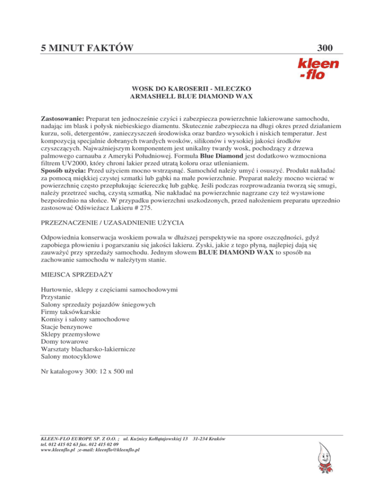 5 MINUT FAKTÓW 300 WOSK DO KAROSERII - MLECZKO ARMASHELL BLUE DIAMOND WAX Zastosowanie: Preparat ten jednocze nie czy ci i zabezpiecza powierzchnie lakierowane samochodu, nadaj c im blask i połysk niebieskiego diamentu. Skutecznie zabezpiecza na długi okres przed działaniem kurzu, soli, detergentów, zanieczyszcze rodowiska oraz bardzo wysokich i niskich temperatur. Jest kompozycj specjalnie dobranych twardych wosków, silikonów i wysokiej jako ci rodków czyszcz cych. Najwa niejszym komponentem jest unikalny twardy wosk, pochodz cy z drzewa palmowego carnauba z Ameryki Południowej. Formuła Blue Diamond jest dodatkowo wzmocniona filtrem UV2000, który chroni lakier przed utrat koloru oraz utlenianiem. Sposób u ycia: Przed u yciem mocno wstrz sn . Samochód nale y umy i osuszy . Produkt nakłada za pomoc mi kkiej czystej szmatki lub g bki na małe powierzchnie. Preparat nale y mocno wciera w powierzchni cz sto przepłukuj c ciereczk lub g bk . Je li podczas rozprowadzania tworz si smugi, nale y przetrze such , czyst szmatk . Nie nakłada na powierzchnie nagrzane czy te wystawione bezpo rednio na sło ce. W przypadku powierzchni uszkodzonych, przed nało eniem preparatu uprzednio zastosowa Od wie acz Lakieru # 275. PRZEZNACZENIE / UZASADNIENIE U YCIA Odpowiednia konserwacja woskiem powala w dłu szej perspektywie na spore oszcz dno ci, gdy zapobiega płowieniu i pogarszaniu si jako ci lakieru. Zyski, jakie z tego płyn , najlepiej daj si zauwa y przy sprzeda y samochodu. Jednym słowem BLUE DIAMOND WAX to sposób na zachowanie samochodu w nale ytym stanie. MIEJSCA SPRZEDA Y Hurtownie, sklepy z cz ciami samochodowymi Przystanie Salony sprzeda y pojazdów niegowych Firmy taksówkarskie Komisy i salony samochodowe Stacje benzynowe Sklepy przemysłowe Domy towarowe Warsztaty blacharsko-lakiernicze Salony motocyklowe Nr katalogowy 300: 12 x 500 ml KLEEN-FLO EUROPE SP. Z O.O. ; ul. Ku nicy Kołł tajowskiej 13 31-234 Kraków tel. 012 415 02 63 fax. 012 415 02 09 www.kleenflo.pl ;e-mail: [email protected]