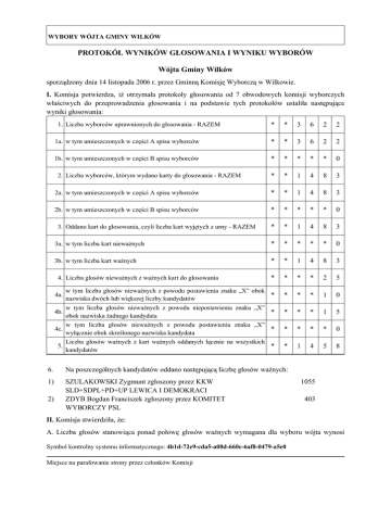 PROTOKÓŁ WYNIKÓW GŁOSOWANIA I WYNIKU WYBORÓW Wójta