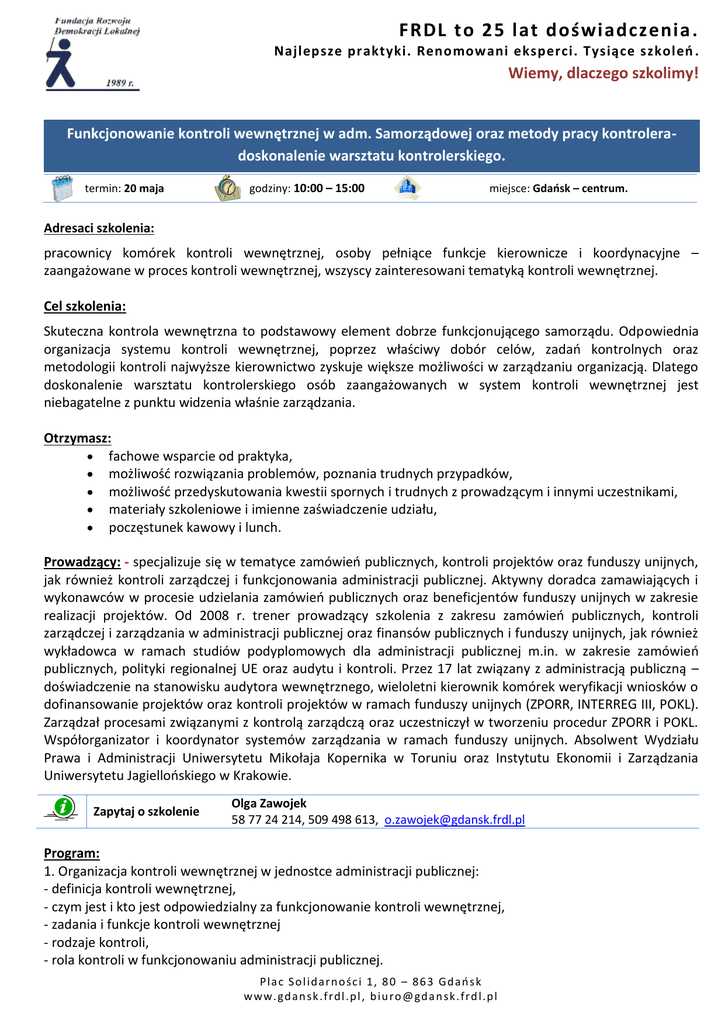 FRDL to 25 lat doświadczenia . Najlepsze praktyki. Renomowani eksperci. Tysiące szkoleń . Wiemy, dlaczego szkolimy! Funkcjonowanie kontroli wewnętrznej w adm. Samorządowej oraz metody pracy kontroleradoskonalenie warsztatu kontrolerskiego. termin: 20 maja godziny: 10:00 – 15:00 miejsce: Gdańsk – centrum. Adresaci szkolenia: pracownicy komórek kontroli wewnętrznej, osoby pełniące funkcje kierownicze i koordynacyjne – zaangażowane w proces kontroli wewnętrznej, wszyscy zainteresowani tematyką kontroli wewnętrznej. Cel szkolenia: Skuteczna kontrola wewnętrzna to podstawowy element dobrze funkcjonującego samorządu. Odpowiednia organizacja systemu kontroli wewnętrznej, poprzez właściwy dobór celów, zadań kontrolnych oraz metodologii kontroli najwyższe kierownictwo zyskuje większe możliwości w zarządzaniu organizacją. Dlatego doskonalenie warsztatu kontrolerskiego osób zaangażowanych w system kontroli wewnętrznej jest niebagatelne z punktu widzenia właśnie zarządzania. Otrzymasz: fachowe wsparcie od praktyka, możliwość rozwiązania problemów, poznania trudnych przypadków, możliwość przedyskutowania kwestii spornych i trudnych z prowadzącym i innymi uczestnikami, materiały szkoleniowe i imienne zaświadczenie udziału, poczęstunek kawowy i lunch. Prowadzący: - specjalizuje się w tematyce zamówień publicznych, kontroli projektów oraz funduszy unijnych, jak również kontroli zarządczej i funkcjonowania administracji publicznej. Aktywny doradca zamawiających i wykonawców w procesie udzielania zamówień publicznych oraz beneficjentów funduszy unijnych w zakresie realizacji projektów. Od 2008 r. trener prowadzący szkolenia z zakresu zamówień publicznych, kontroli zarządczej i zarządzania w administracji publicznej oraz finansów publicznych i funduszy unijnych, jak również wykładowca w ramach studiów podyplomowych dla administracji publicznej m.in. w zakresie zamówień publicznych, polityki regionalnej UE oraz audytu i kontroli. Przez 17 lat związany z administracją publiczną – doświadczenie na stanowisku audytora wewnętrznego, wieloletni kierownik komórek weryfikacji wniosków o dofinansowanie projektów oraz kontroli projektów w ramach funduszy unijnych (ZPORR, INTERREG III, POKL). Zarządzał procesami związanymi z kontrolą zarządczą oraz uczestniczył w tworzeniu procedur ZPORR i POKL. Współorganizator i koordynator systemów zarządzania w ramach funduszy unijnych. Absolwent Wydziału Prawa i Administracji Uniwersytetu Mikołaja Kopernika w Toruniu oraz Instytutu Ekonomii i Zarządzania Uniwersytetu Jagiellońskiego w Krakowie. Zapytaj o szkolenie Olga Zawojek 58 77 24 214, 509 498 613, [email protected] Program: 1. Organizacja kontroli wewnętrznej w jednostce administracji publicznej: - definicja kontroli wewnętrznej, - czym jest i kto jest odpowiedzialny za funkcjonowanie kontroli wewnętrznej, - zadania i funkcje kontroli wewnętrznej - rodzaje kontroli, - rola kontroli w funkcjonowaniu administracji publicznej. Pla c S ol id ar n o śc i 1, 8 0 – 86 3 Gd ań s k w w w. gd an sk .f rd l .p l , b iu ro @gd a n sk. frd l.p l 2. System kontroli wewnętrznej w jednostce administracji publicznej: - kontrola wewnętrzna a audyt wewnętrzny, - kontrola wewnętrzna a kontrola zarządcza, - kontrola wewnętrzna w jednostce wdrażającej projektowe lub jakościowe systemy zarządzania. 3. Doskonalenie warsztatu kontrolerskiego: - kompetencje kontrolera, - planowanie zadań kontrolnych, - etapy procesu kontroli, - techniki pozyskiwania informacji i dokumentów, - wykorzystanie wsparcia ekspertów w kontroli wewnętrznej, - pojęcie dowodu oraz ocena wiarygodności dowodu, - dokumentowanie ustaleń kontroli, - komunikowanie wyników kontroli, - zasada kontradyktoryjności w systemach kontroli, - zalecenia, rekomendacje, uwagi – kształtowanie oraz metody monitorowania, - wykorzystanie wyników kontroli wewnętrznej do budowania potencjału organizacyjnego jednostki. 4. Zarządzanie ryzykiem w jednostce a ryzyko kontroli wewnętrznej. 5. Ocena oraz badanie skuteczności systemów kontroli wewnętrznej. 6. Komunikacja w pracy kontrolera wewnętrznego: - komunikacja wewnętrzna i zewnętrzna, - język komunikacji, - zakłócenia w komunikacji i metody ich eliminowania, - budowanie relacji z kontrolowanym, - sztuka zadawania pytań i prowadzenia rozmów z kontrolowanym, 7. Etyka w kontroli. WYŚLIJ ZGŁOSZENIE DO: 13.05.2016r, 15:00 [email protected] 58 550 32 39 FORMULARZ ZGŁOSZENIOWY: Funkcjonowanie kontroli wewnętrznej w adm. Samorządowej oraz metody pracy kontroleradoskonalenie warsztatu kontrolerskiego. 20 maja 2016r. Nazwa Instytucji/Firmy (dane do FV): Adres: NIP: Telefon: Faks: 1. Imię, nazwisko , stanowisko e-mail Imię, nazwisko , stanowisko e-mail 2. Cena netto: 399,89zł TAK / NIE 339,90zł TAK / NIE Zgłoszenie w terminie do 06 maja 2016r. Dla kolejnej osoby zgłoszonej z tej samej instytucji 10% rabatu Udział w szkoleniu jest finansowane przynajmniej w 70 % ze środków publicznych Należność należy zapłacić przelewem po szkoleniu po otrzymaniu faktury VAT TAK / NIE TAK / NIE Zgodnie z Ust. o Ochronie Danych Osobowych z dnia 29.08.1997 r. wyrażam zgodę na przetwarzanie moich danych osobowych dla potrzeb działalności szkoleniowej FRDL Brak pisemnej rezygnacji ze szkolenia na 5 dni przed terminem będzie równoznaczny z obciążeniem Państwa 50 % kosztów ogólnych. Data: Podpis: Uwaga! Braku kontaktu ze strony FRDL minimum 2 dni przed terminem szkolenia może oznaczać, że karta zgłoszeniowa nie dotarła. W takim przypadku prosimy o kontakt telefoniczny lub mailowy: 58 772 42 14, [email protected] Pla c S ol id ar n o śc i 1, 8 0 – 86 3 Gd ań s k w w w. gd an sk .f rd l .p l , b iu ro @gd a n sk. frd l.p l