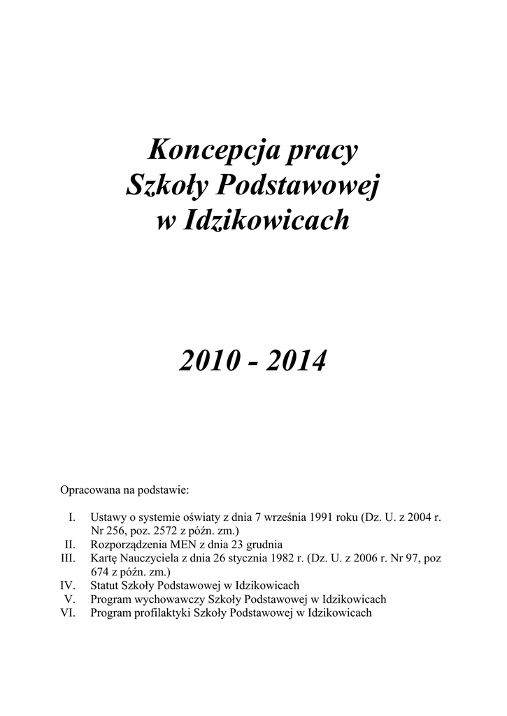 Koncepcja pracy Szkoły Podstawowej w Idzikowicach 2010 - 2014 Opracowana na podstawie: I. II. III. IV. V. VI. Ustawy o systemie oświaty z dnia 7 września 1991 roku (Dz. U. z 2004 r. Nr 256, poz. 2572 z późn. zm.) Rozporządzenia MEN z dnia 23 grudnia Kartę Nauczyciela z dnia 26 stycznia 1982 r. (Dz. U. z 2006 r. Nr 97, poz 674 z późn. zm.) Statut Szkoły Podstawowej w Idzikowicach Program wychowawczy Szkoły Podstawowej w Idzikowicach Program profilaktyki Szkoły Podstawowej w Idzikowicach I. Cel priorytetowy szkoły Tworzenie w szkole systemu gwarantującego wysoką jakość pracy ukierunkowanej na wszechstronny rozwój ucznia i rozwój zawodowy nauczyciela II. Główne cele szkoły 1. Tworzenie warunków do samodzielnego zdobywania wiedzy, świadomego uczenia się i rozwijania własnych zainteresowań uczniów. Przygotowanie ich do aktywnego udziału w życiu społecznym. Realizacja celu nastąpi poprzez: 1) System diagnozy osiągnięć uczniów za pomocą testów zewnętrznych. 2) Wewnętrzny system diagnozowania własnymi narzędziami badawczymi. Wdrażanie działań dydaktycznych na podstawie wniosków z dotychczasowych działań. 3) Ewaluacja i analiza wyników egzaminów zewnętrznych. 4) Zróżnicowanie oferty zajęć dodatkowych szkoły w celu umożliwienia rozwijania zdolności i zainteresowań uczniów. 5) Tworzenie programów własnych lub taki wybór programu, który zapewni każdemu uczniowi ciągły postęp i sukces. 6) Systematyczna analiza i weryfikacja treści nauczania pod kątem realizacji podstawy programowej. 7) Stosowanie nowatorskich form i metod pracy. 8) Indywidualizacja nauczania. 9) Dostosowanie treści programowych dla uczniów o specjalnych potrzebach edukacyjnych. 10) Organizowanie zajęć wyrównawczych z poszczególnych przedmiotów dla uczniów o specjalnych potrzebach edukacyjnych. 11) Motywowanie uczniów do rozwijania własnych zainteresowań i uzdolnień. 12) Systematyczne uczestnictwo uczniów w konkursach przedmiotowych i zawodach sportowych na różnym szczeblu. 13) Doskonalenie umiejętności efektywnej pracy w zespole. 14) Promowanie osiągnięć uczniów. 2 2. Promowanie bezpiecznego i zdrowego stylu życia . Przeciwdziałanie zagrożeniom, złu, patologii. Realizacja celu nastąpi poprzez: 1) Udział rodziców w planowaniu pracy wychowawczej szkoły 2) Organizowanie pogadanek dla uczniów i rodziców z udziałem specjalistów. 3) Integrowanie uczniów w zespołach klasowych i w całej szkole poprzez organizację imprez i uroczystości szkolnych, wyjazdów. 4) Doskonalenie umiejętności wychowawczych rodziców uczniów – umożliwienie udziału w warsztatach „Trening umiejętności wychowawczych”. 3. Tworzenie klimatu sprzyjającego efektywnej pracy uczniów, nauczycieli, pracowników obsługi, dyrektora szkoły. Realizacja celu nastąpi poprzez: Dbałość o przestrzeganie praw ucznia i dziecka Samorządność uczniów w organizacji imprez i uroczystości szkolnych Udział rodziców w planowaniu imprez środowiskowych Przyznawanie nagród uczniom, nauczycielom, pracownikom obsługi zgodnie z przyjętymi zasadami. 5) Możliwość wprowadzania innowacji pedagogicznych, sytuacyjnych. 6) Inspirowanie i wspieranie rozwoju zawodowego nauczycieli. 1) 2) 3) 4) 4. Promocja szkoły wewnątrz na zewnątrz. Współpraca z rodzicami i ze środowiskiem lokalnym. 1) Współpraca z Tygodnikiem Opoczyńskim – przekazywanie informacji na temat szkolnych działań 2) Prowadzenie strony internetowej szkoły – www.spidzikowice.tvcc.pl 3) Wydawanie gazetki szkolnej. 4) Udział w WOŚP połączony z wystawieniem Jasełek – dla środowiska lokalnego. 5) Wystawienie Jasełek w kościele parafialnym w Libiszowie. 3 6) Organizacja „Pikniku Rodzinnego” we współpracy z Radą Rodziców. Działalność edukacyjna szkoły określona jest przez: 1. Szkolny zestaw programów nauczania, który obejmuje całą działalność szkoły z punktu widzenia dydaktycznego uwzględniając wymiar wychowawczy. 2. Statut szkoły wraz z załącznikami. 3. Program wychowawczy szkoły opisuje w całościowy wszystkie treści i działania o charakterze wychowawczym i jest realizowany przez wszystkich nauczycieli. 4. Program profilaktyki. III. Wizja Jesteśmy szkołą propagującą humanistyczny system wartości. Proponujemy nowoczesne metody nauczania, dostosowane do potrzeb współczesnego świata. Zapewniamy wysoki poziom przekazywanej wiedzy, opiekę wykwalifikowanej kadry, dostęp do najnowszych zdobyczy techniki, ciekawe i różnorodne zajęcia. Jesteśmy szkołą bezpieczną, wolną od patologii i uzależnień. Wszystkie działania nauczycieli i uczniów w szkole prowadzą do osiągnięcia ideału. Absolwent naszej szkoły bardzo dobrze funkcjonuje w swoim naturalnym środowisku: w domu i w szkole. Pozytywnie patrzy na otaczający świat, siebie i innych ludzi. Traktuje naukę jako coś oczywistego i atrakcyjnego. Ma określony dość szeroki krąg zainteresowań, którym poświęca swój czas, i które stara się rozwijać. UCZEŃ NASZEJ SZKOŁY Jest otwarty. Wykorzystuje możliwości, jakie stwarza mu dom i szkoła. Chętnie nawiązuje komunikację, prezentując swój punkt widzenia i rozważając poglądy innych. W grupie potrafi działać zgodnie z obowiązującymi w niej zasadami. Jest odpowiedzialny. Stara się przewidzieć skutki swoich działań i gotów jest ponosić konsekwencje swoich czynów. Cieszy się z sukcesów. Akceptuje porażki. Napotykając na problem stara się go rozwiązać. Działając w grupie poczuwa się do współodpowiedzialności za efekty jej aktywności. Jest ciekawy świata. Chętnie gromadzi wiadomości korzystając z różnych źródeł. Dostrzega złożoność świata. Stara się poszerzać swoją wiedzę. 4 Jest krytyczny. Potrafi selekcjonować i porządkować zdobywane informacje i oceniać ich przydatność. Jest rozważny. Zna zagrożenia związane z życiem w swoim środowisku. Potrafi zapewnić bezpieczeństwo sobie i i